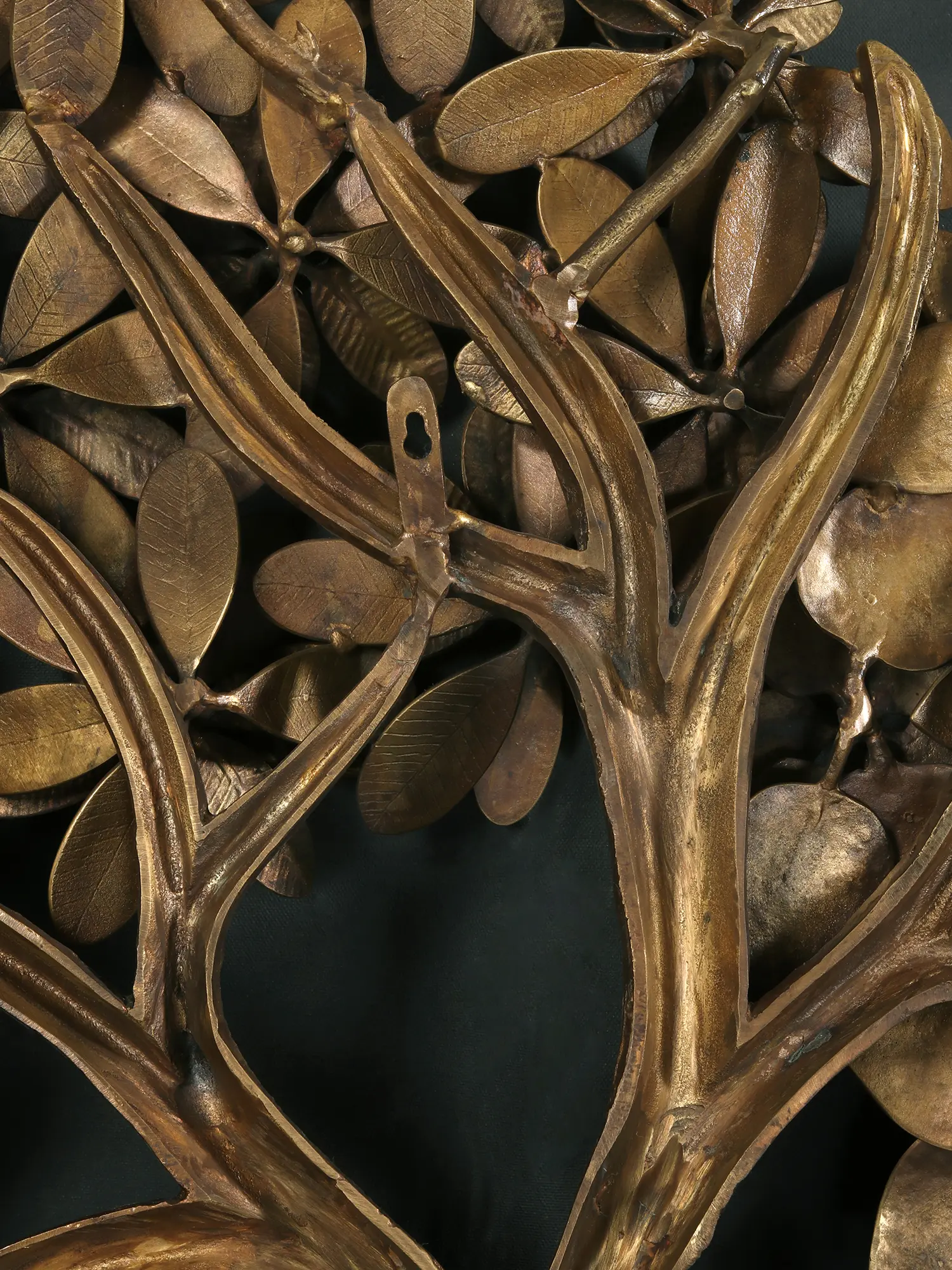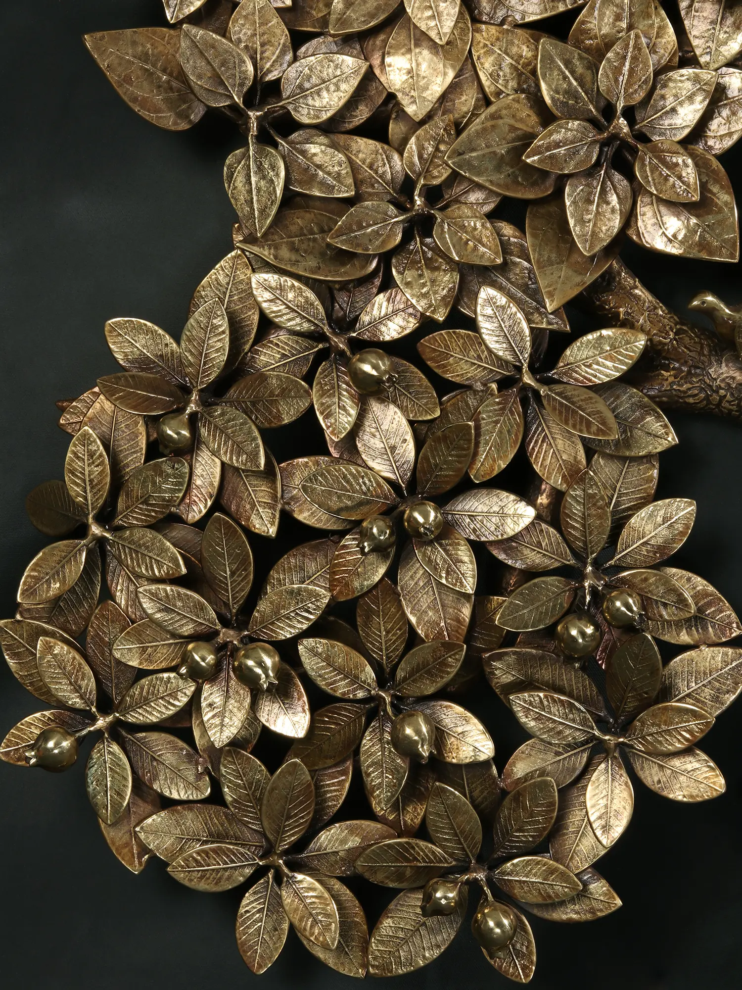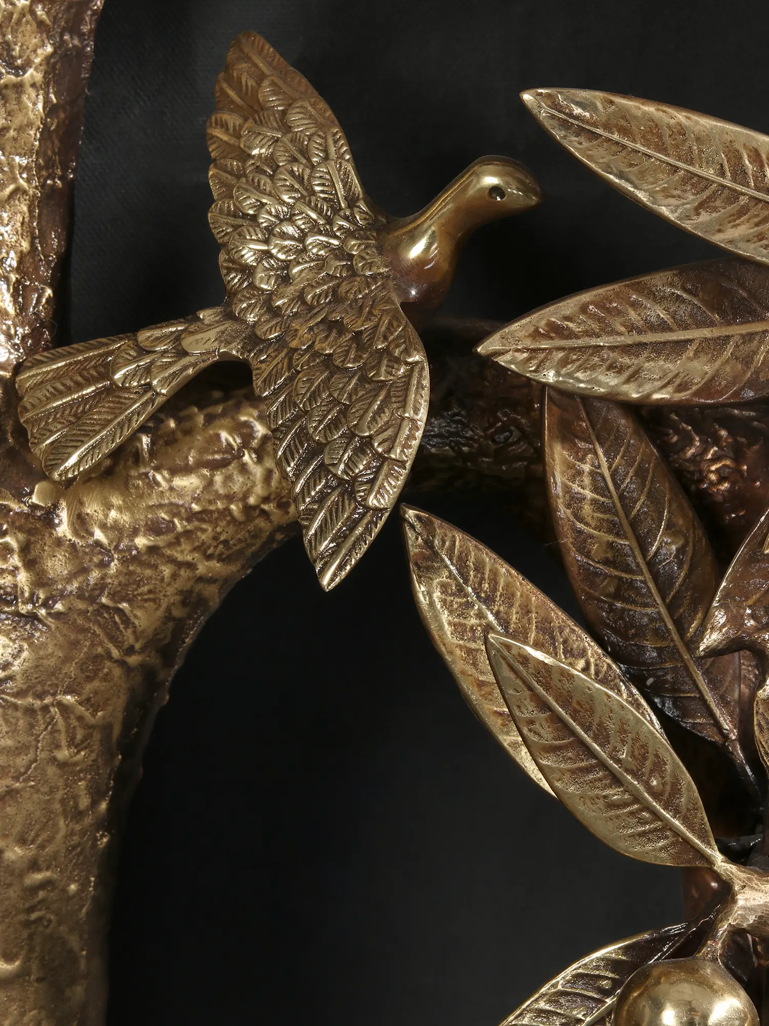 Plants have their own auspicious space in Hindu culture. Some plants are regarded to be an essential element of any ceremony. Mango (Amra Pallava), Peepal (Aswatha), Banyan (Vata), Plumeria (Gour Champa), and Pomegranate (Anar) leaves have religious significance and are used as offerings to deities. This brass tree embodies all of the auspiciousness carried by the other five trees. Beautiful birds sit on the trees, symbolizing nature's peaceful atmosphere. The presence of two cranes walking gently around the tree adds to the piece's charm. This entire tree is a sign of peaceful growth and wealth.