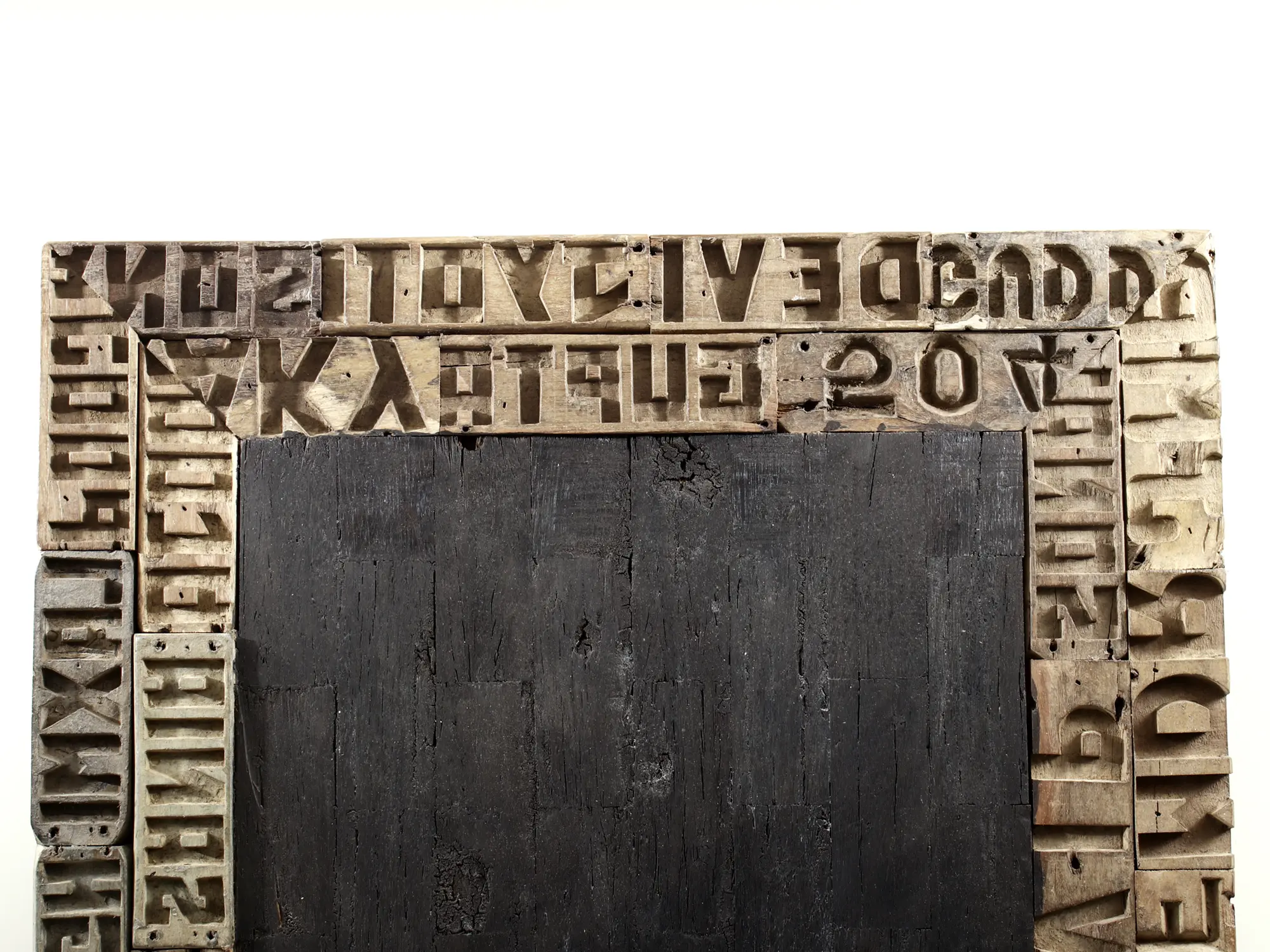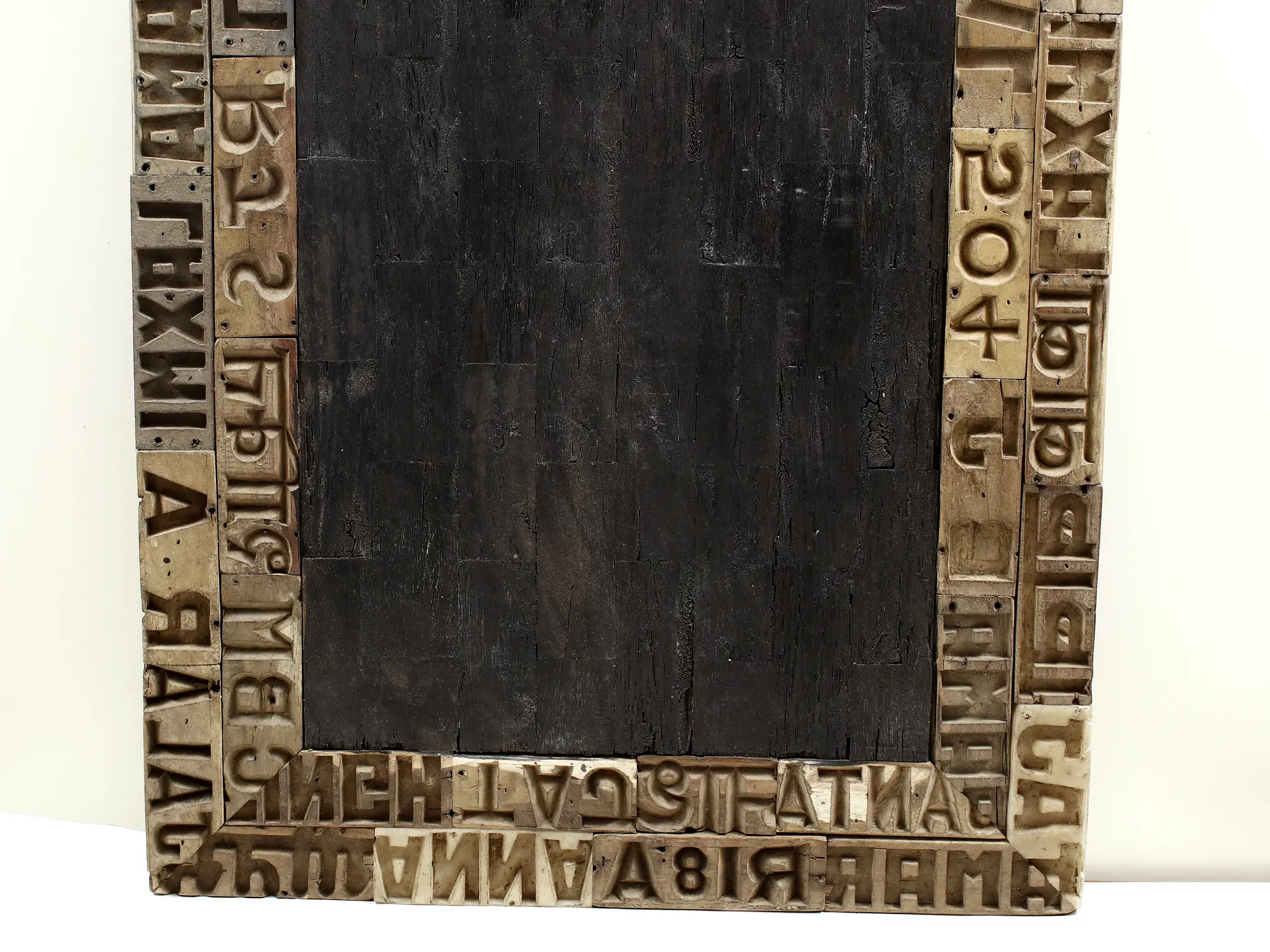 The true magic of this piece lies in its border. Composed of individual wooden blocks, each meticulously carved with raised letters and numbers, it creates a visually rich and textured frame. These blocks, reminiscent of vintage printing press type, are arranged to form a continuous, eye-catching pattern. The aged patina and subtle imperfections of the wood lend an undeniable vintage character, hinting at stories and journeys from a bygone era. Whether the arrangement spells out a specific phrase or simply forms an abstract textual tapestry, it adds a layer of intellectual and aesthetic depth to the overall design. The play of light and shadow across the raised characters further enhances its dimensionality and visual appeal, making it a dynamic addition to your wall.