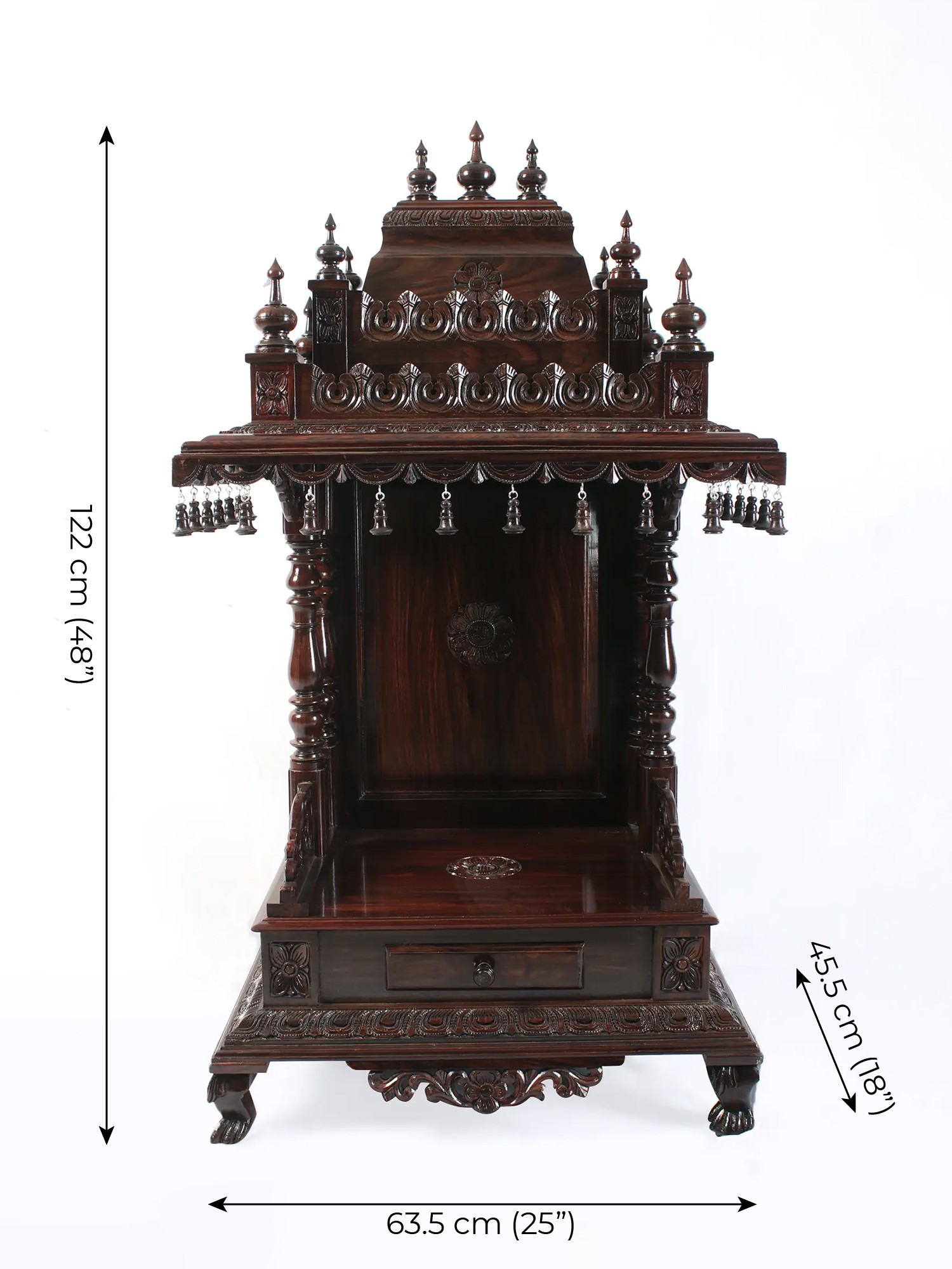 Crafted from high-quality wood, this temple is built to last for generations. The robust construction and sturdy base guarantee stability and durability, ensuring that this piece will remain a cherished heirloom for years to come. The rich dark wood finish is both aesthetically pleasing and highly resistant to wear and tear, preserving the beauty of the temple for many years. Simple, yet effective, cleaning will maintain the high-quality polish and luster. Regular polishing with wood polish will enhance the beauty and shine of your temple.