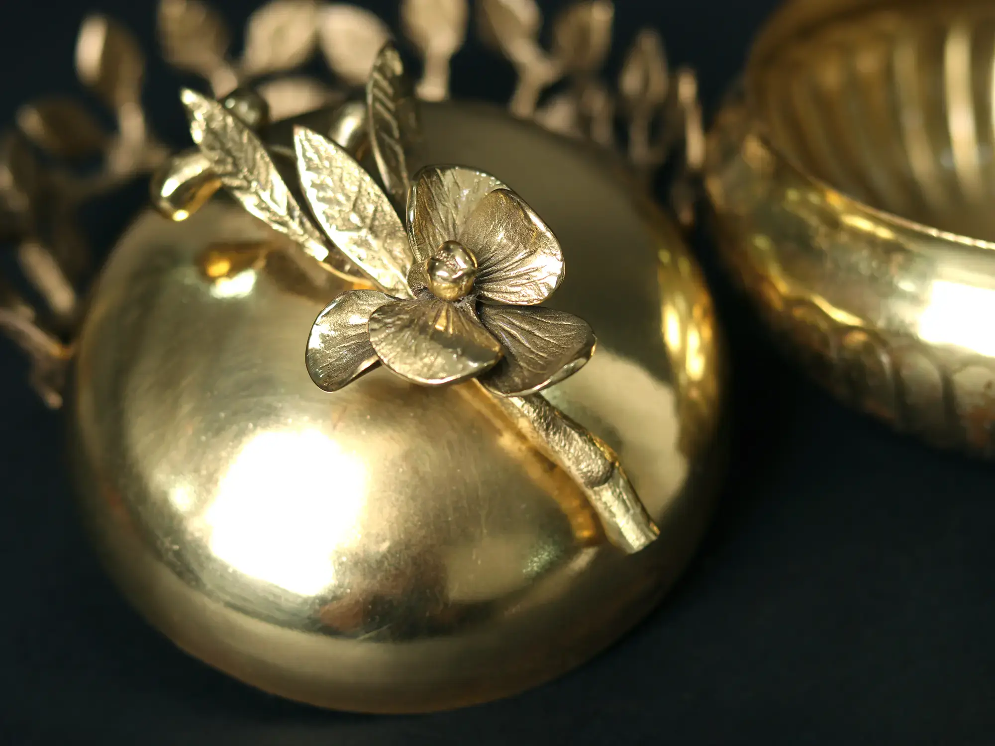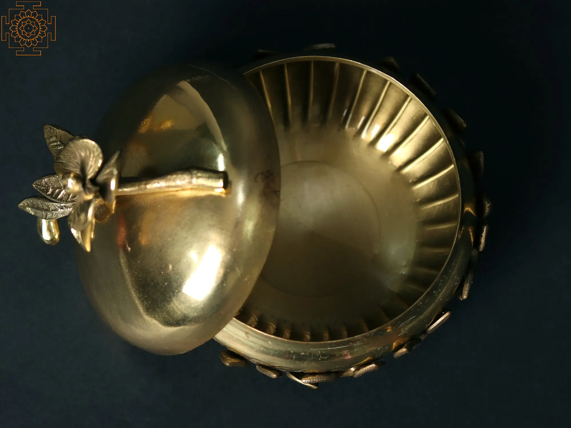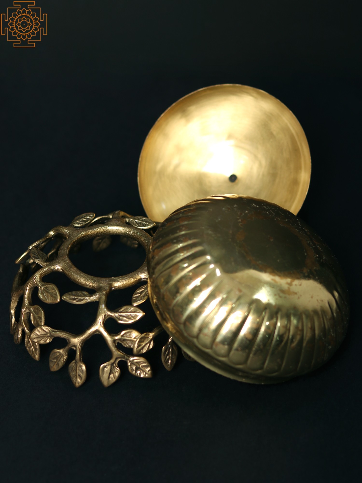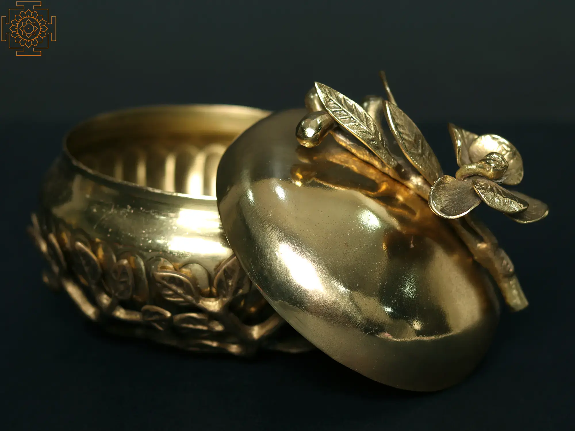 This practical item, known as a Brass Bowl with Leaf Base Stand, symbolizes nature's beauty in creative form. This item comes in a set of three, with the primary container having a classic circular form, the base of the leaf design resembling a crown, and the final cover having a handle of a branch with flowers. From a distance, the dazzling brass bowl of this dish appears to be a ball of molten gold. Each curve and form tell a story of handmade skill, demonstrating the harmonious balance of nature-inspired design and time-honored craftsmanship. This exquisite masterpiece not only adds regal attractiveness to any environment but also serves as a vehicle for functionality most suited to royal people.