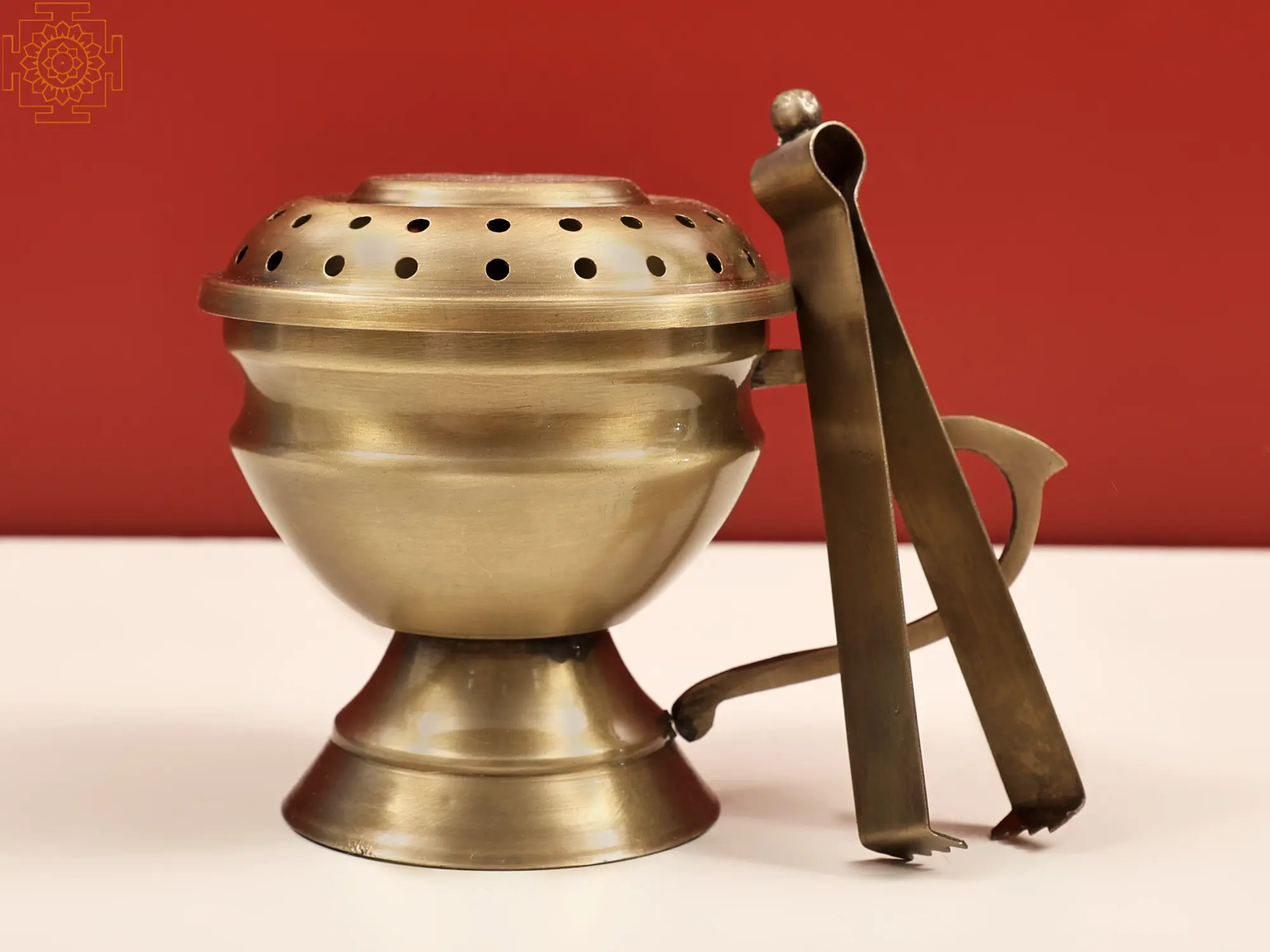 Choose the traditions of over a century in from of this Brass Dhuna with Tongs, a contemporary dhoop danhi (incense burner) and enhance your spiritual journey. The Dhuna carries the traditional form of a vessel with a beautiful handle and a beveled bottom. The lid has some punched-in holes whereas the tongs are used to place the dhoop into container. The lid has perforations that are strategically placed for the dhoop smoke to flow gently and fill in the room with a soothing atmosphere. Experience the rituals and aroma of divinity with this authentic and sophisticated Dhoop Dani which is a proof of the eternity of the ancient customs.