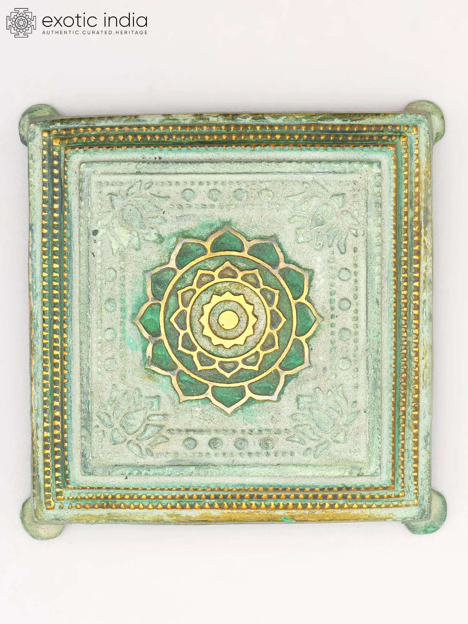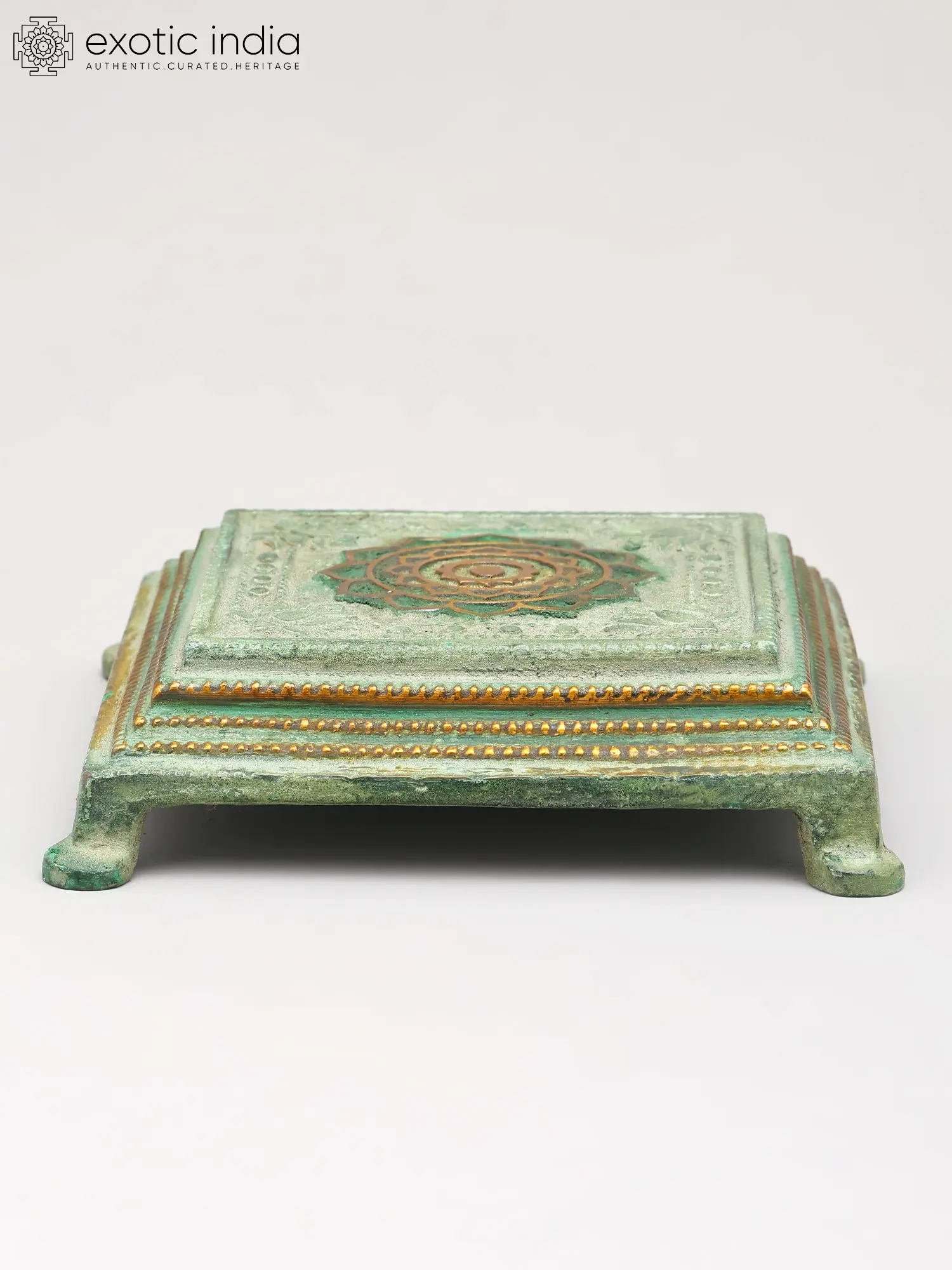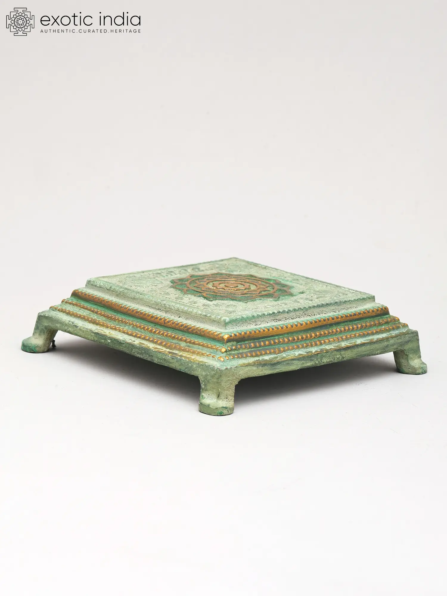 The surface of this pedestal is adorned with a captivating Yantra, a sacred geometric design, rendered in exquisite detail. Delicate floral motifs and decorative borders encircle the central emblem, creating a visually harmonious composition. The subtle, aged green patina, interspersed with highlights of polished brass, adds depth and character, inviting closer inspection of its refined artistry. Measuring 1.2 inches in height, this 5-inch square platform offers ample surface area without overwhelming your display.