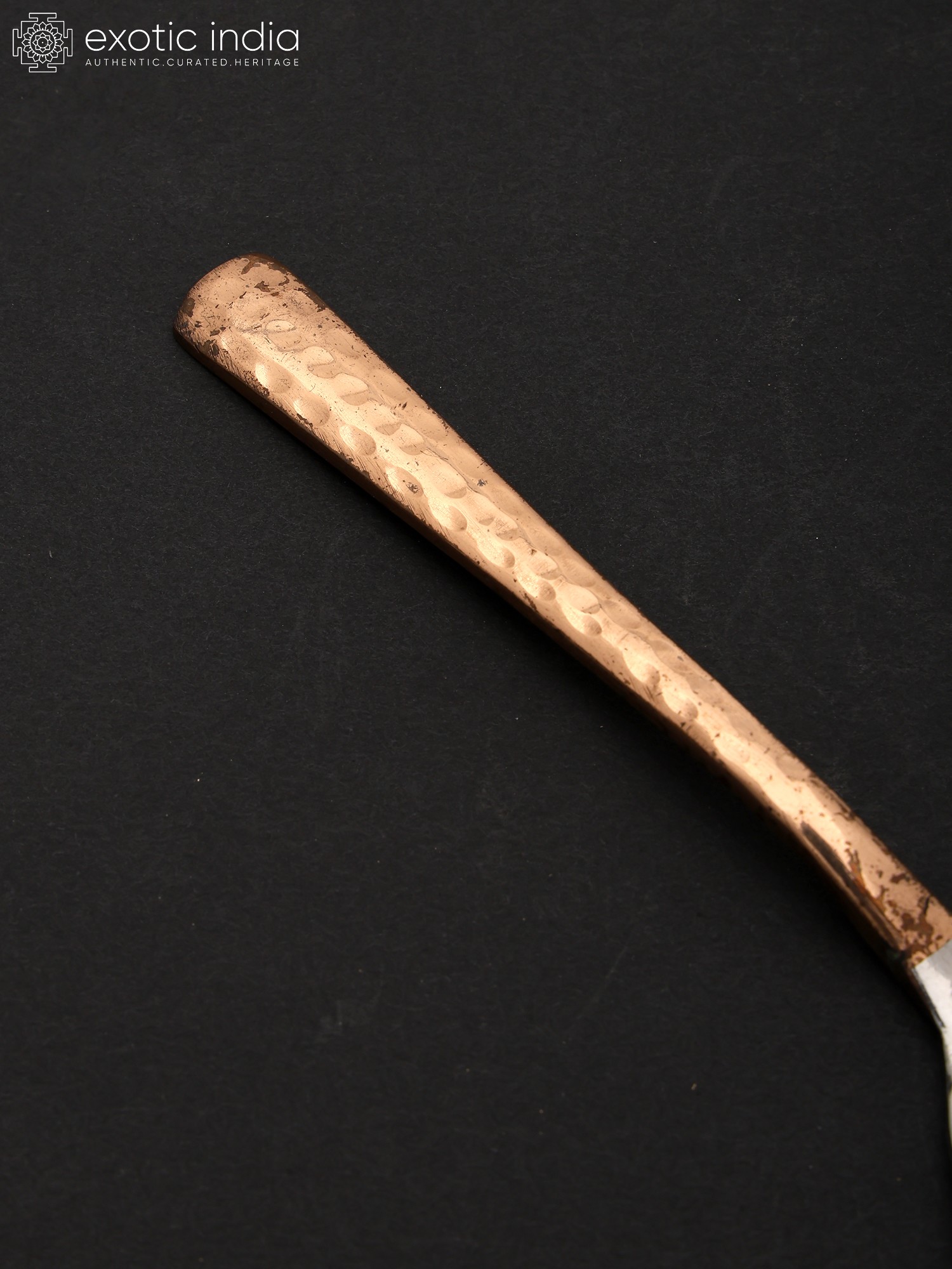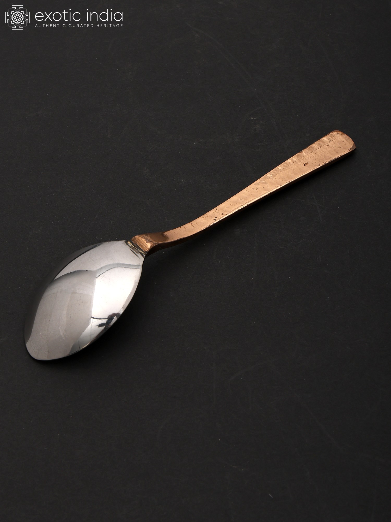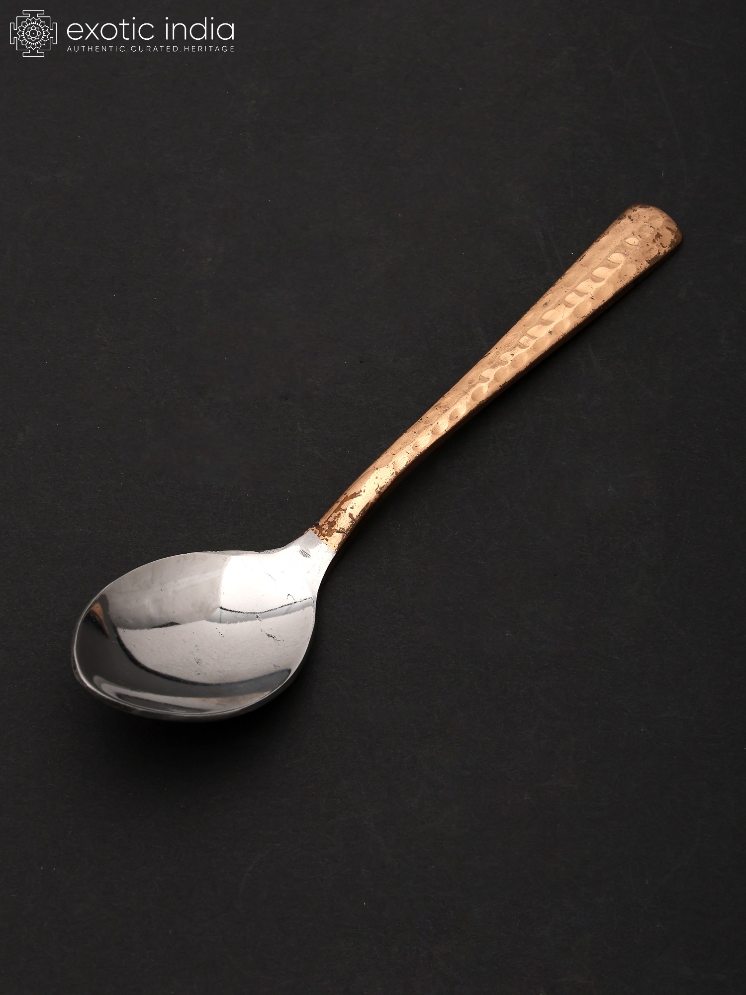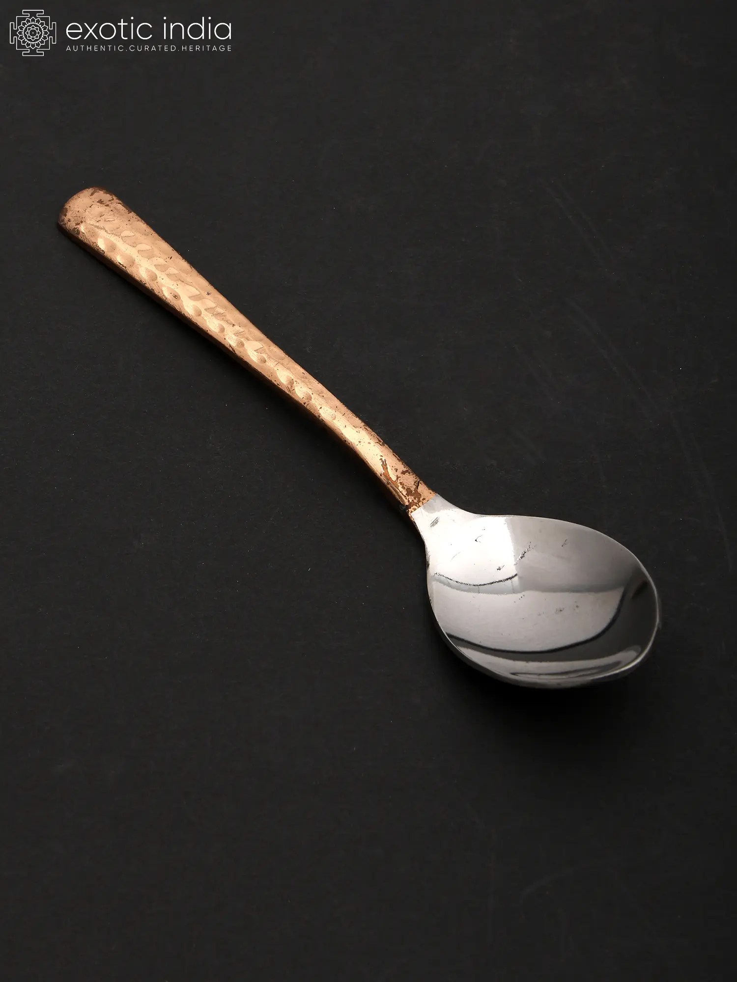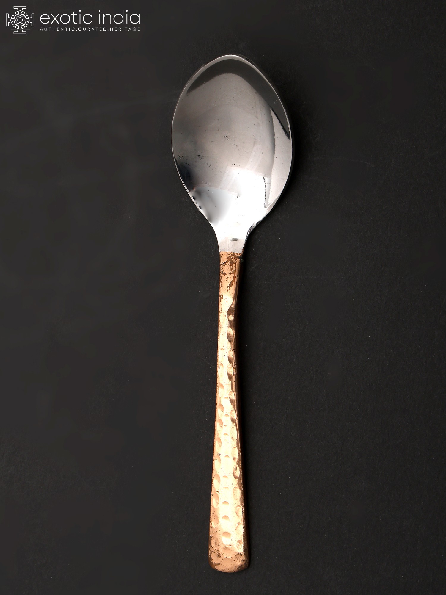 Meticulously fashioned from a combination of copper and steel, this spoon showcases a harmonious marriage of materials. The copper handle provides a warm, inviting touch, while the sleek steel bowl offers durability and ease of cleaning. The handle features a unique hammered texture, giving it a rustic yet sophisticated appeal that is pleasing to the eye and comfortable to hold. The smooth, polished steel bowl contrasts beautifully with the textured handle, creating a visually stunning piece that elevates any table setting. This blend of materials ensures longevity, allowing you to enjoy this beautiful spoon for years to come.