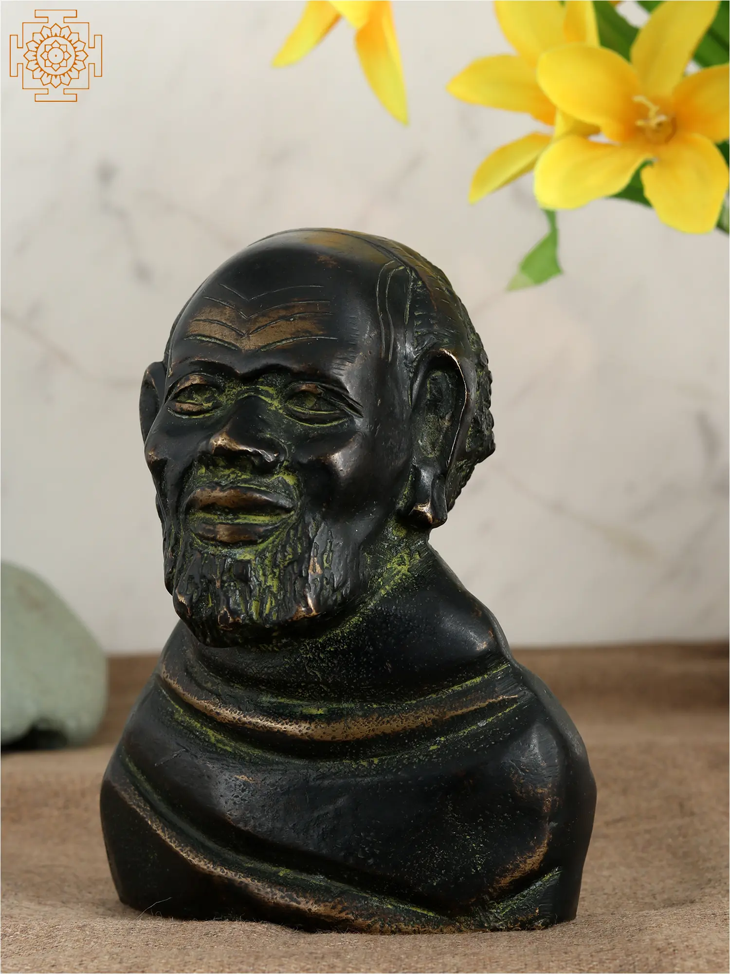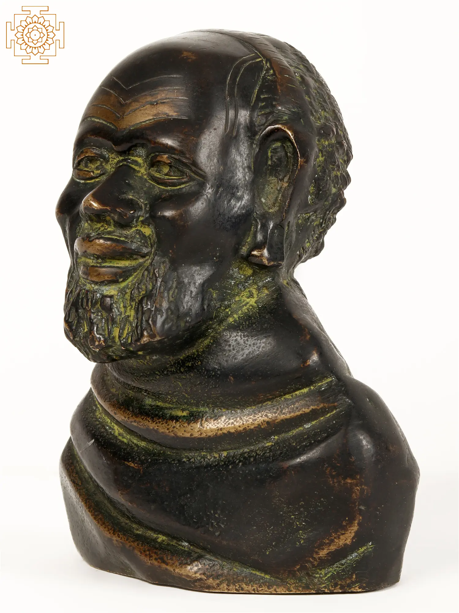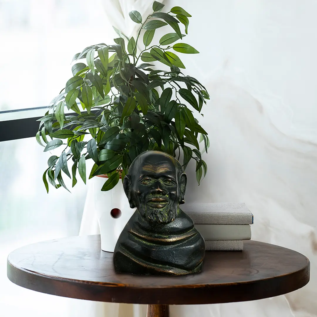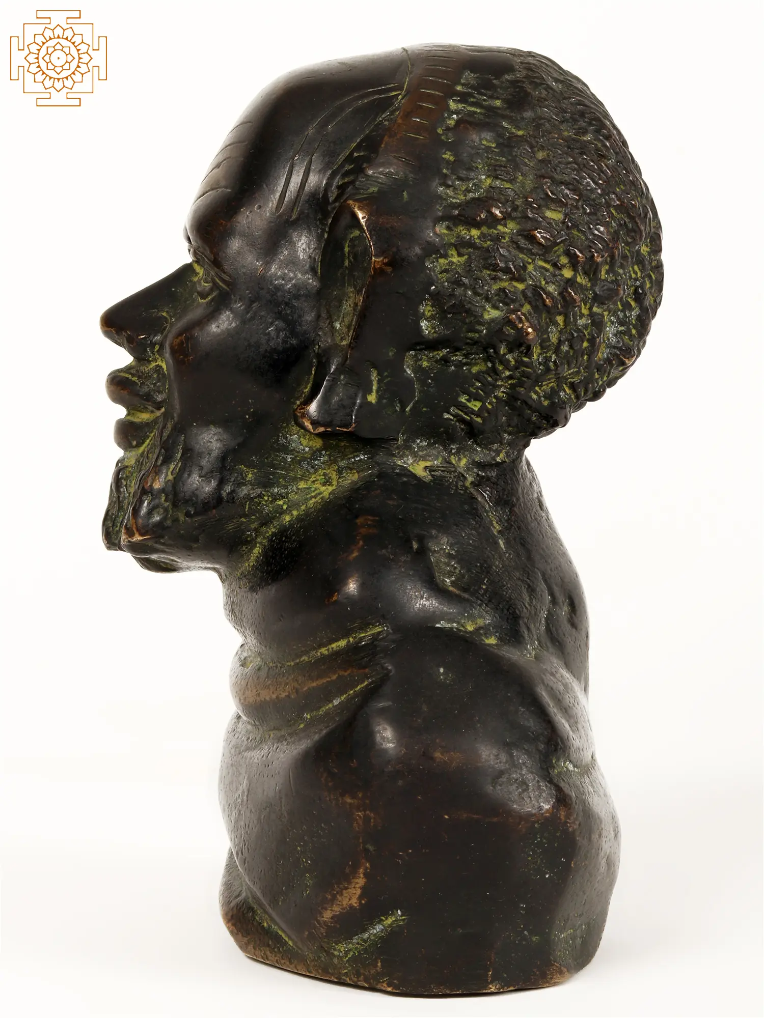 Human figurines are indirect archives of the times and cultures a person experiences and, most importantly, becomes a part of. There has been a tradition of making human busts to record attire and living for a long time. This captivating allure of the Old Beard Man Bust, a Brass Statue, evokes the spirit of Zimbabwe Stone Sculptures and presents the documentation of a certain time and living. With a distinguished black tint and subtle green patina in folds, this statue exudes an antique charm.