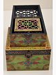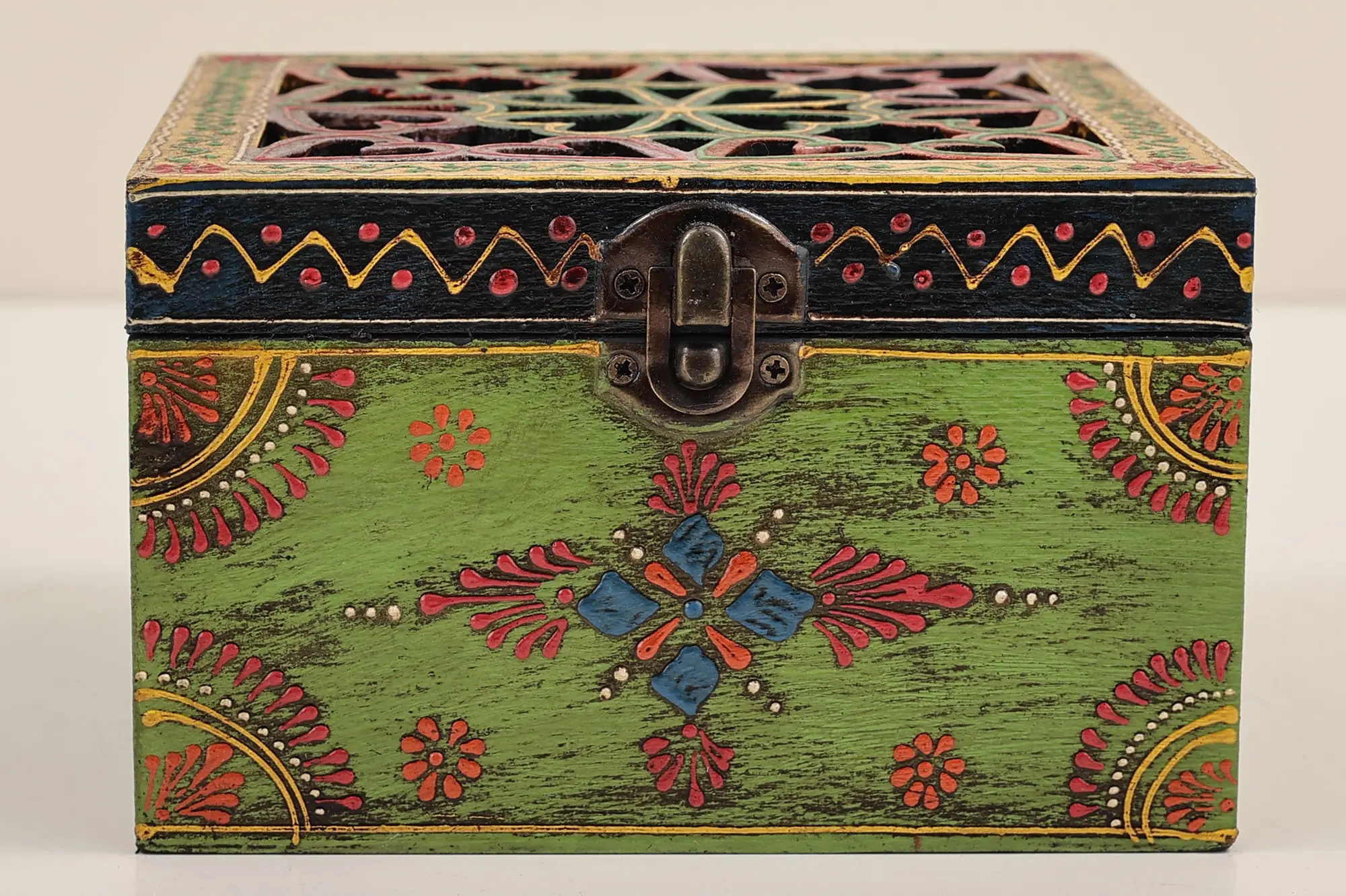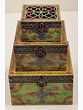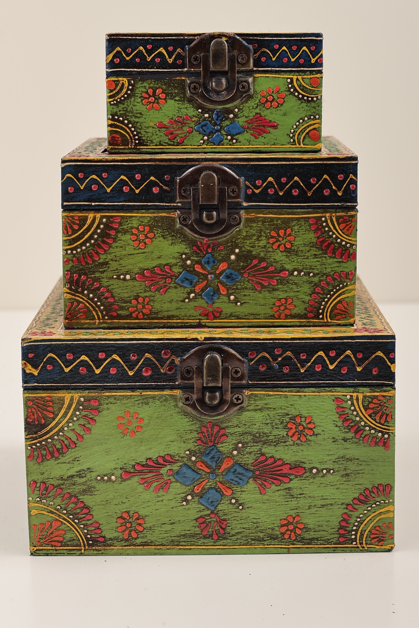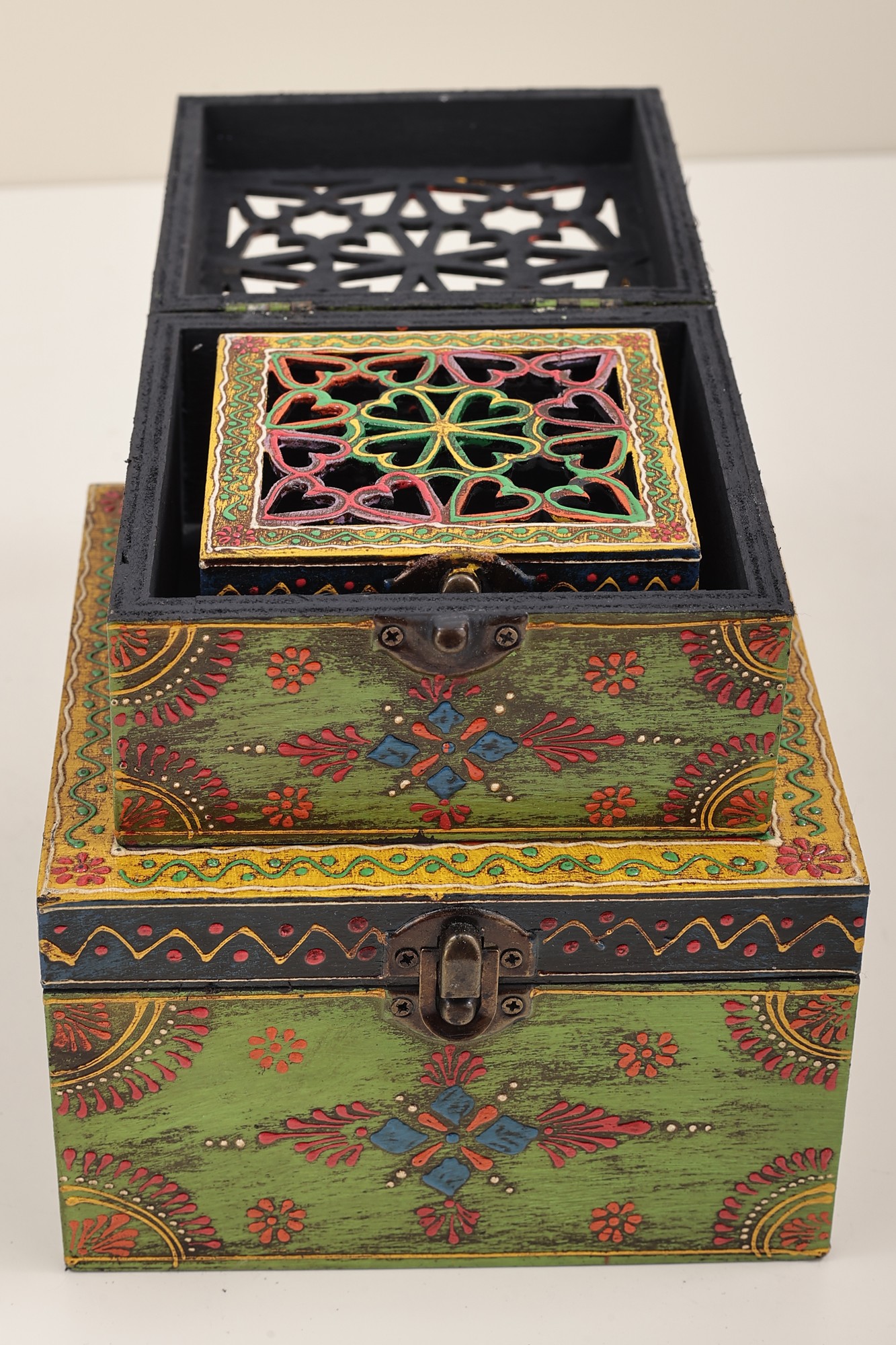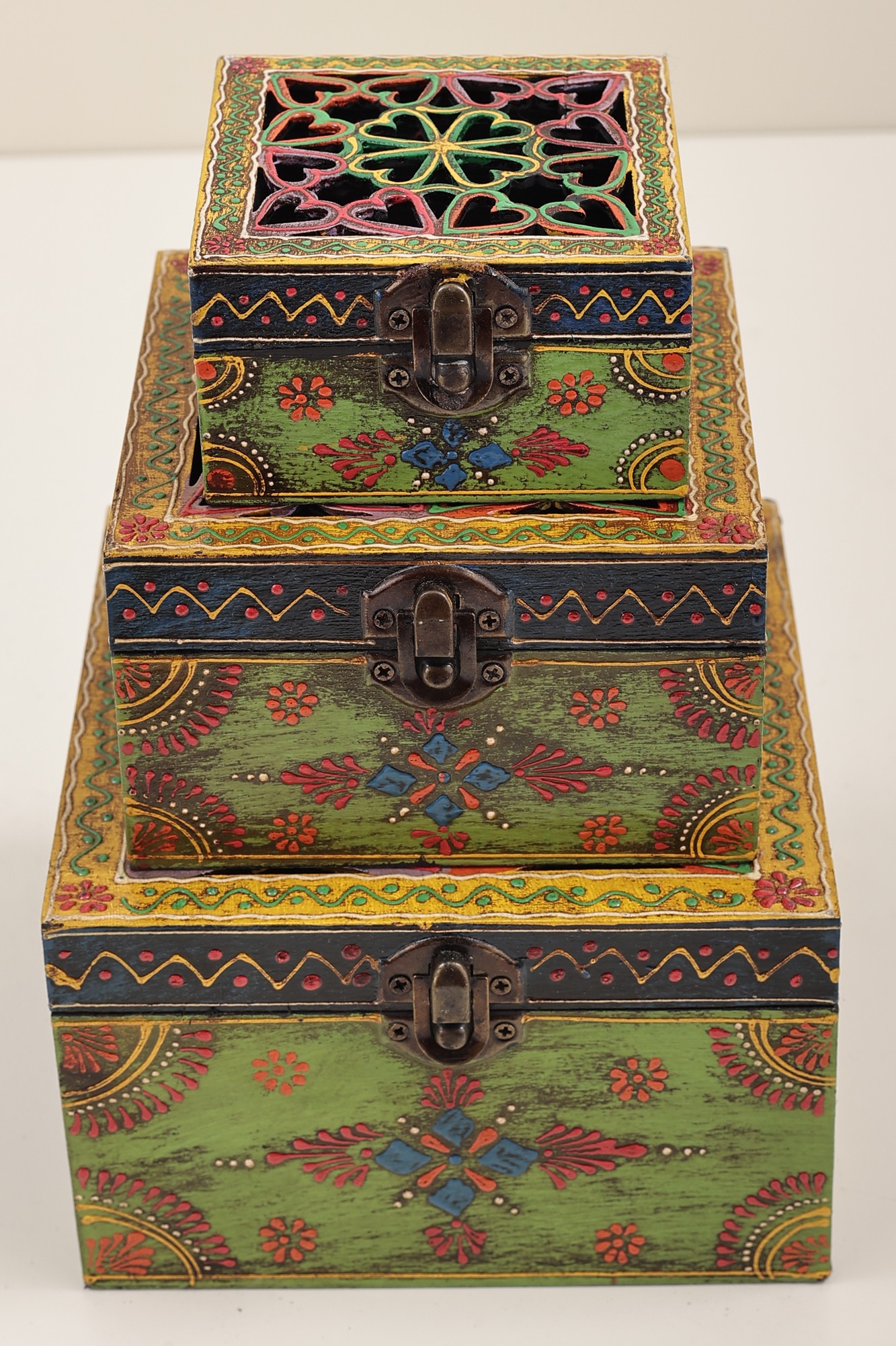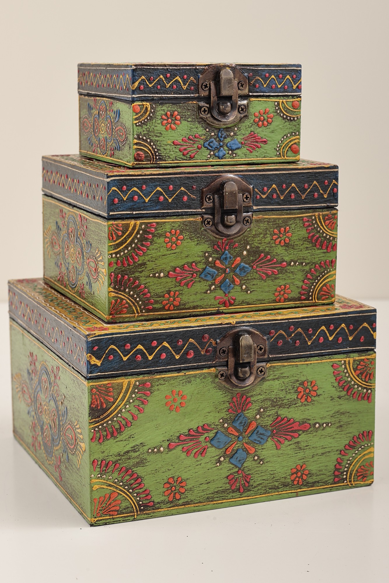 This Set of 3 Hand Painted Lattice Decorated Boxes, is where artistry meets functionality. Each box boasts a top adorned in the timeless lattice or Jaal style, adding a touch of traditional charm to your space. The vividly painted surfaces in bright hues create an eye-catching appeal. Embracing the Jodhpur style, the boxes feature meticulous dots and lines in white, enhancing their visual allure. These versatile containers seamlessly blend form and function, offering not only storage but also serving as exquisite decorative pieces. Elevate your decor with this set, a testament to the fusion of cultural aesthetics and practical design.