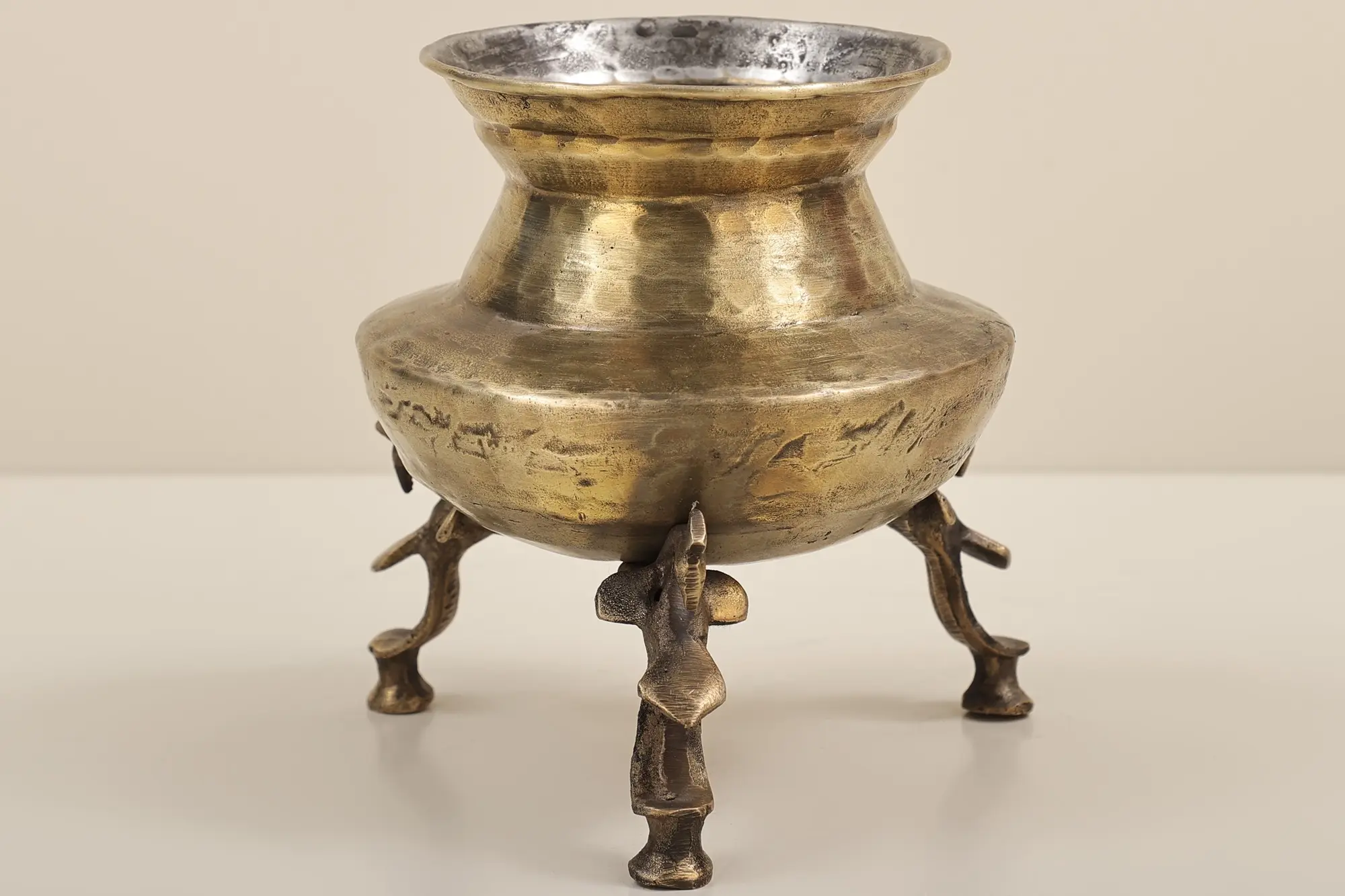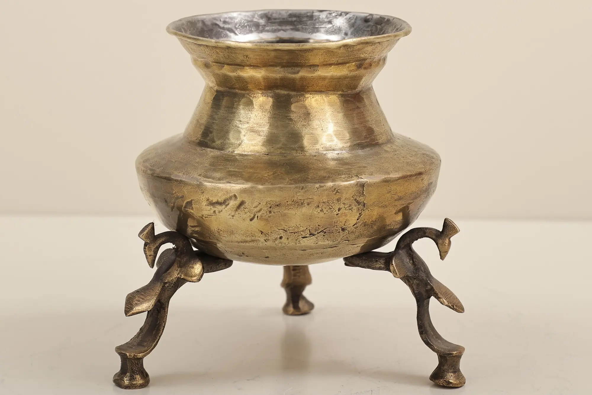 The included stand elevates the handi, adding to its visual appeal and creating a sense of importance. The stand features intricate detailing, showcasing the artisan's dedication to precision and artistry. Each leg of the stand is carefully crafted, adding stability and sophistication to the overall design. This combination of the handi and stand creates a visually stunning display that is sure to spark conversation and admiration. More than just a decorative item, this brass handi with stand represents a connection to history and culture. It is a reminder of the enduring beauty of handmade objects and the skill of the artisans who create them. Whether you choose to display it as a centerpiece on your dining table, a focal point on a shelf, or a unique addition to your kitchen, this brass handi is sure to bring a touch of warmth and character to your home. It is a tangible piece of Indian heritage, a testament to the enduring appeal of handcrafted artistry.