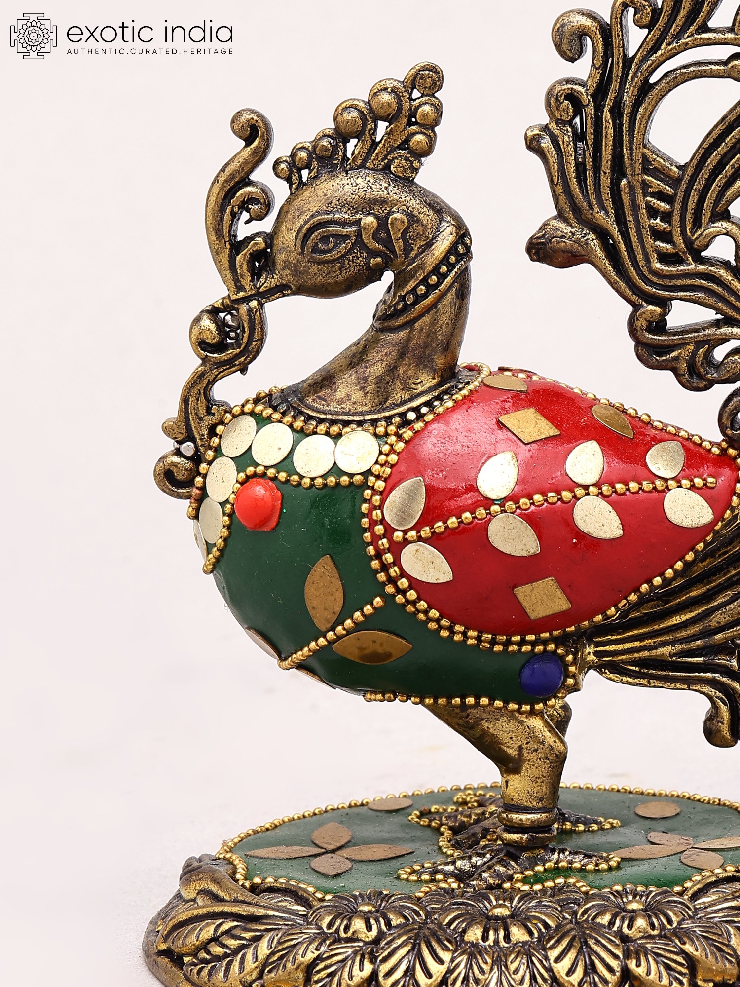 Features vibrant red and green body segments adorned with brass inlay.