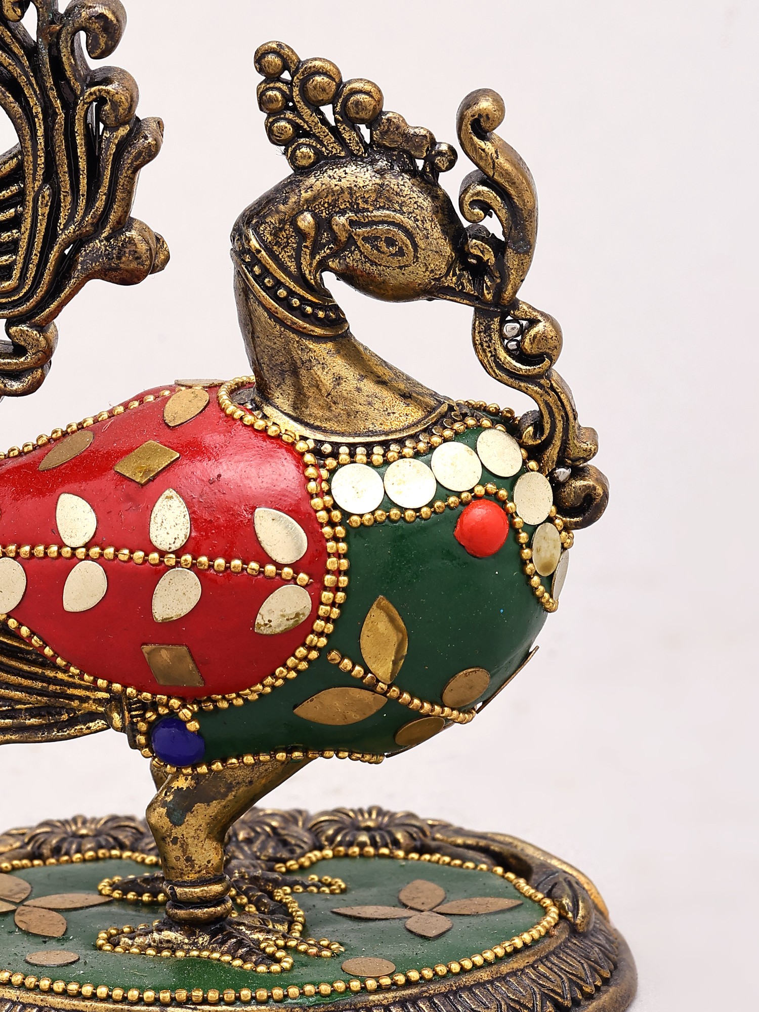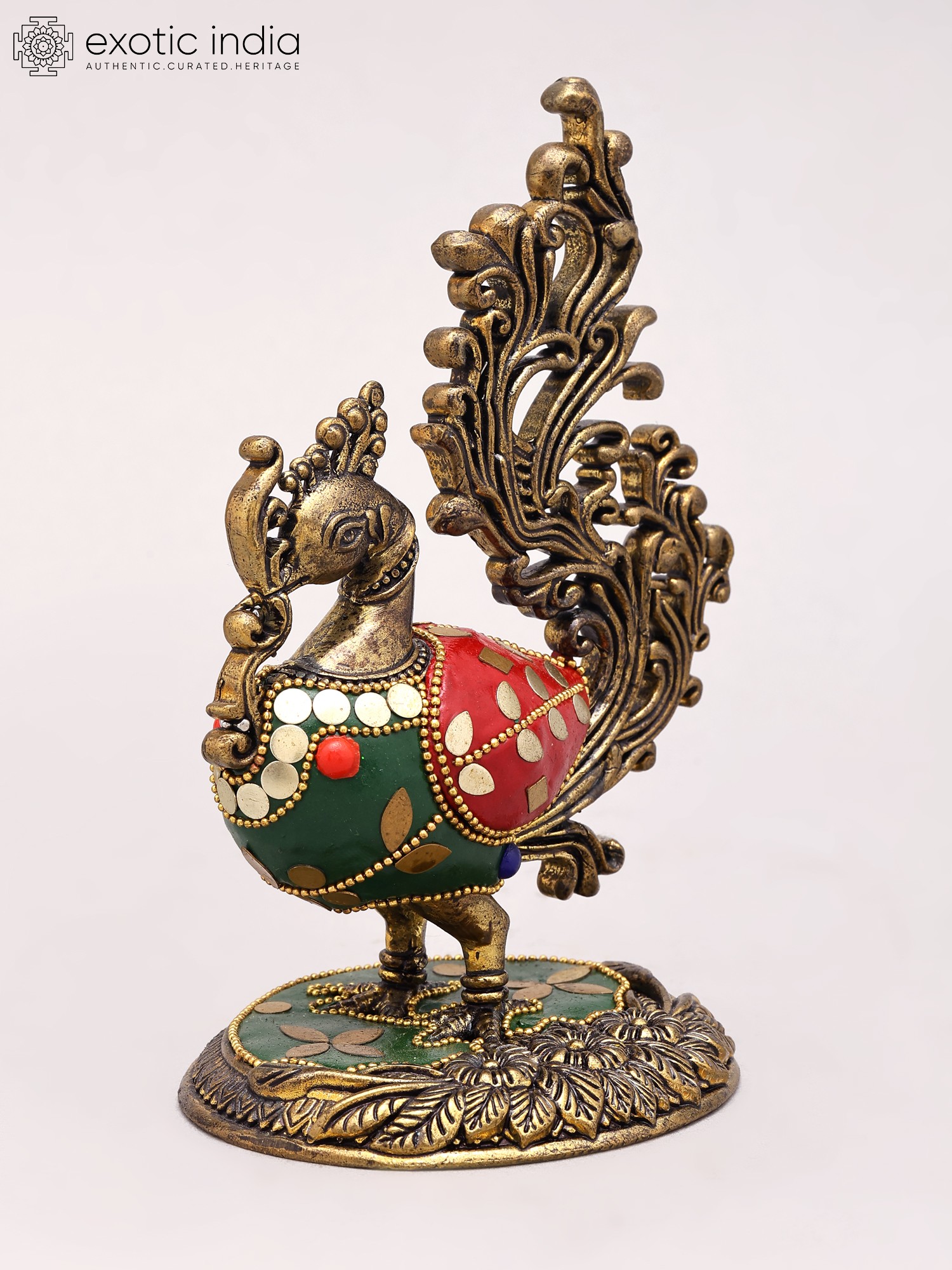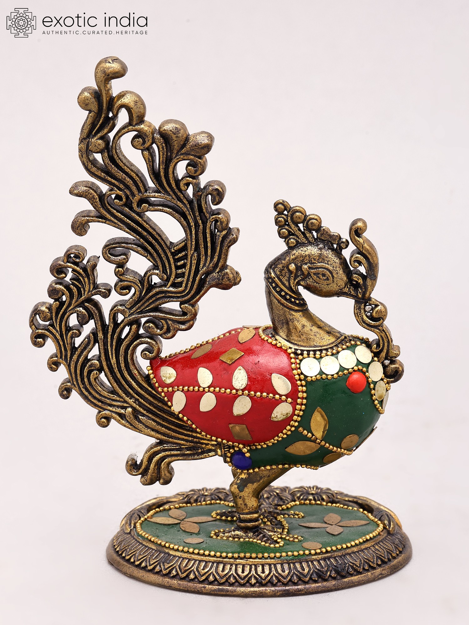 Intricately detailed brass peacock figurine, standing 5 inches tall.