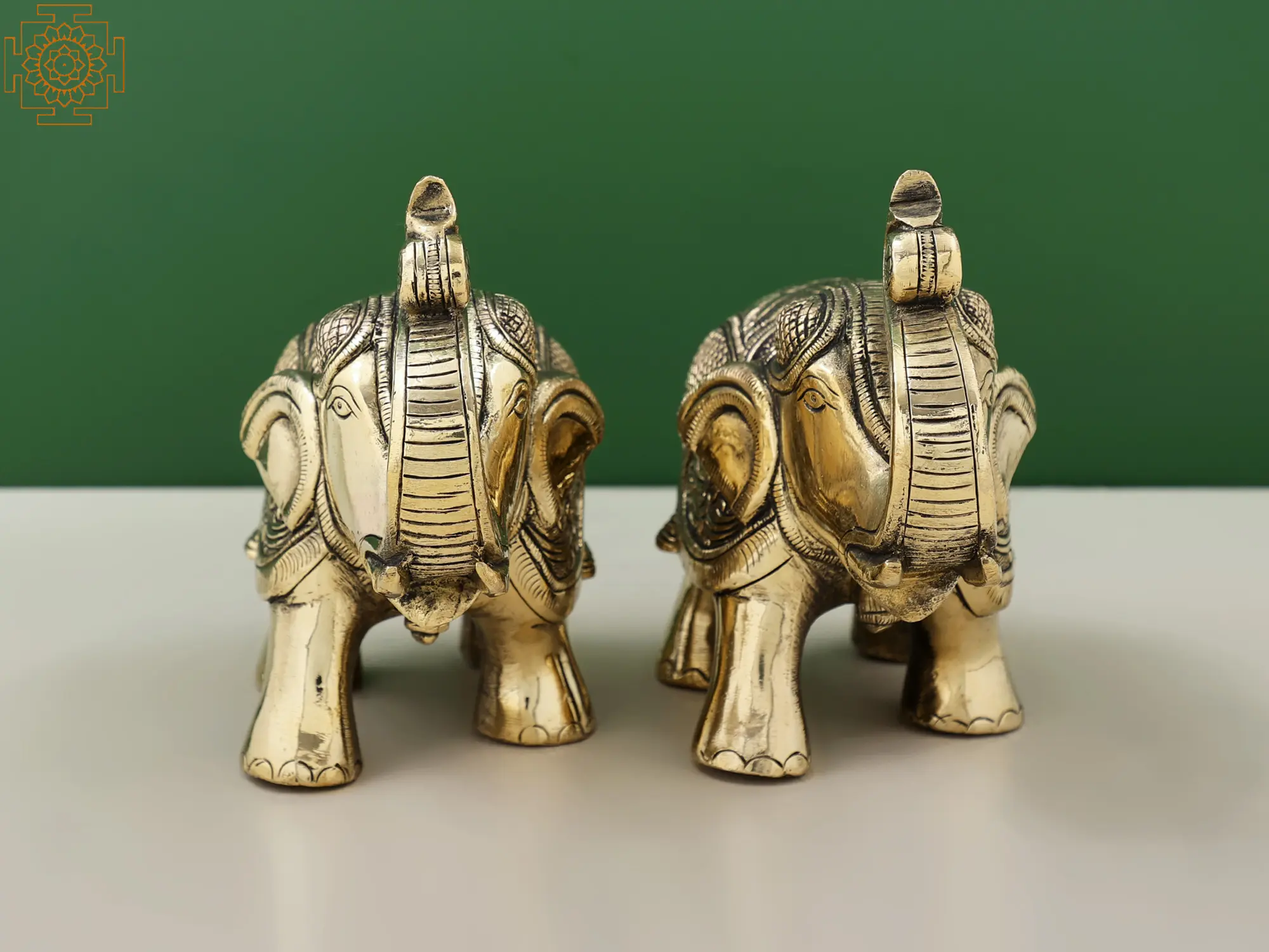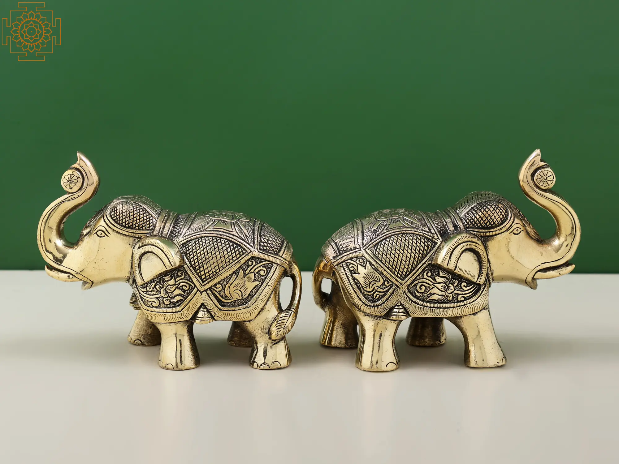 This handmade, Brass pair of elephants with their jugular trunks raise upward, holding some auspicious solid article in salutation stance, looks endearing. The backs and the heads of the elephant pair have been decorated by spreading a carpet carved so impressively with geometrical flowers and lines. The elephant pair could be positioned at the entrance of your office or home to bring happiness, wealth, and fortunes. Their robust legs, elongated and extended ears, and smiling large faces have further enhanced the magnificence of the pair.