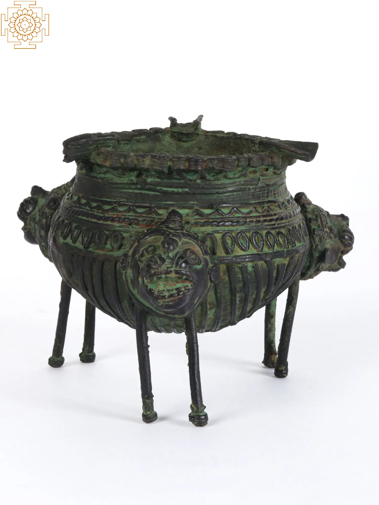 There are animal heads attached to the body of the bowl as it stands on two legs for each head. It can be used as an incense burner as well as a decorative piece. This small brass bowl is not only an object, but also the sculpting hand itself becomes a physical gateway; it's like an expressive testimony about time-honored craftsmanship.