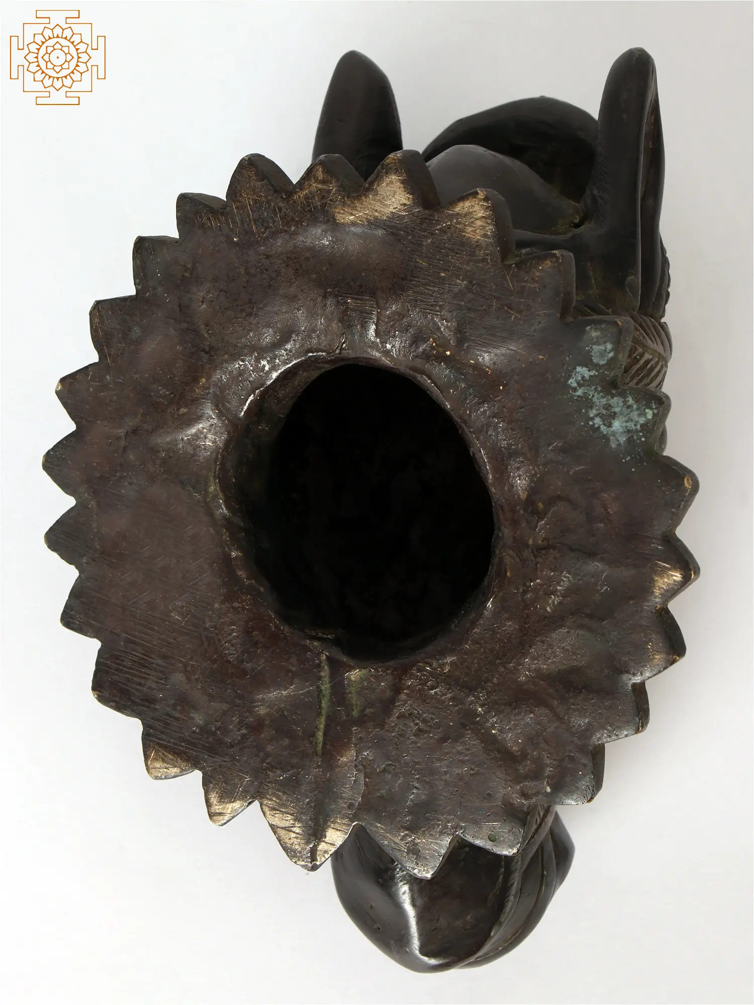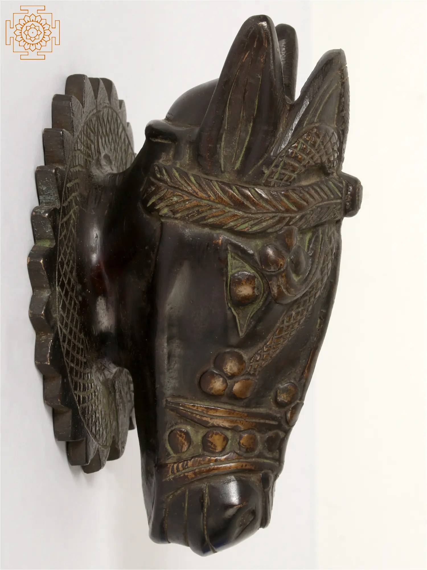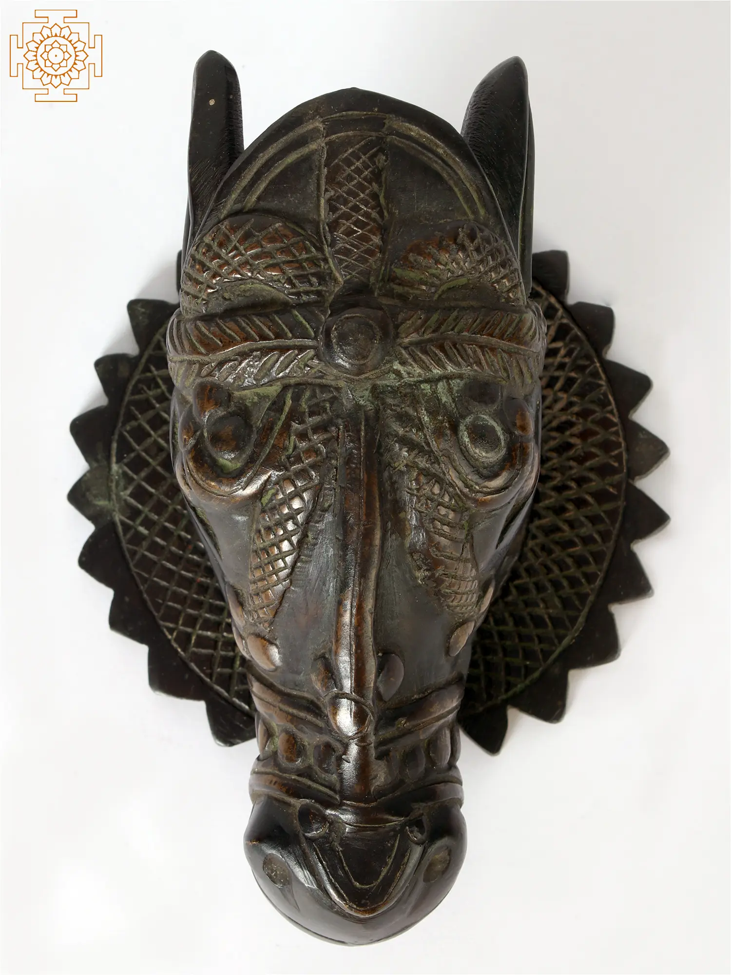 This Small Wall Hanging Horse Head in Brass is a regal and ornate decor piece, adorned with intricate details. Carved ornaments embellish the horse's head, enhancing its majestic appearance. A beautifully crafted headdress adds a touch of grandeur, elevating its regal charm. The inclusion of a halo or siras chakra behind the horse's head, resembling the sun, adds a divine and symbolic element. This brass wall hanging becomes a captivating blend of artistic craftsmanship and cultural symbolism, making it a statement piece that not only beautifies the space but also exudes an aura of elegance and significance.