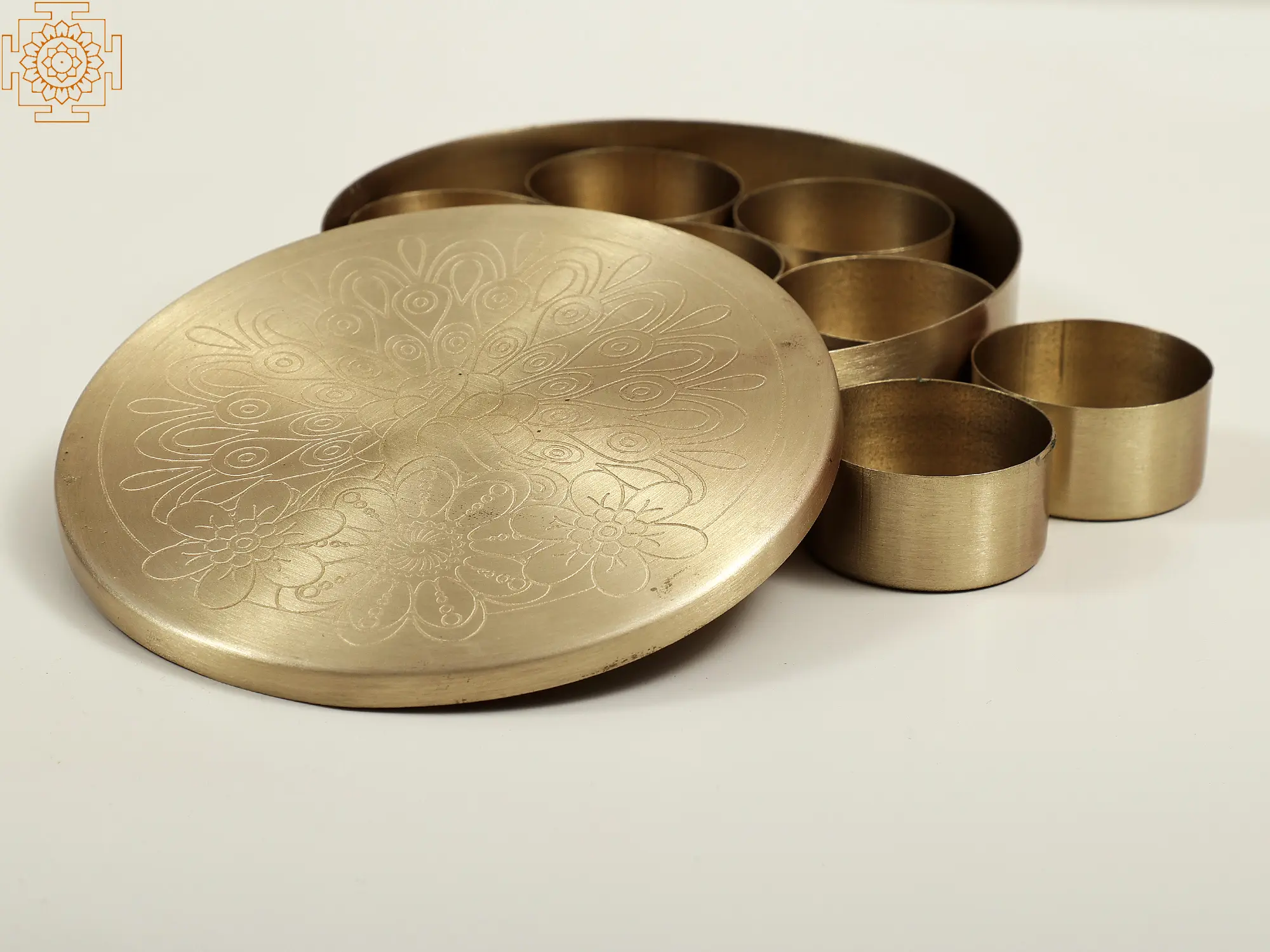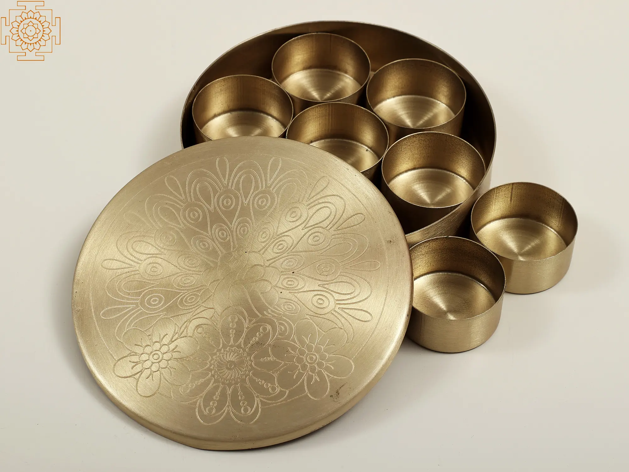 This culinary treasure is the Masala Brass Box with seven removable round dividers inside the box. Crafted with meticulous care, it elegantly organizes your array of spices. But it's not just about functionality, the lid boasts an enchanting peacock and flower motif, transforming it into a work of art. In the kitchen, it's a piece of craftsmanship that enhances both the organization of your spices and the ambiance of your culinary space, making every meal a work of art.
