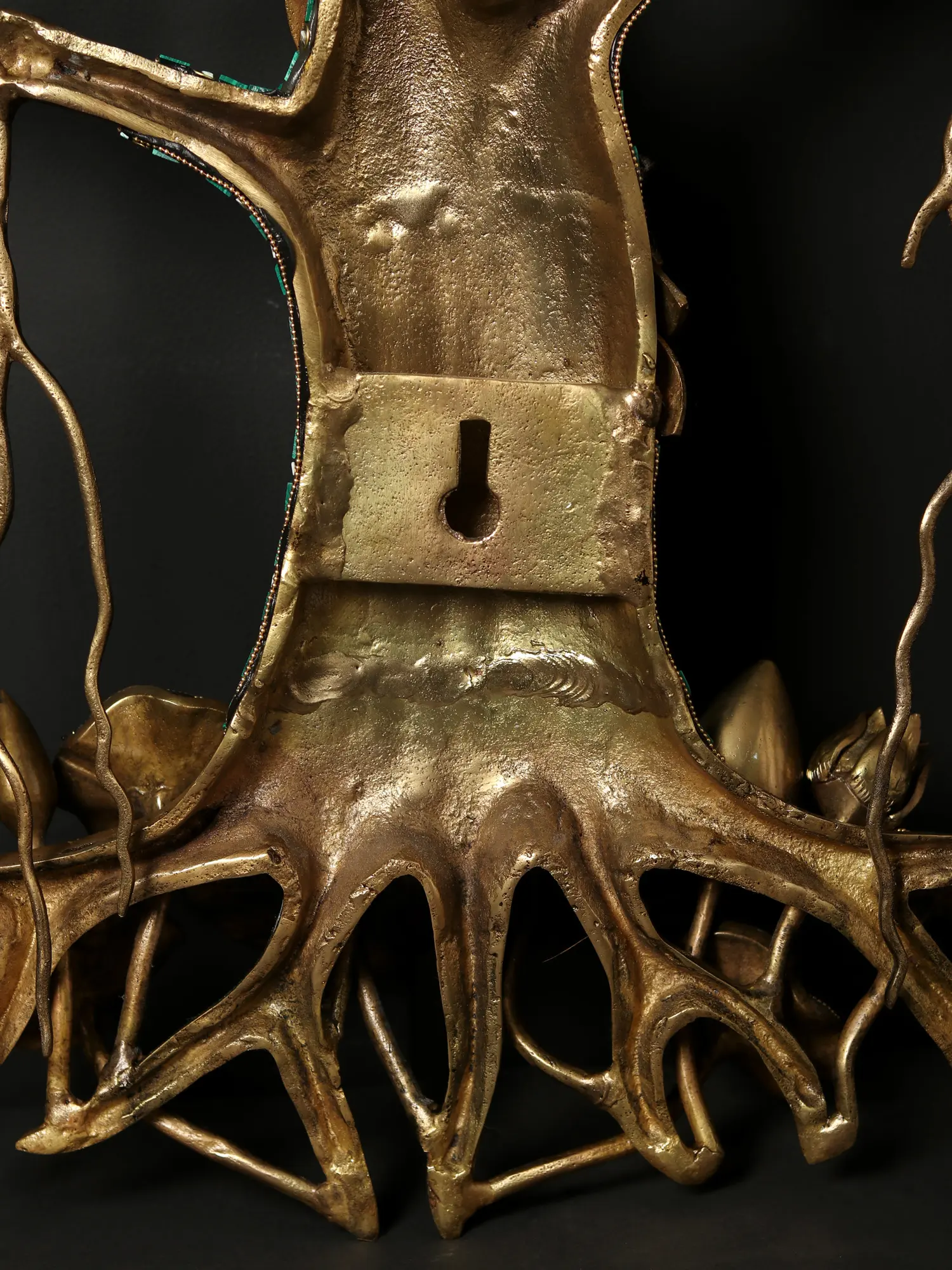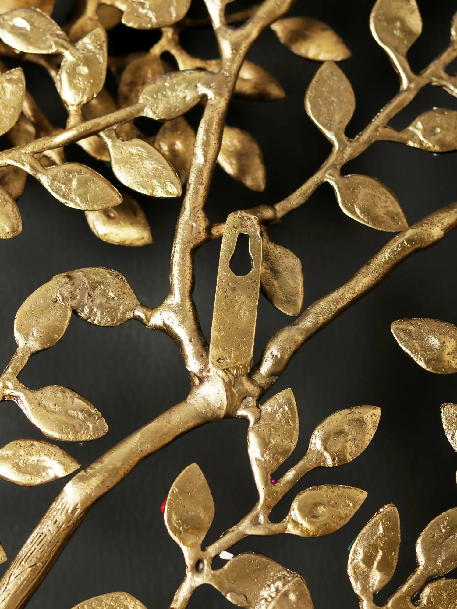 This Large Wall Hanging Tree of Life with Beautiful Birds in brass, adorned with intricate inlay work, can capture the attention of one and all. Manifesting the Vat Vruksha or Banyan tree, it radiates significance and elegance. Black leaves, adorned with red, white, and green stones, create a captivating contrast, while red birds perch on their branches, infusing life into the artwork. Delicately hanging roots and a dense leaf pattern resembling a creeper evoke a harmonious connection with nature.