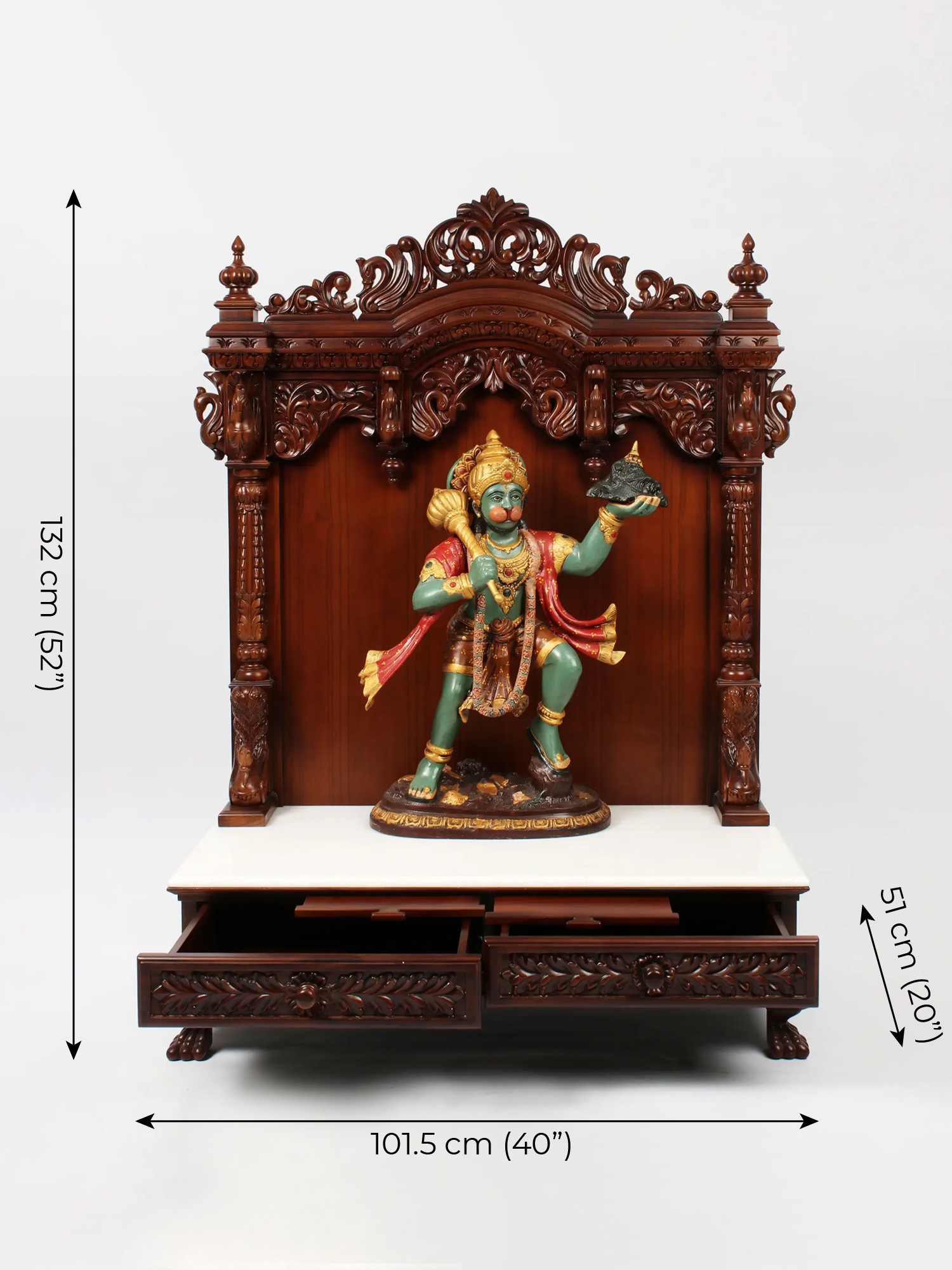 On the lower portion of the arch, a profusion of floral details and front-facing swans add a distinctive natural and spiritual beauty to the wooden Mandir. The platform has two exquisitely patterned drawers to solve your trouble of storing Puja items. A pull-out plate is attached to the platform as well, giving you enough space to place the ritual lamp and other items.