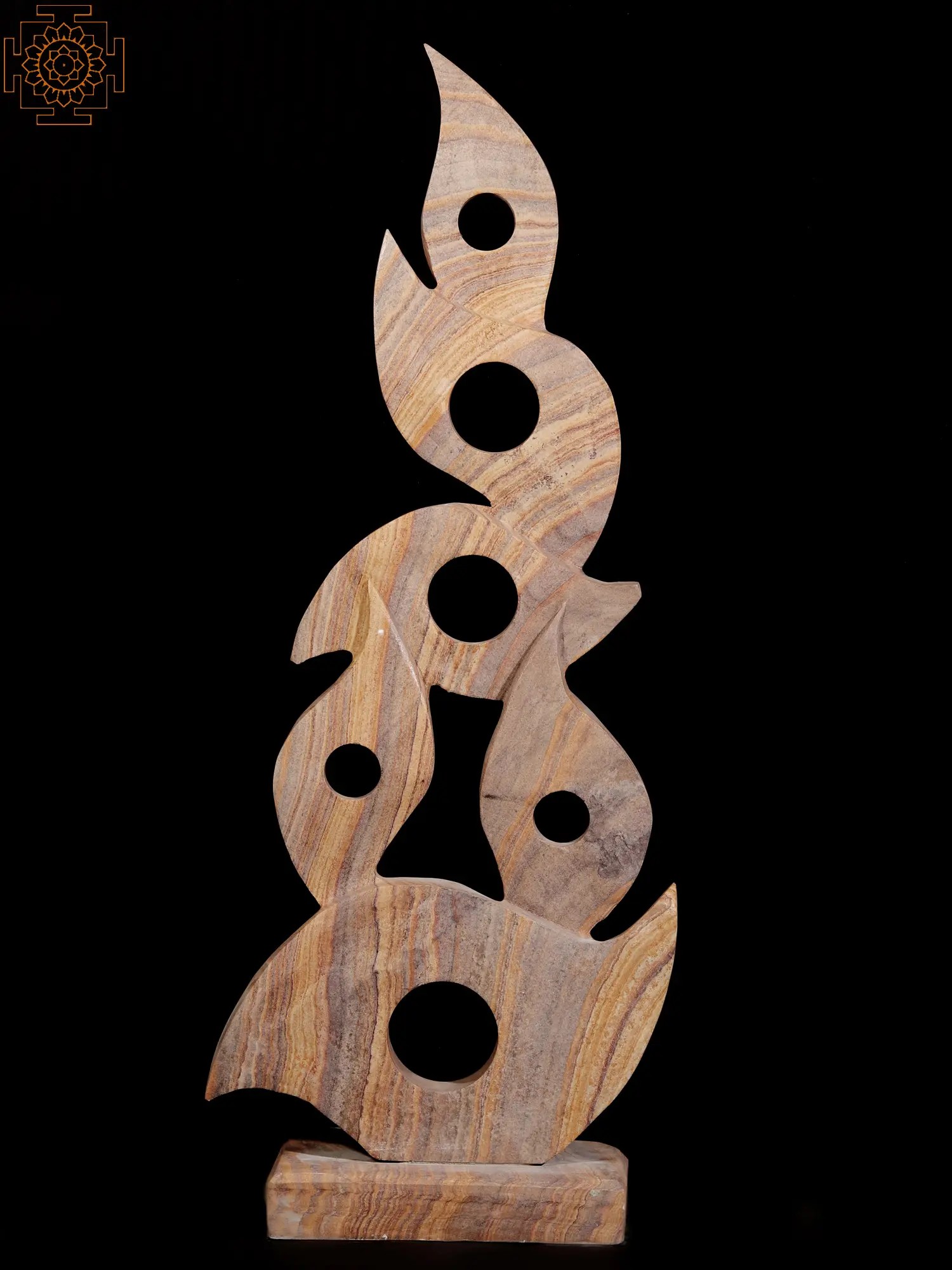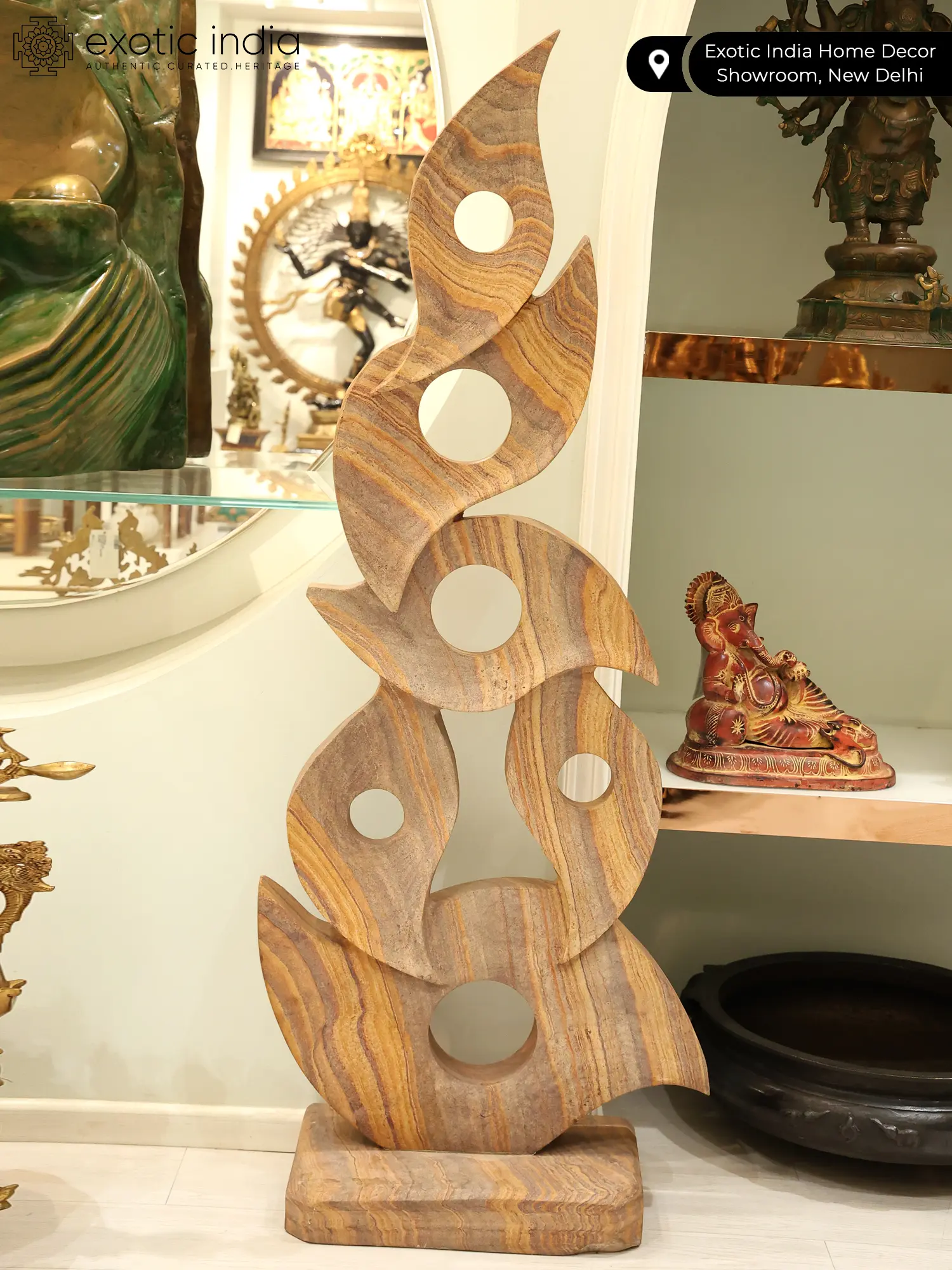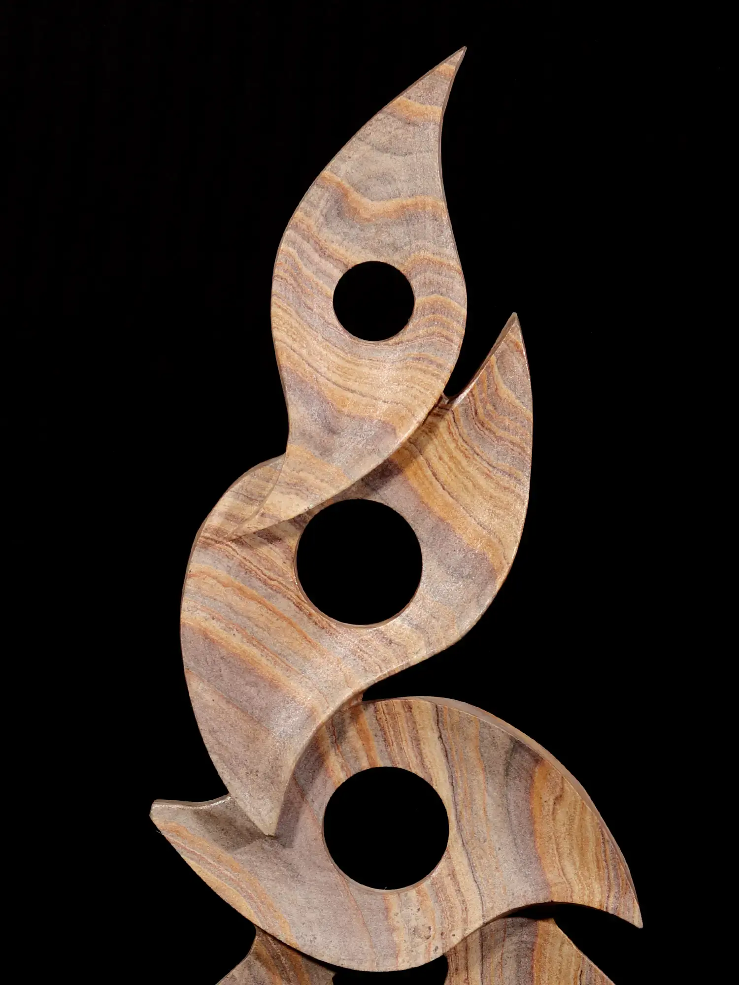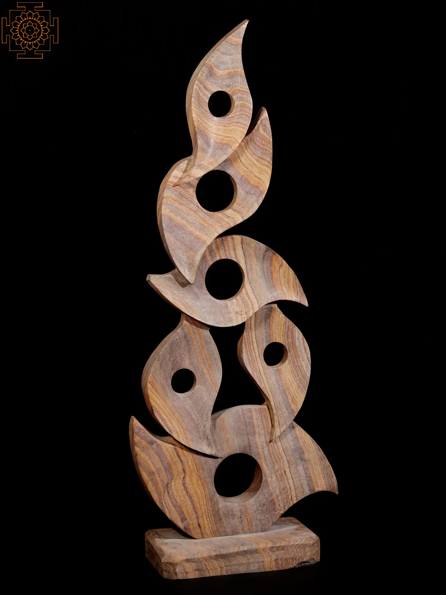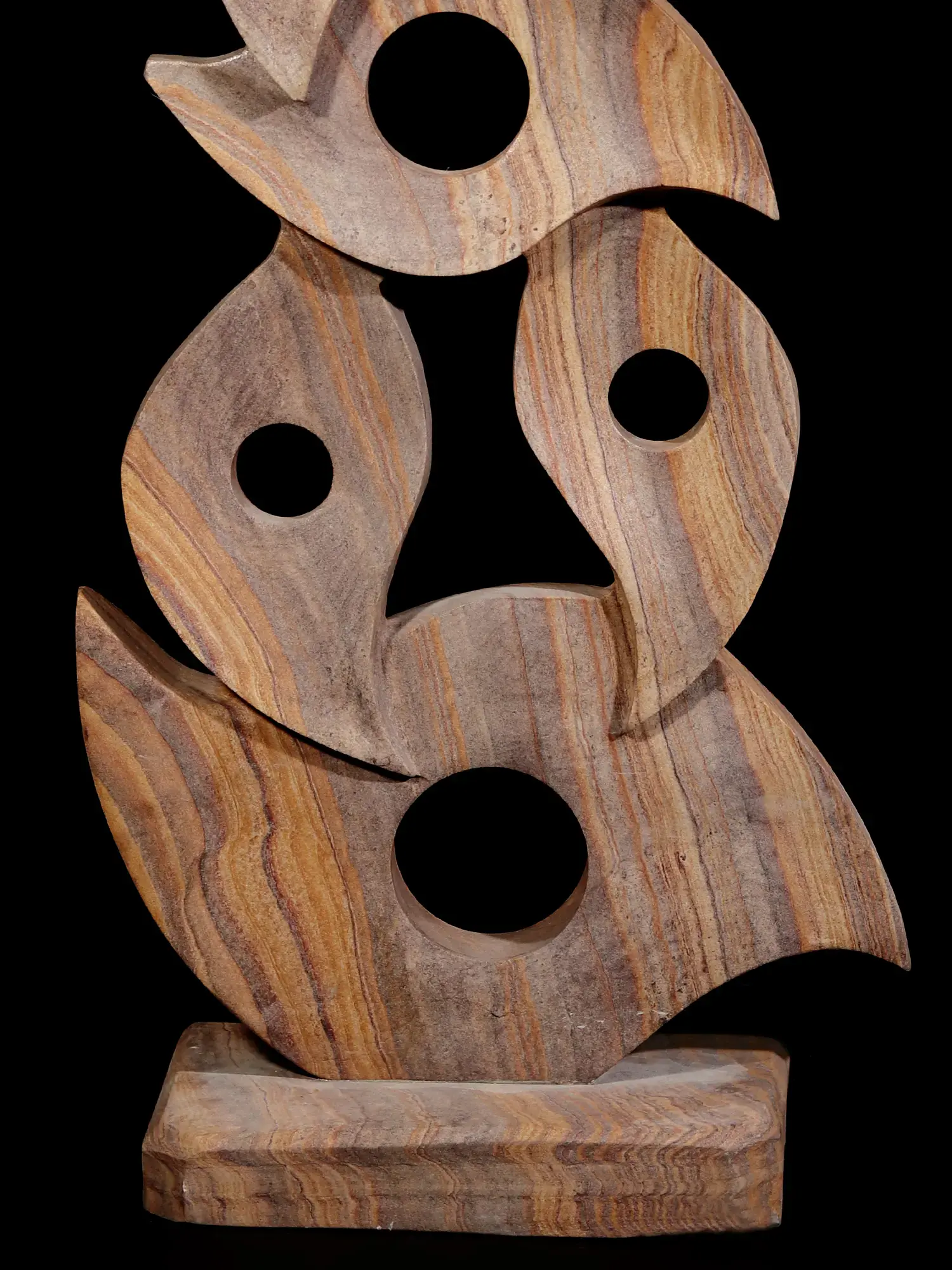 The modern art sculpture in Rainbow Sandstone portrays philosophical concept using a minimalist design. Eyes, symbolizing individual perspectives, are arranged vertically, with a larger eye at the bottom supporting the weight of those above. The Rainbow Sandstone medium adds texture and vibrancy to the piece. The sculpture explores the interconnectedness of humanity, emphasizing our collective responsibility. The prominent eye at the base represents enlightened consciousness, carrying the burdens of understanding and empathy. This artwork invites introspection, highlighting the significance of unity and the transformative power of a single enlightened perspective. It serves as a visual reminder of shared human experience and the importance of supporting one another.
