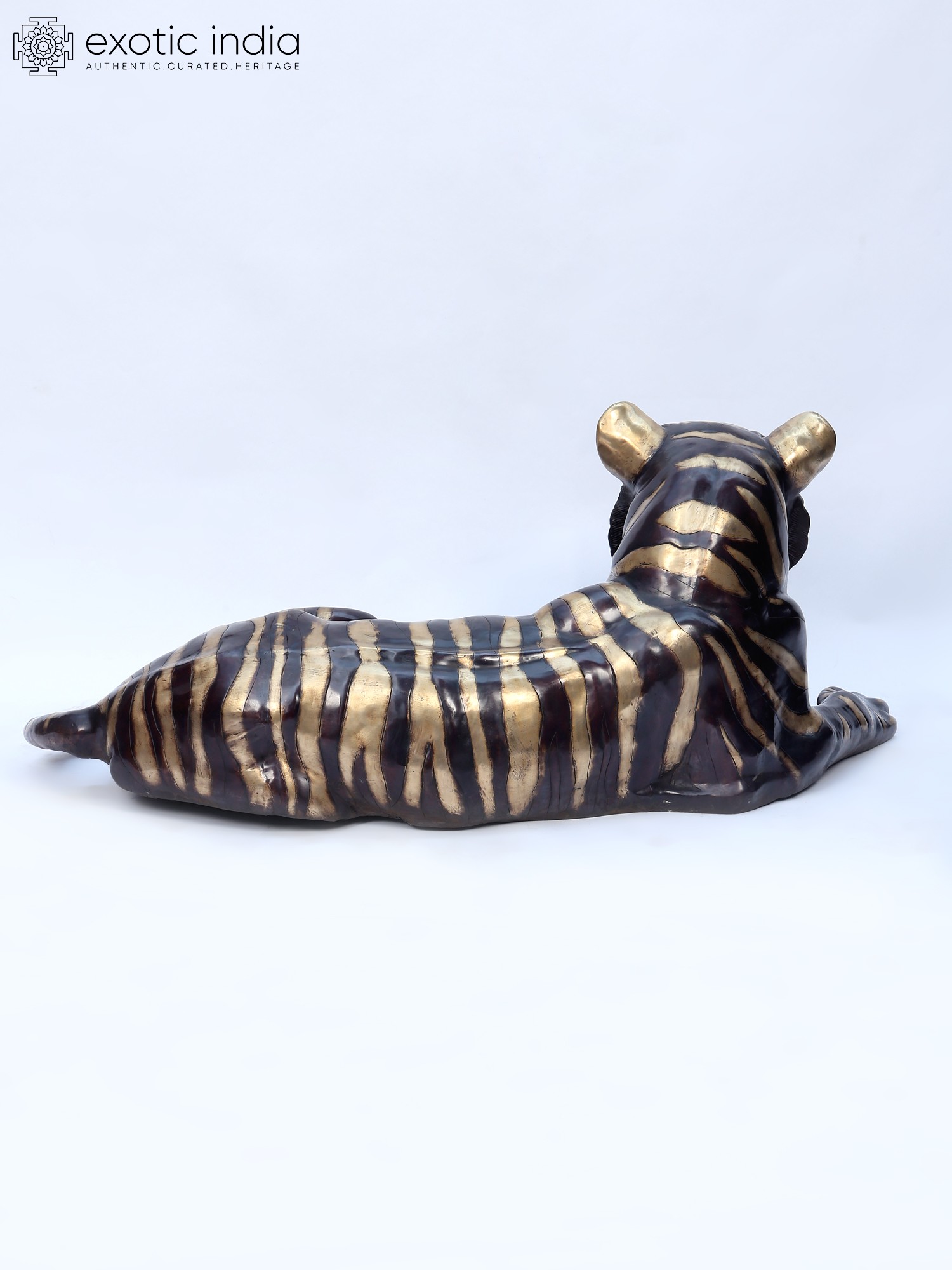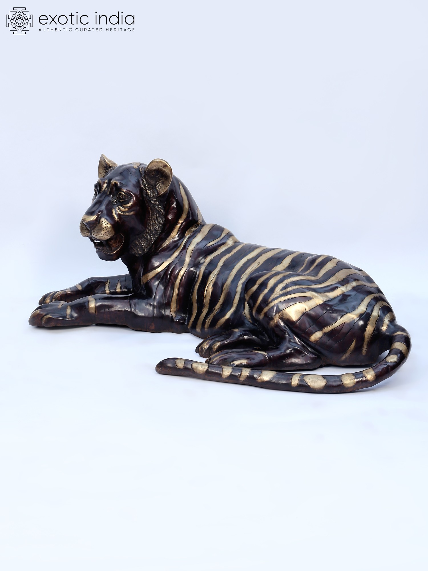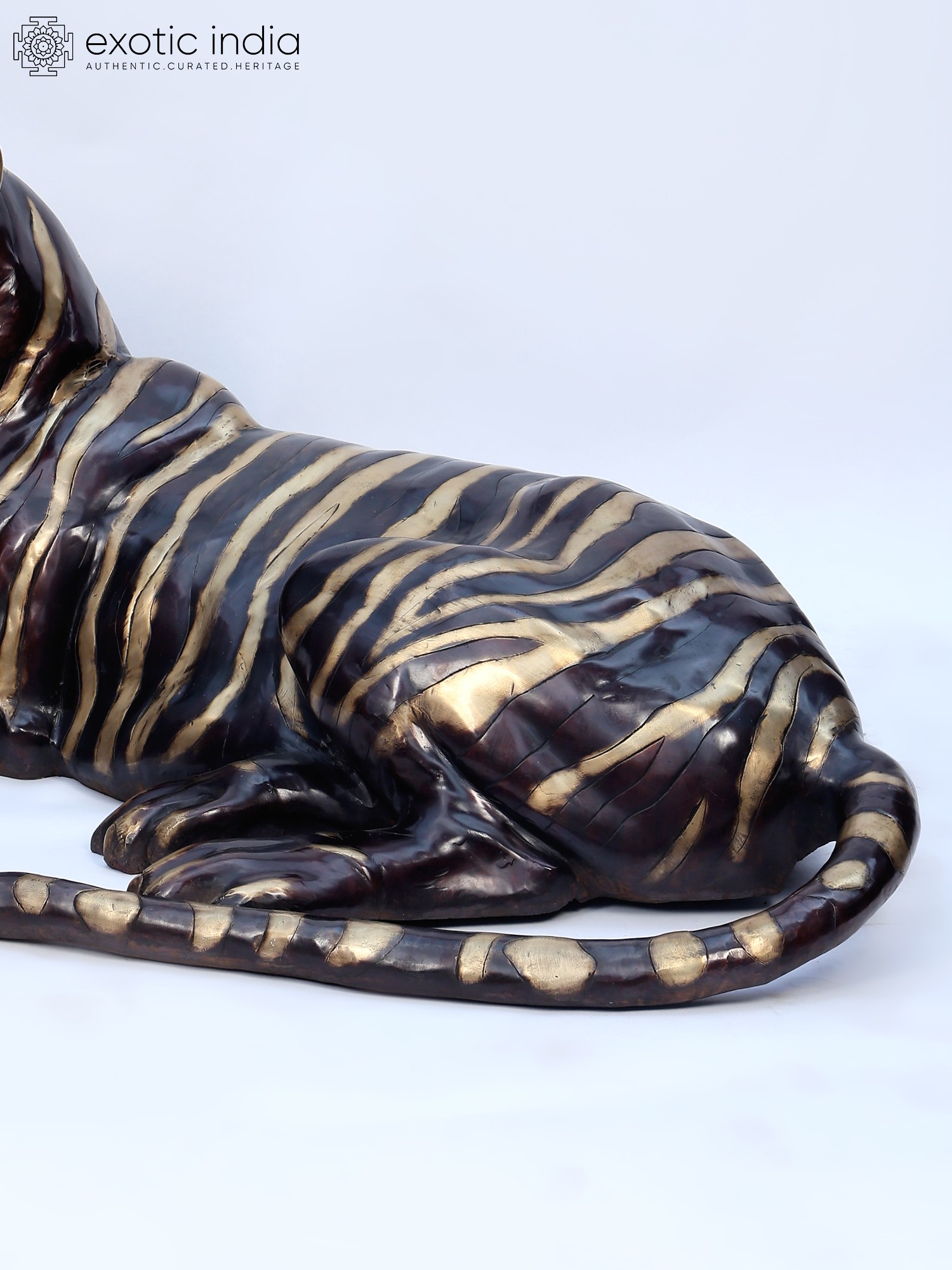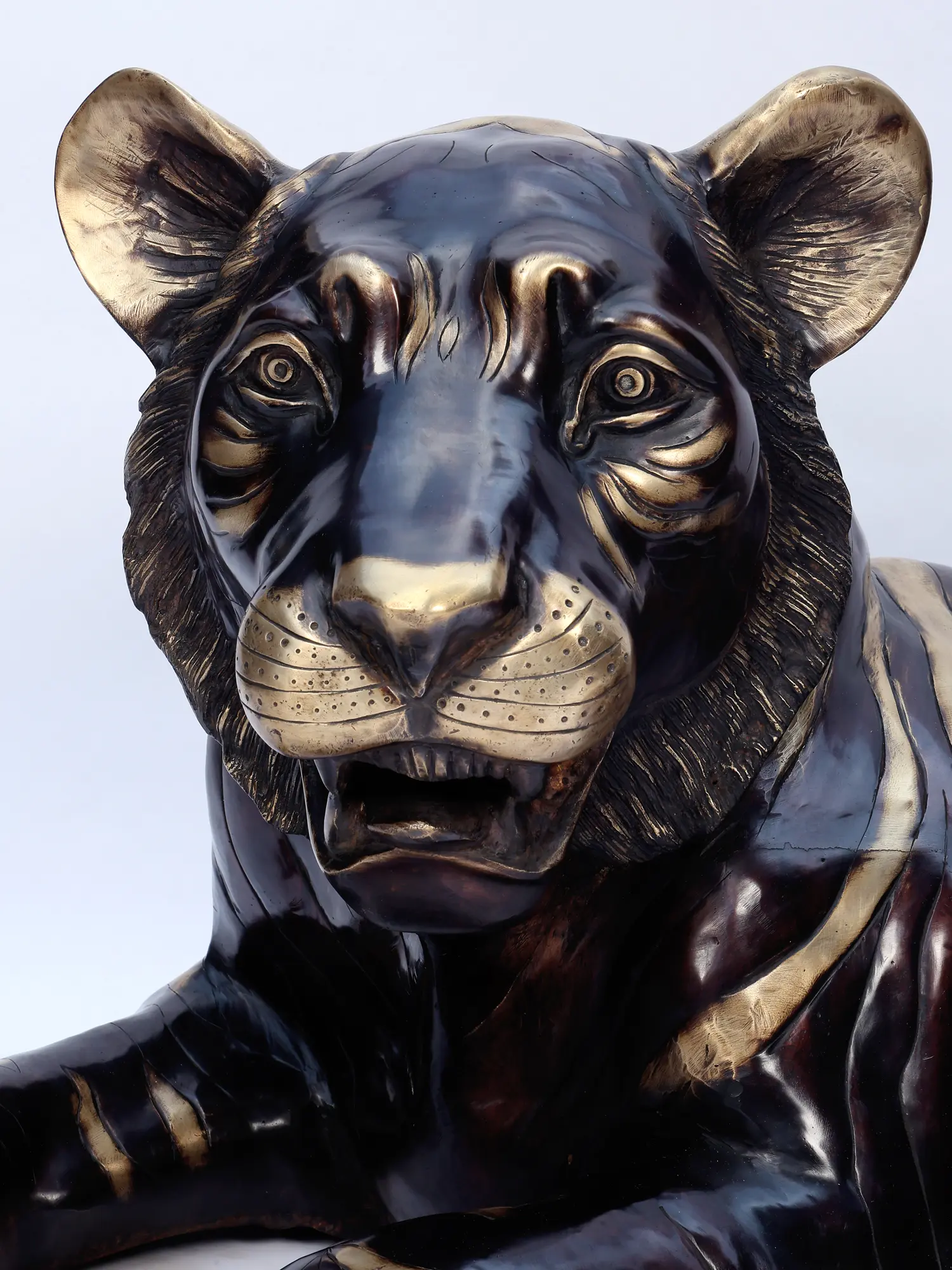 Introducing a breathtaking brass sculpture that captures the untamed spirit and regal presence of the tiger. This magnificent piece is more than just a decorative item; it's a statement of power, elegance, and the wild beauty of nature brought into your home. Crafted with meticulous attention to detail, the sculpture portrays a large tiger in a relaxed, resting pose, exuding an aura of calm authority. The deep, rich patina of the brass, contrasted with striking golden stripes, evokes the iconic markings of this majestic feline, making it a truly captivating work of art.