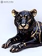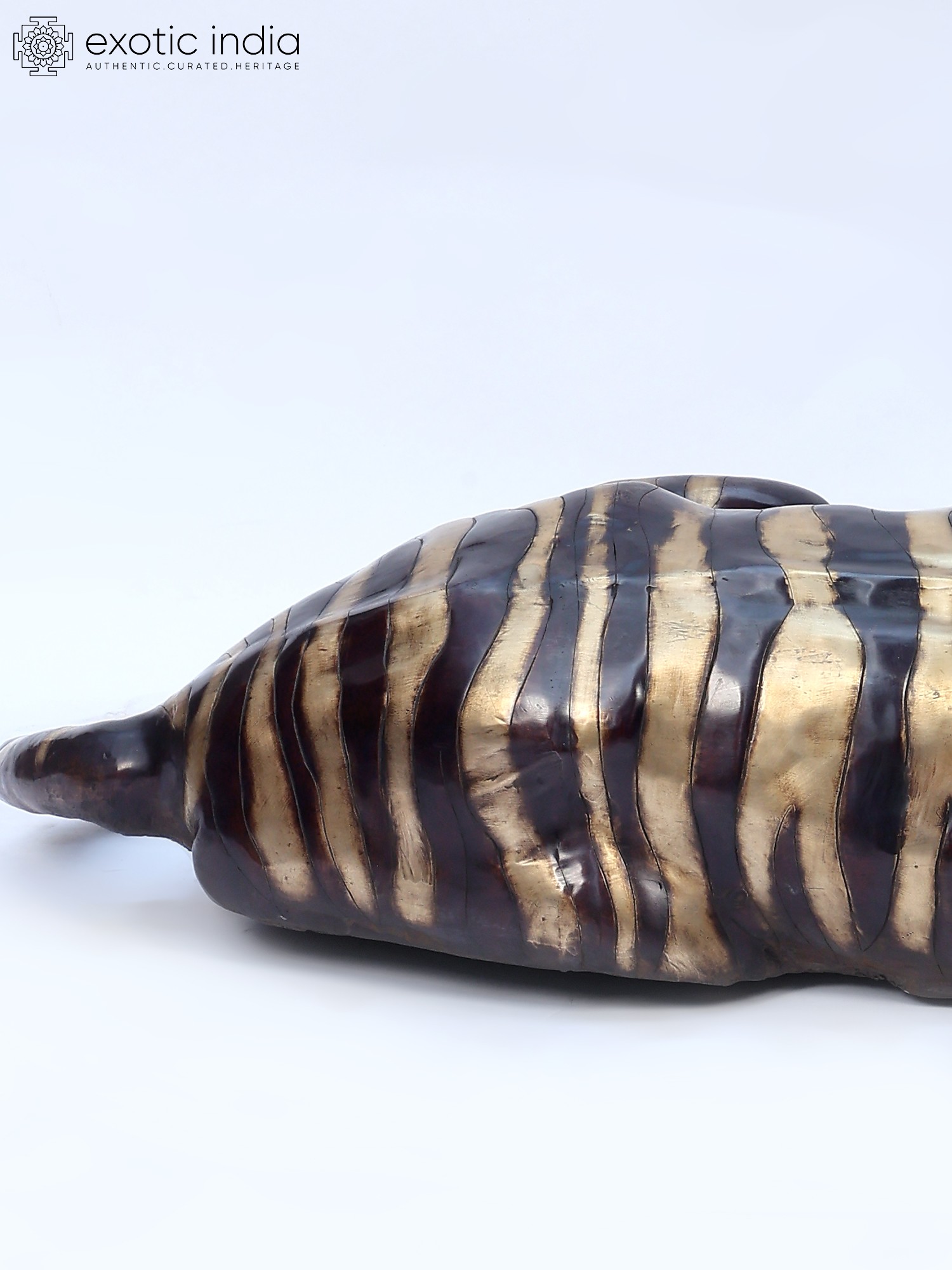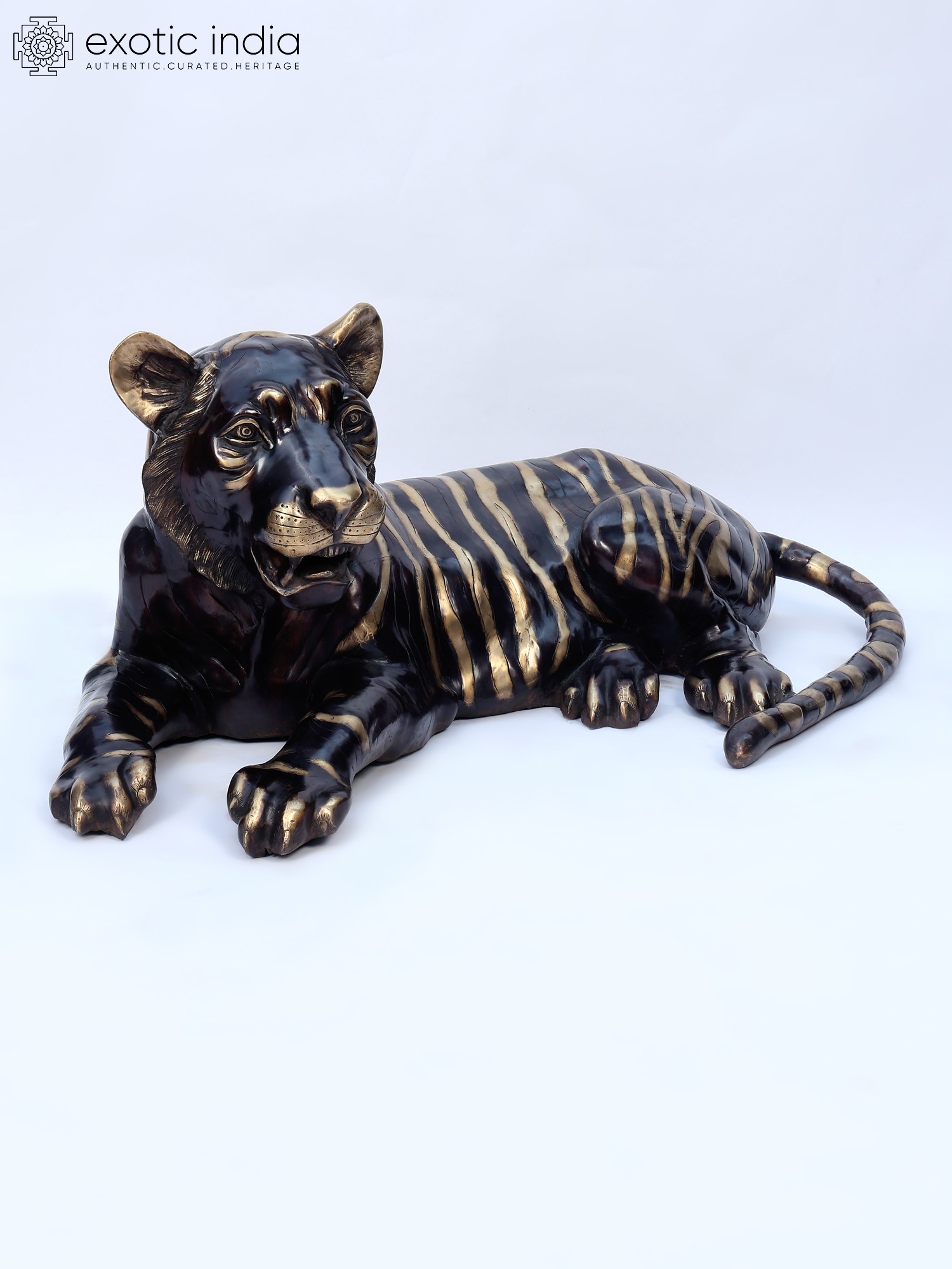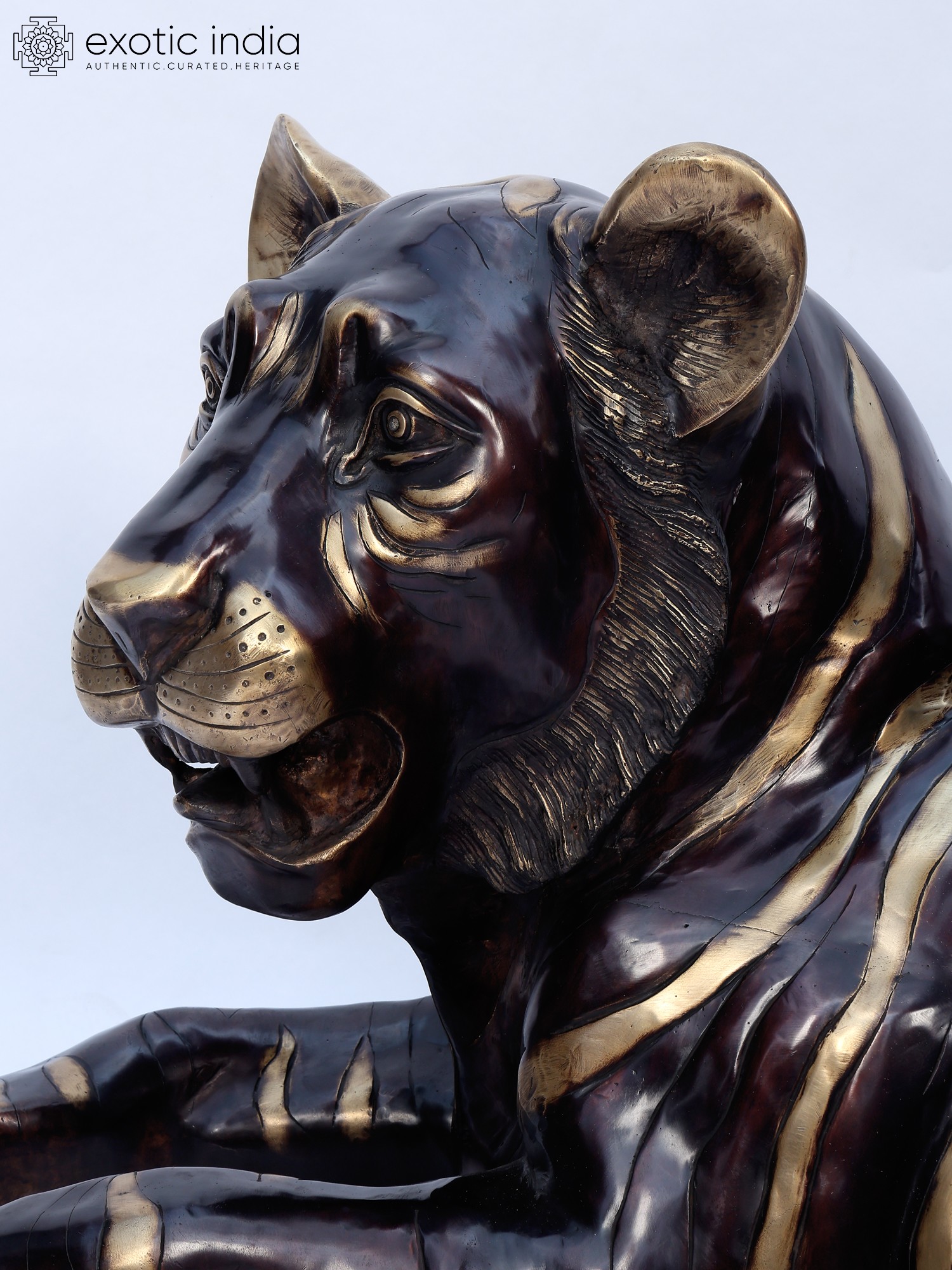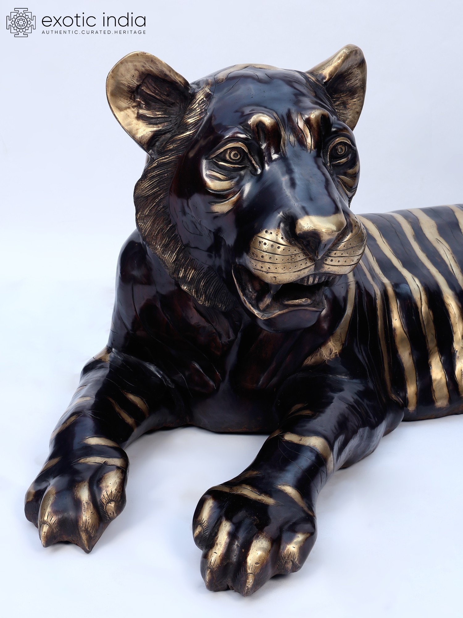 Introducing a breathtaking brass sculpture that captures the untamed spirit and regal presence of the tiger. This magnificent piece is more than just a decorative item; it's a statement of power, elegance, and the wild beauty of nature brought into your home. Crafted with meticulous attention to detail, the sculpture portrays a large tiger in a relaxed, resting pose, exuding an aura of calm authority. The deep, rich patina of the brass, contrasted with striking golden stripes, evokes the iconic markings of this majestic feline, making it a truly captivating work of art.