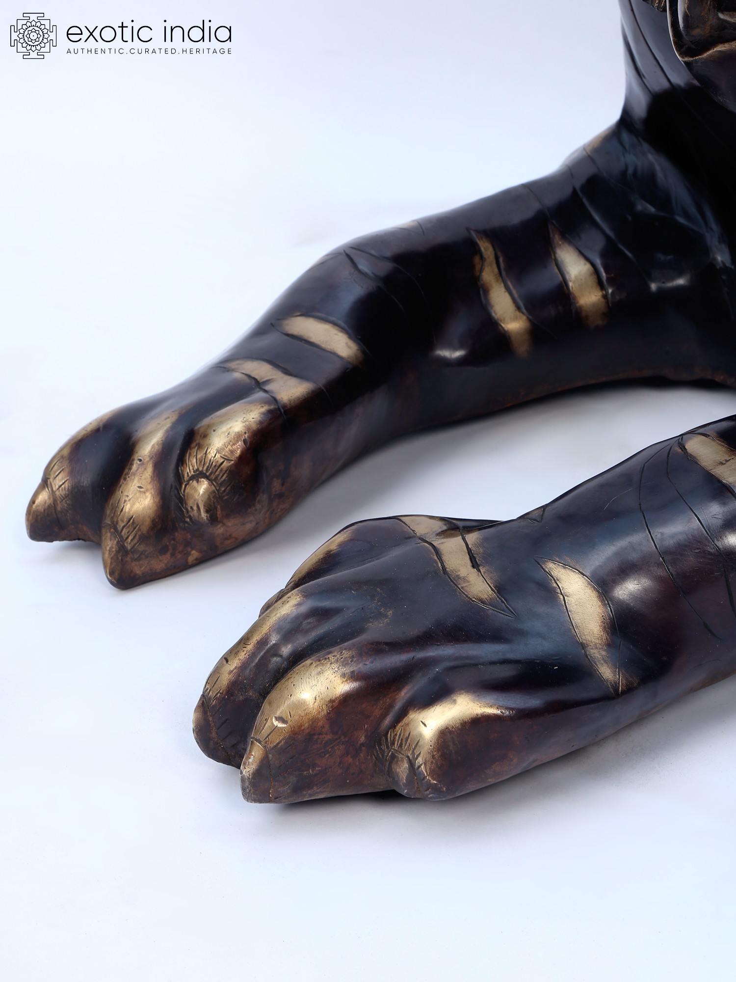 Forged from high-quality brass, this sculpture is built to last, promising to be a cherished centerpiece for generations. The artisans have expertly sculpted every curve and contour of the tiger, from the intense gaze of its eyes and the alert perking of its ears to the powerful musculature beneath its lustrous coat. The play of light and shadow across the brass surface enhances the realism and depth of the sculpture, bringing the creature to life. The striking contrast between the dark, polished body and the gleaming, hand-finished stripes creates a dynamic visual appeal that is sure to draw the eye.