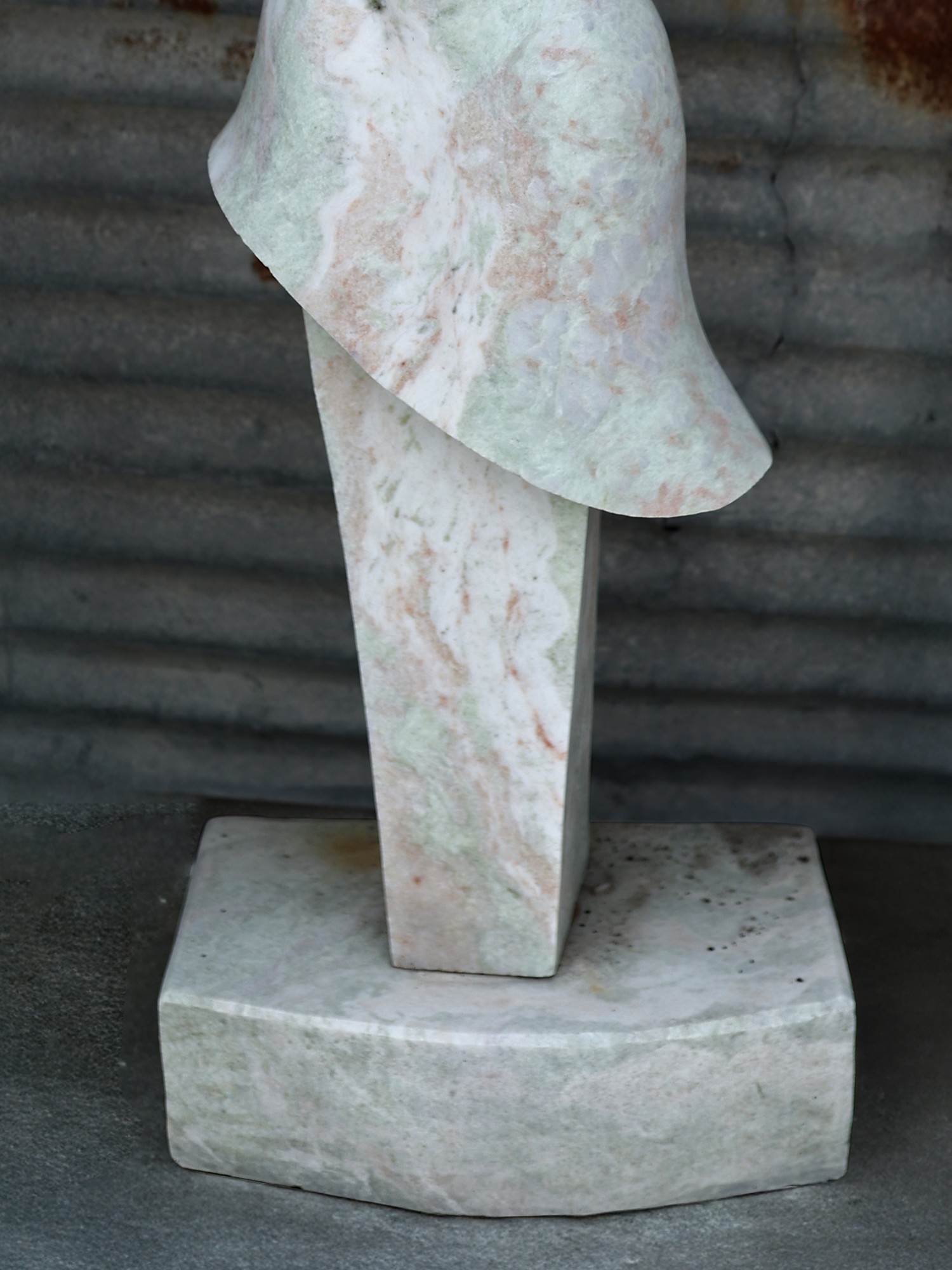 This striking sculpture, carved from natural marble, presents an evocative abstract representation of the female form. Standing tall at 54 inches, it commands attention with its graceful lines and dynamic posture. The artist has masterfully captured a sense of movement and anticipation, as if the figure is poised to embrace an unfolding moment or a celebratory occasion. The marble itself, with its swirling veins of soft greens and subtle pinkish-brown hues, adds a unique depth and character to the piece, making each sculpture a singular work of art. ––––––––––––––––––