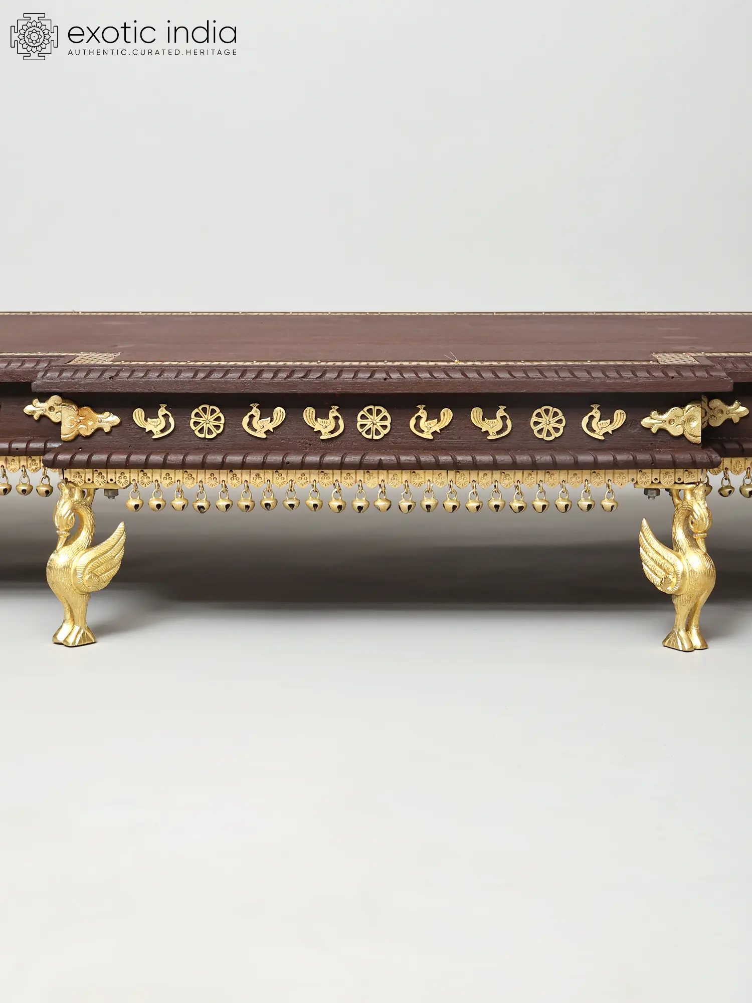 Measuring a commanding 54 inches in width, its expansive surface offers ample space for significant displays or group rituals. The platform stands at a stately 9 inches in height, providing an elevated presence without overwhelming your space. The striking design is further enhanced by the unique, stylized swan legs, wrought in polished brass, offering both sturdy support and an unmistakable touch of regal whimsy. Intricate patterns of floral and geometric motifs, along with miniature wheel designs, line the edges, adding layers of visual interest.