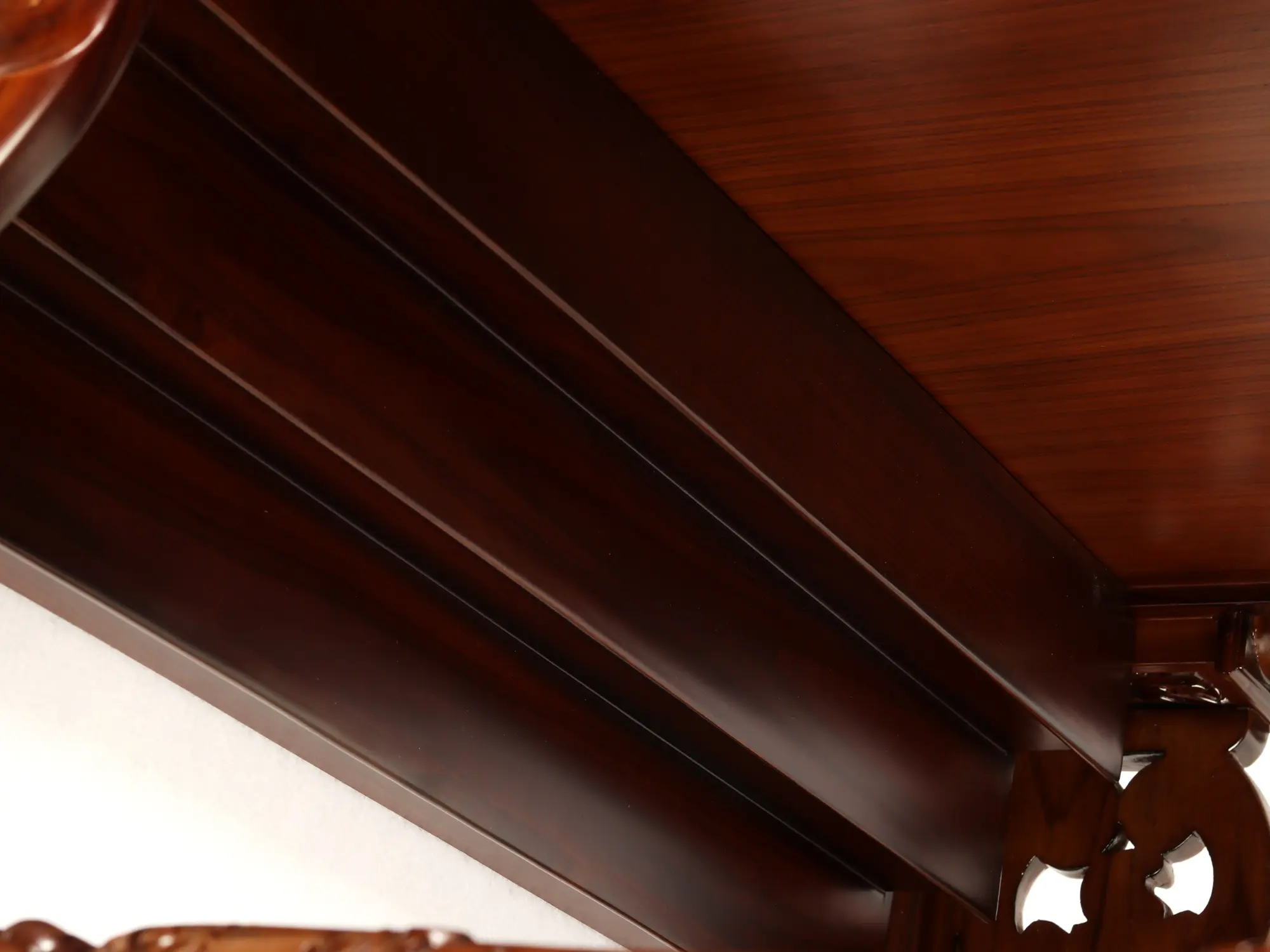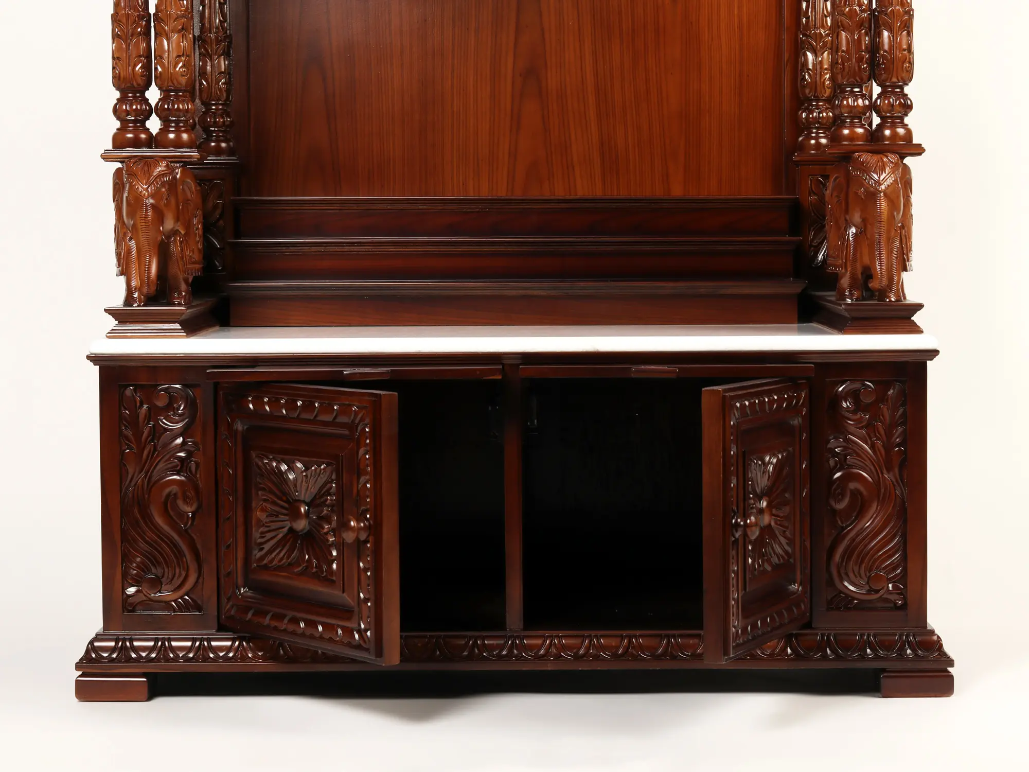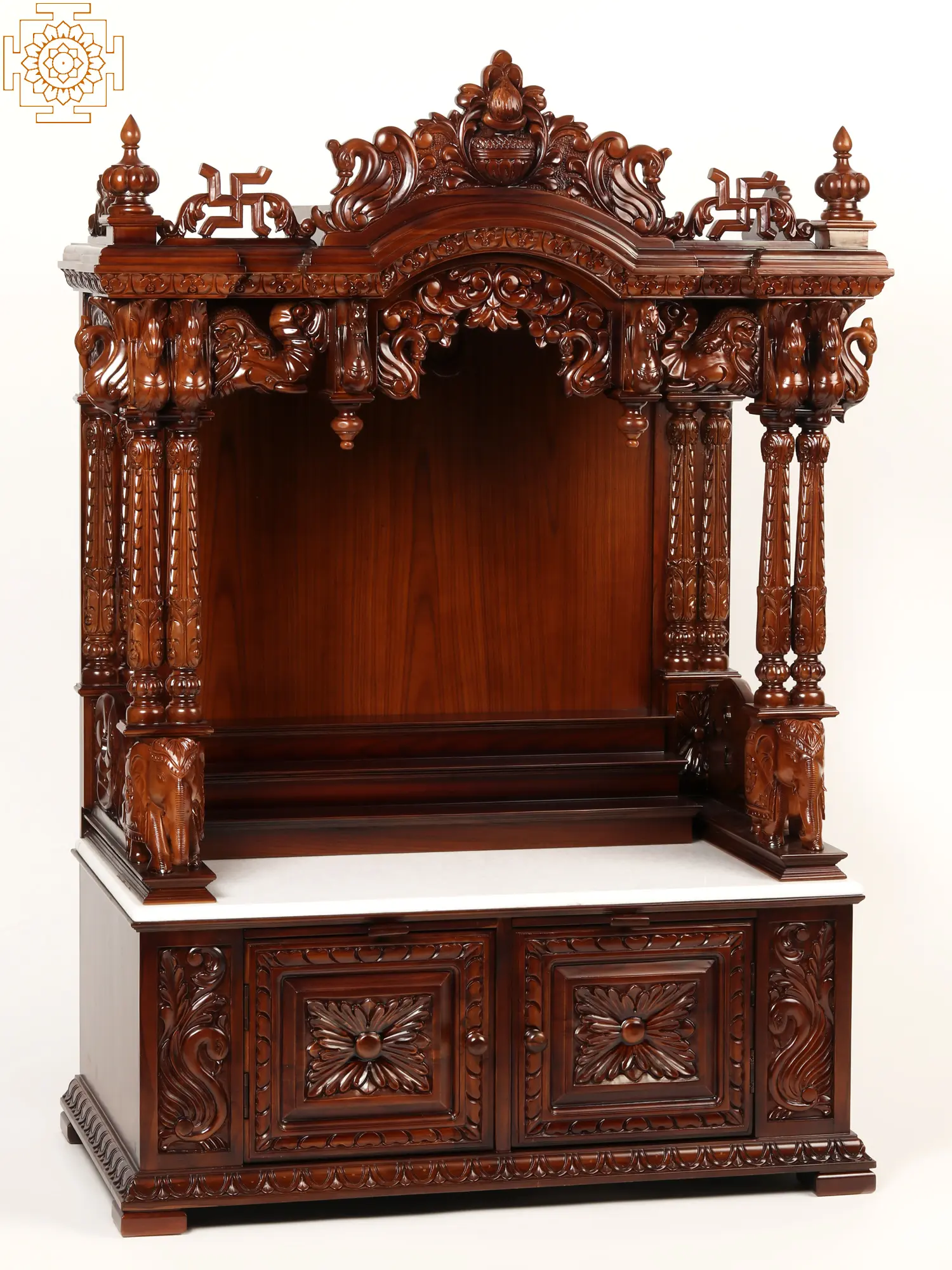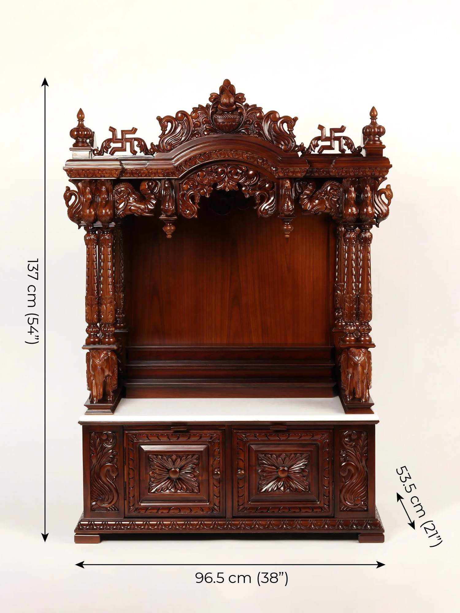 The Large Wooden Carved Designer Pooja Temple showcases intricate craftsmanship and exquisite design. This temple features a roof adorned with intricately carved elephants and peacocks, adding a touch of grandeur. The pillars of the temple are held by two beautifully carved elephants on their backs, symbolizing strength and stability. The temple also includes two small drawers at the bottom for storage, providing convenience for keeping pooja essentials. At the top, there is a Purna Kalash, representing abundance and prosperity, supported by two Swastika signs on either side, symbolizing auspiciousness and well-being. This temple serves as a sacred space for performing religious rituals and reflects devotion and reverence in the art of worship.