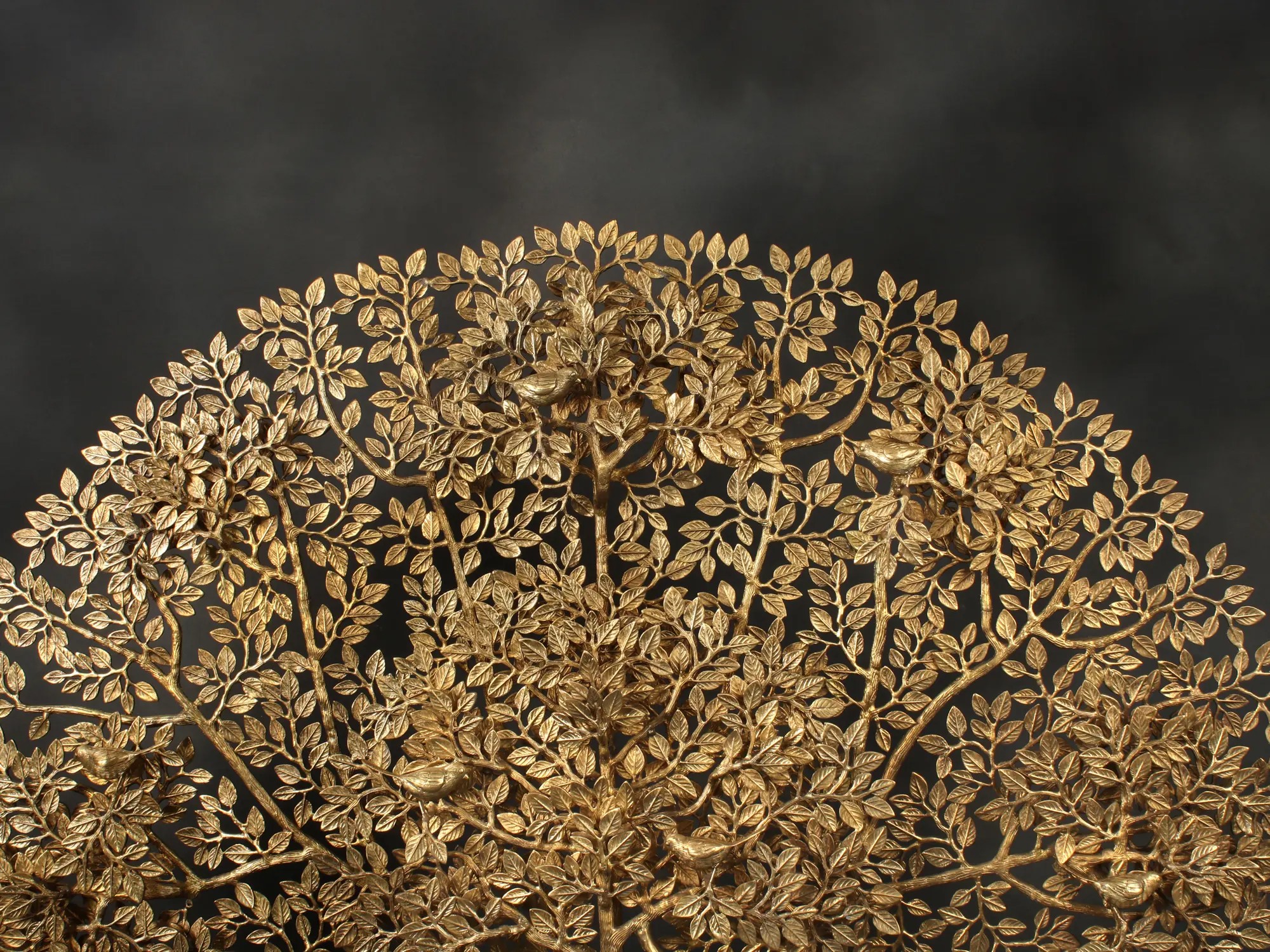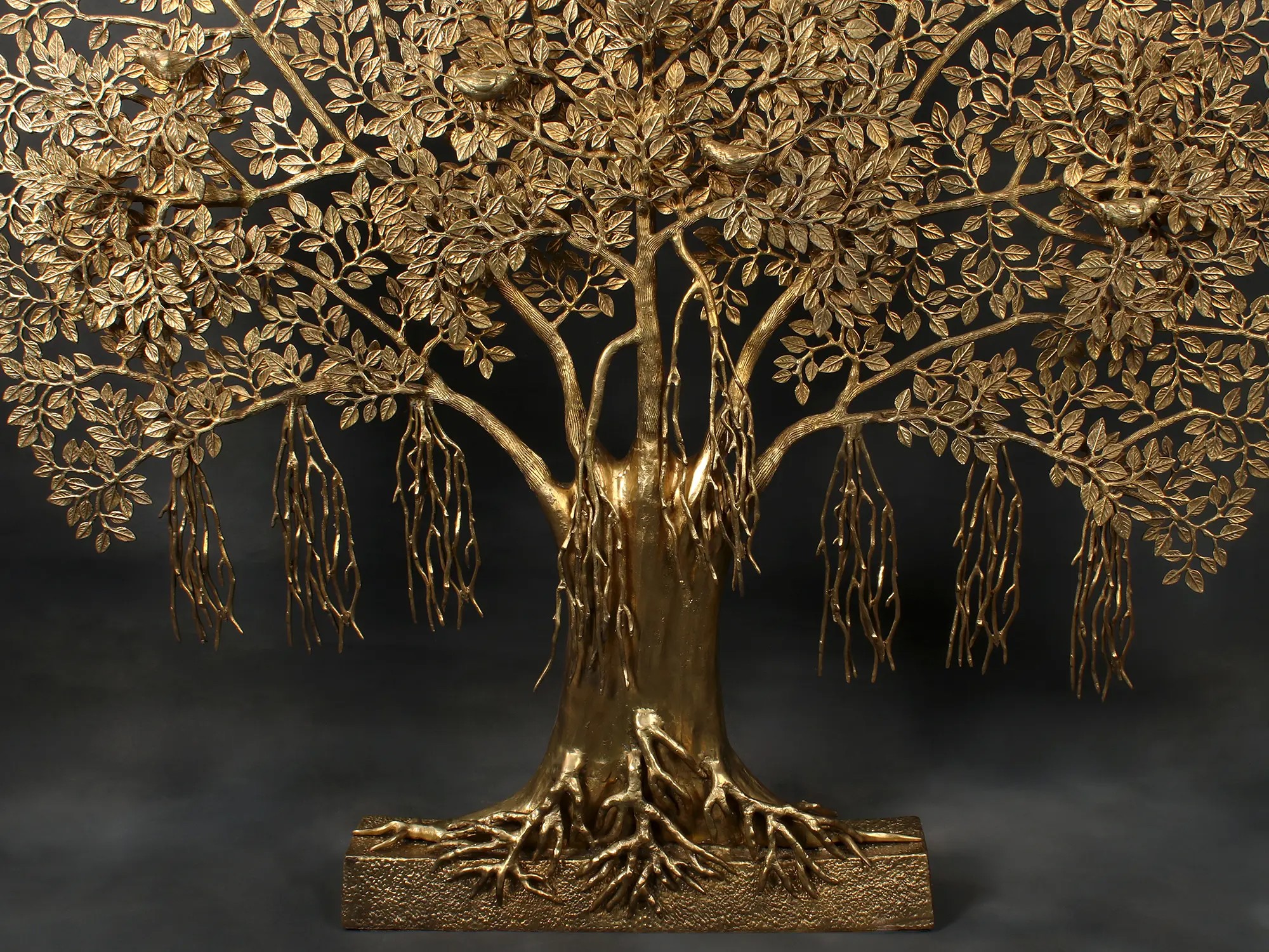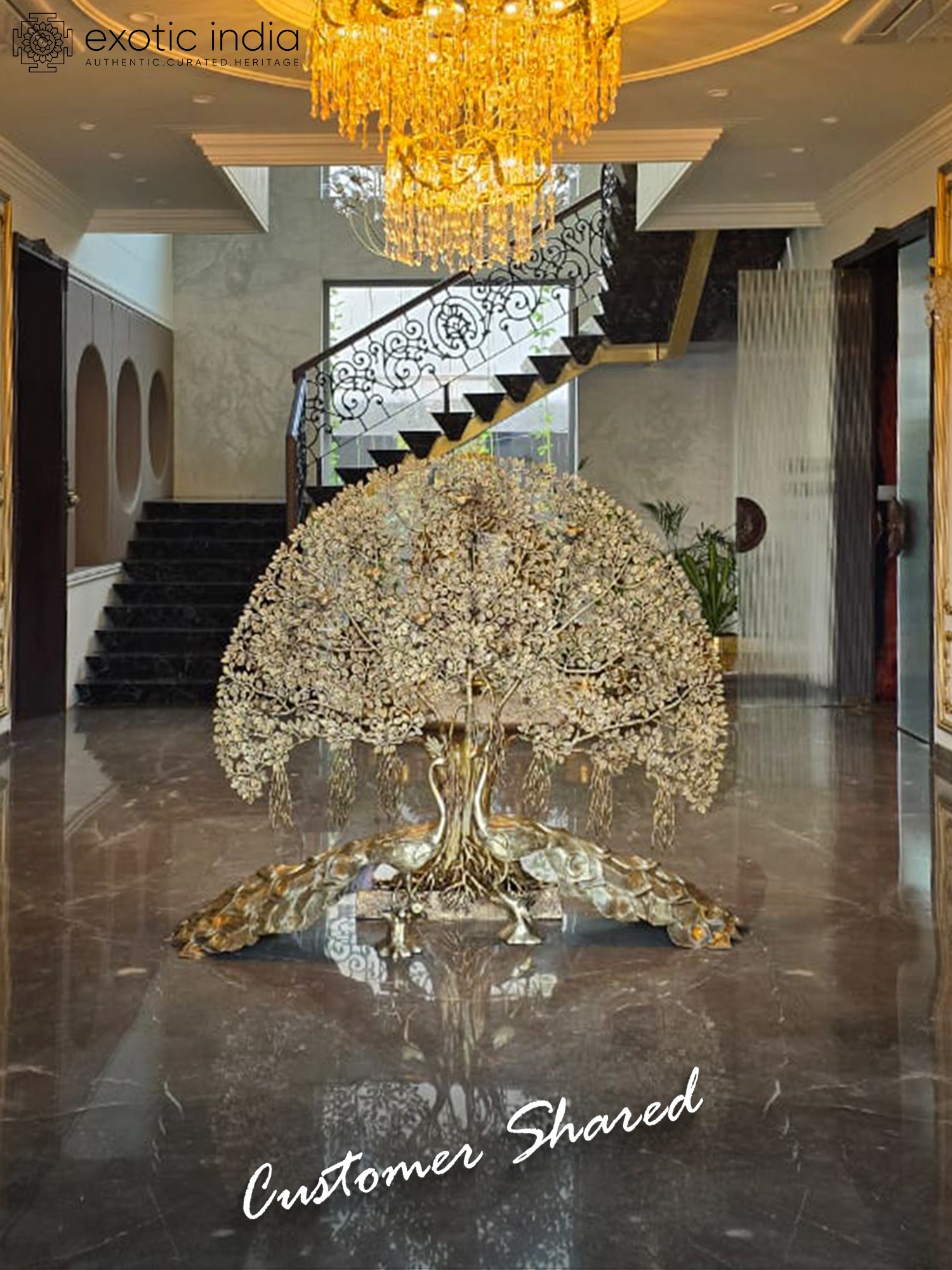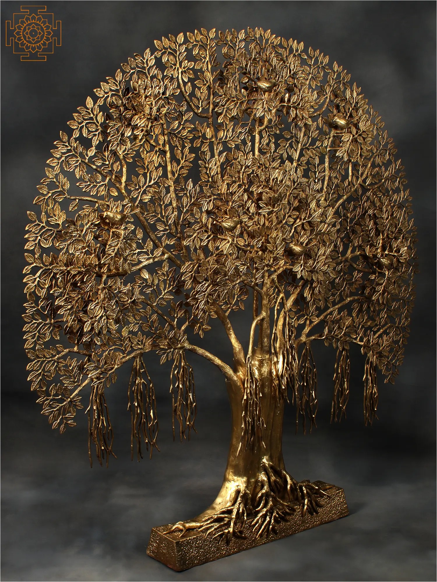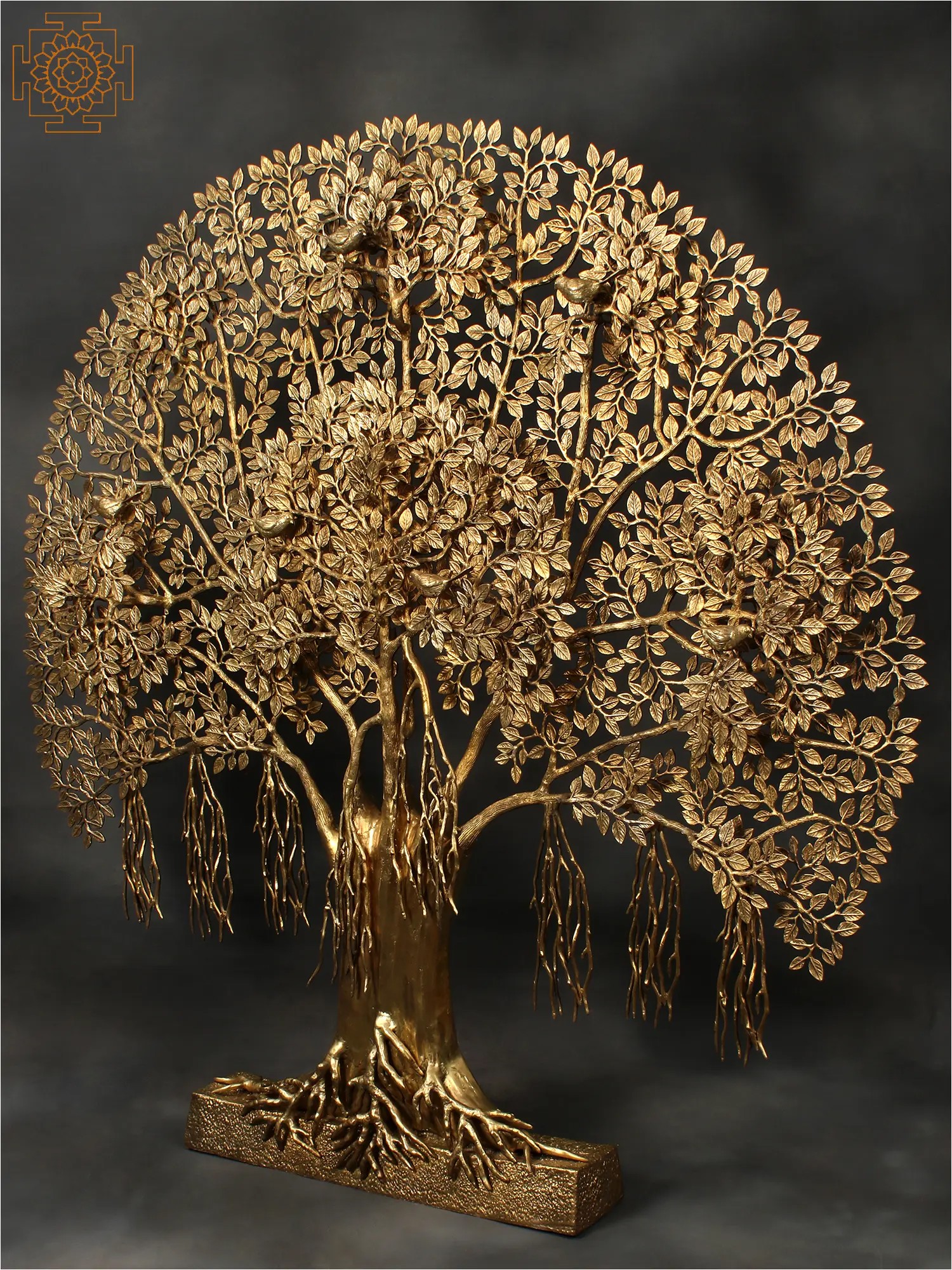 Trees a symbol of immortality are depicted in different art form with great reverence. This imaginary embodied in brass is the majestic definition of a big banyan tree with its roots swinging from its healthy branches. The artists have depicted birds dancing on the vigorous tree’s branches showing the harmony of nature. The shine of the brass metal on the leaves gives them a look of stars twinkling in their full glory. The trunk of the tree looks like a testament of the tree’s fierce battles with nature and time. The roots bulging gout of the soil symbolise the strong foundation that comes with knowledge. Viewers can enter a realm of quiet and beautiful scene of a dense forest with this stunning form. This masterpiece is no doubt a point where nature’s splendour merges with royal traces, eliciting the spirit of beauty, grace, and revitalization.