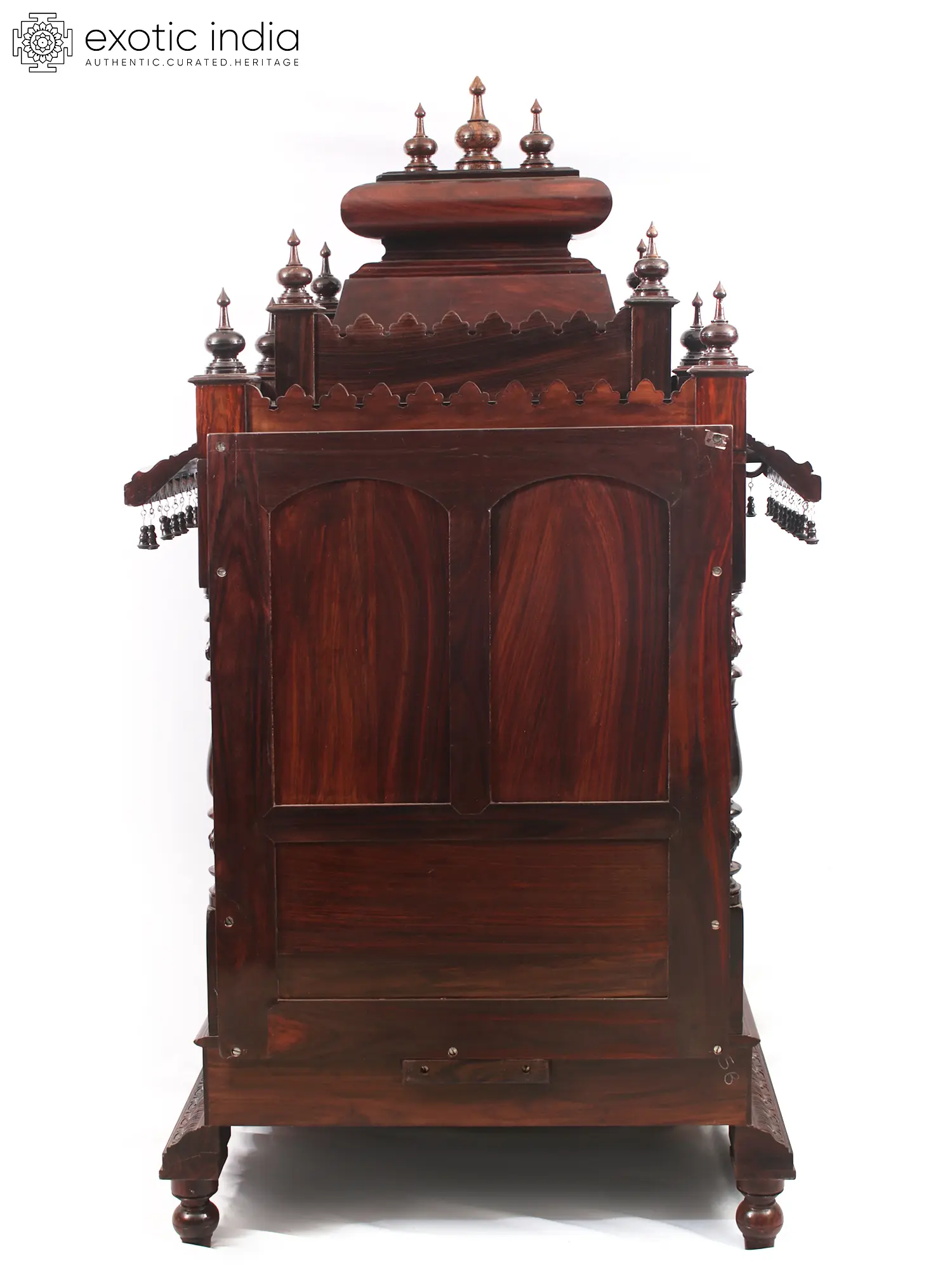 Small wooden temples hold immense significance in Indian homes, serving as sacred spaces for spiritual practices, and daily rituals. They contribute to fostering a sense of spiritual well-being, providing a dedicated area for prayer and reflection within the home. In most Indian homes idols of deities are placed on these altars, finely decorated and adored with flowers. The introduction of this Large Rosewood Carved Temple with a Single Drawer, adorned with a small Kalash on the shikhara and bells attached to the roof, amplifies this role.