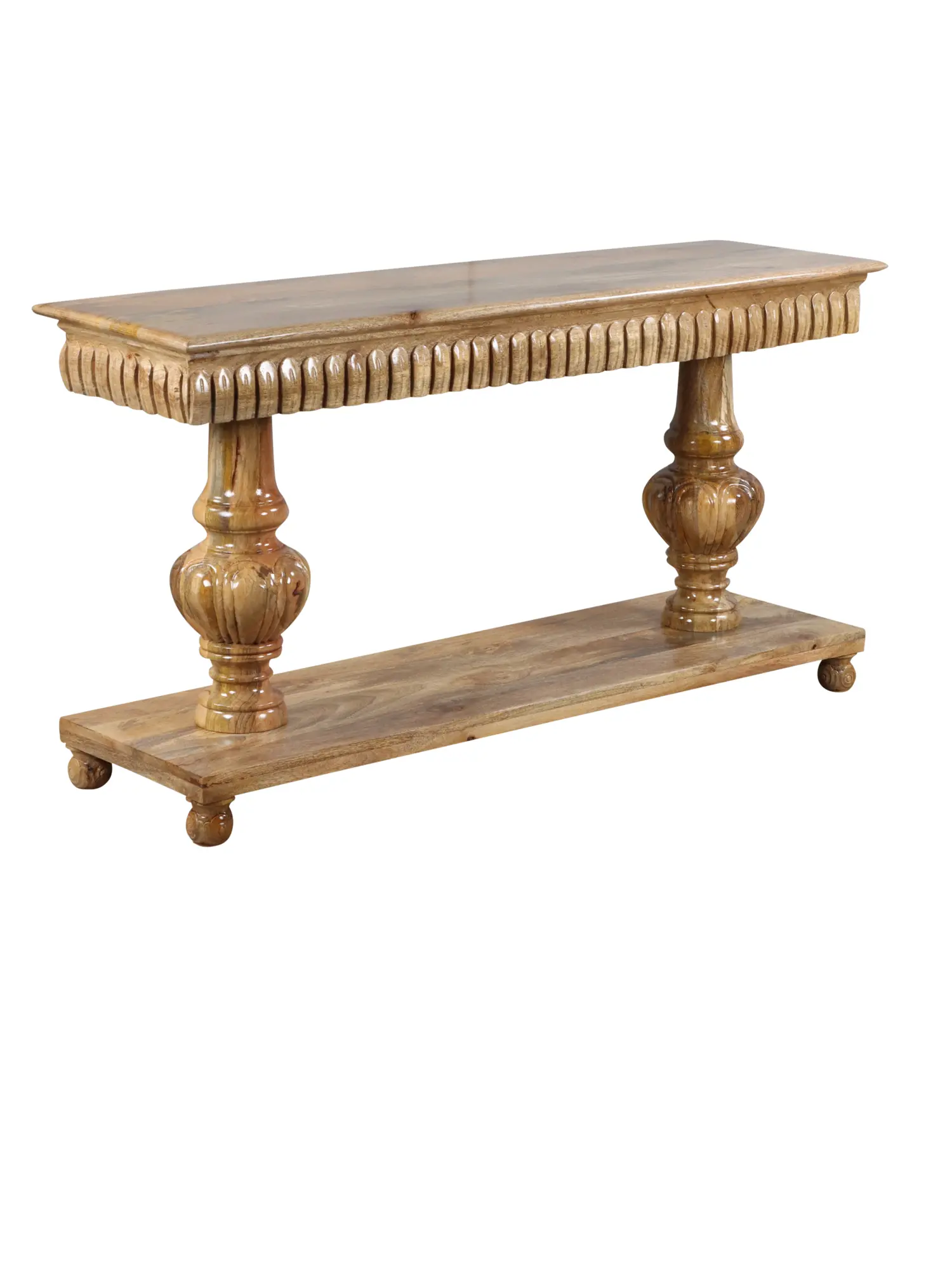Beyond its ornate surface, the table's two-storeyed structure offers practical utility, providing ample space for displaying cherished decorative items in a beautifully curated arrangement. Whether showcasing prized artifacts or housing beloved trinkets, this table serves as a showcase for your unique sense of style and refinement.