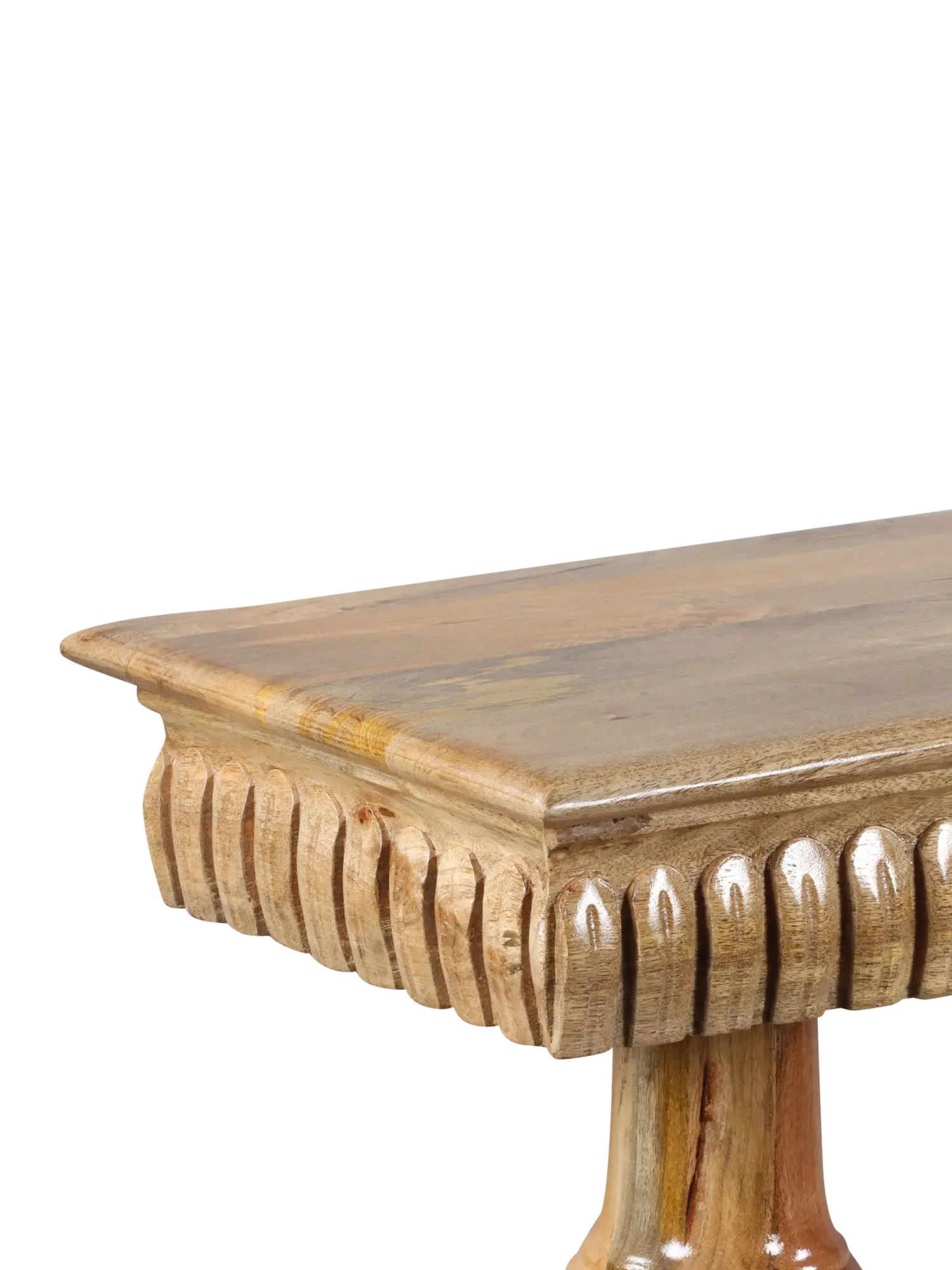 The engraved rectangular tabletop of this Mango Wood Decorative Table for Home is reminiscent of the exquisite furniture adorning the courts of kings and queens and exudes regal sophistication and artistic craftsmanship. Each intricately carved detail like the round structured stands with the image of an inverted lotus tells a story of grandeur and opulence, inviting you to bask in the splendor of bygone eras.