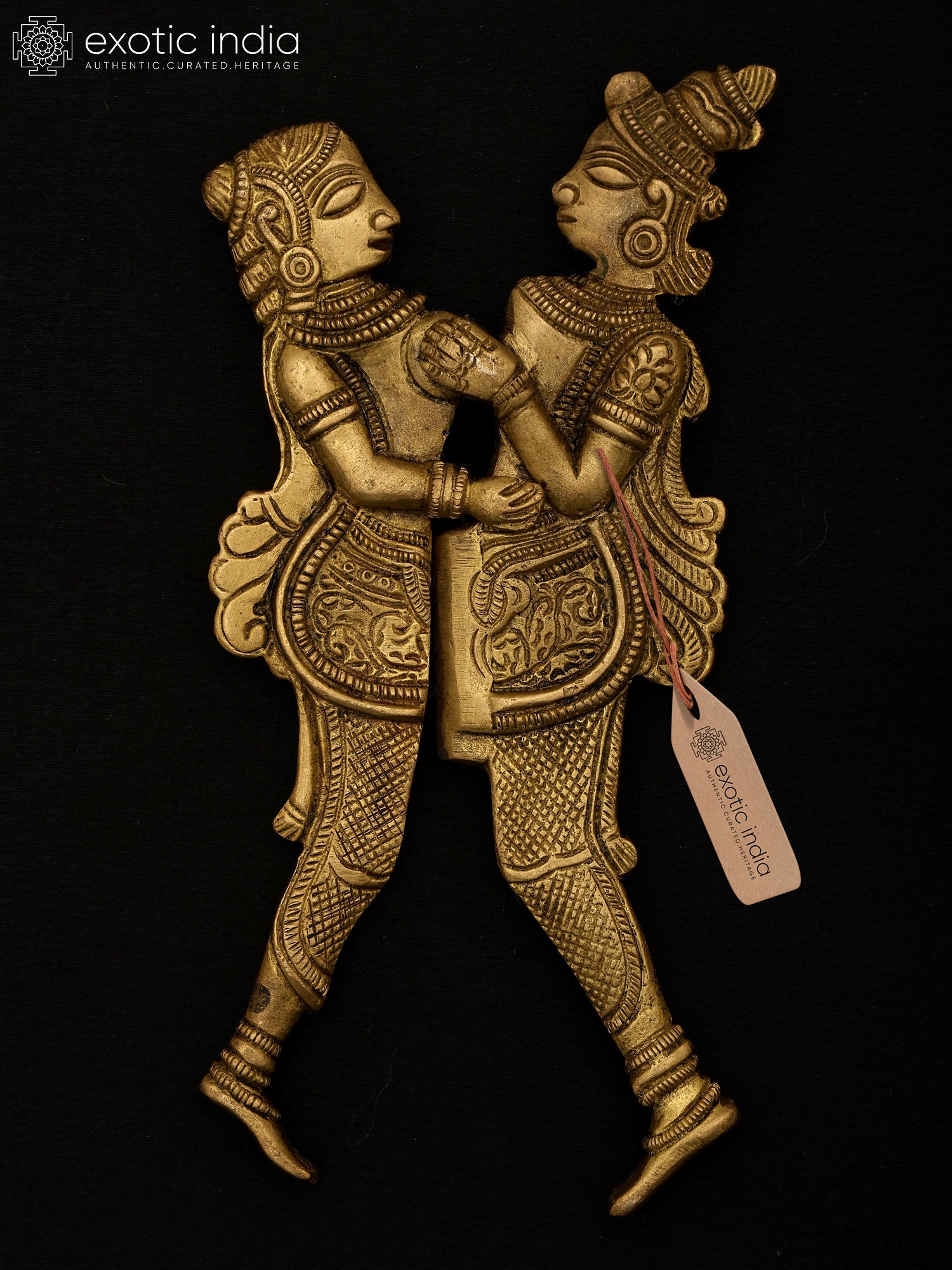The design is rich with symbolism, featuring a couple rendered in a style reminiscent of ancient art forms. Note the meticulous attention to detail in the figures' attire, their expressions, and the overall composition. The brass construction ensures durability and longevity. Beyond its practical use, this piece serves as a decorative element that can elevate the aesthetic of any space. The warm, golden tones of the brass complement a variety of interior design styles, adding a touch of elegance and sophistication. The craftsmanship ensures that this will be a cherished item in your home for years to come.