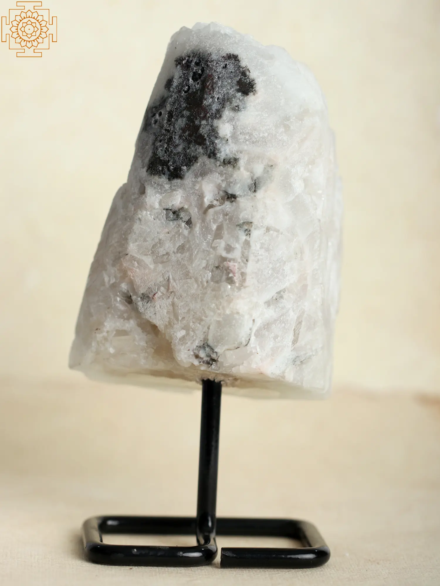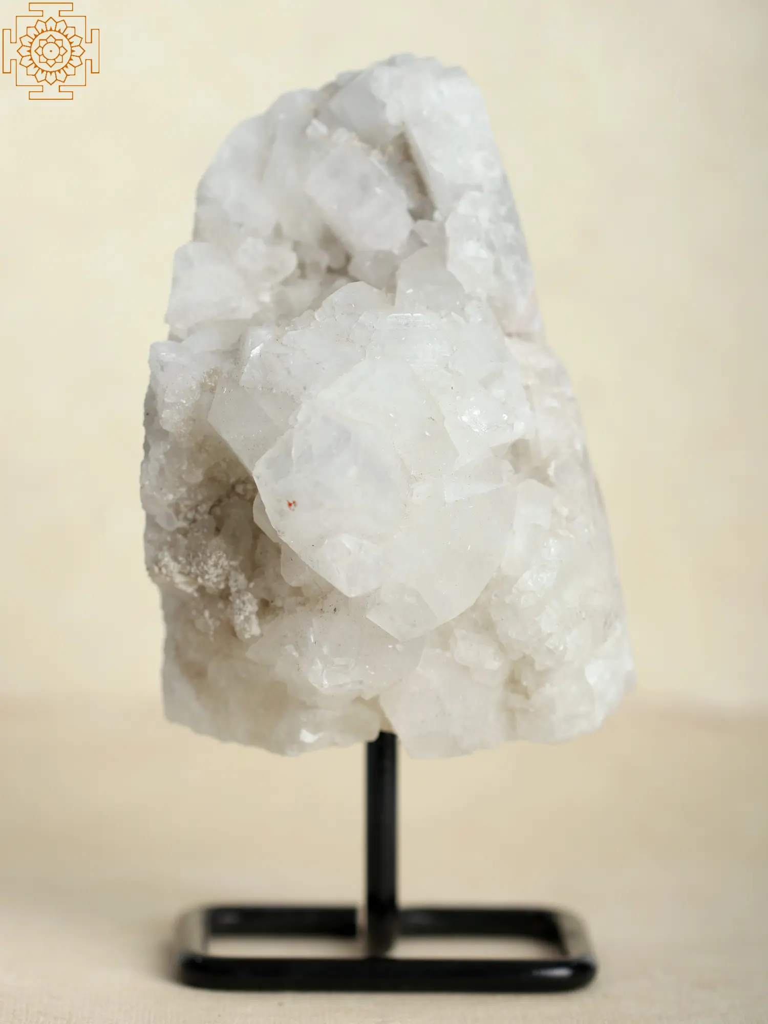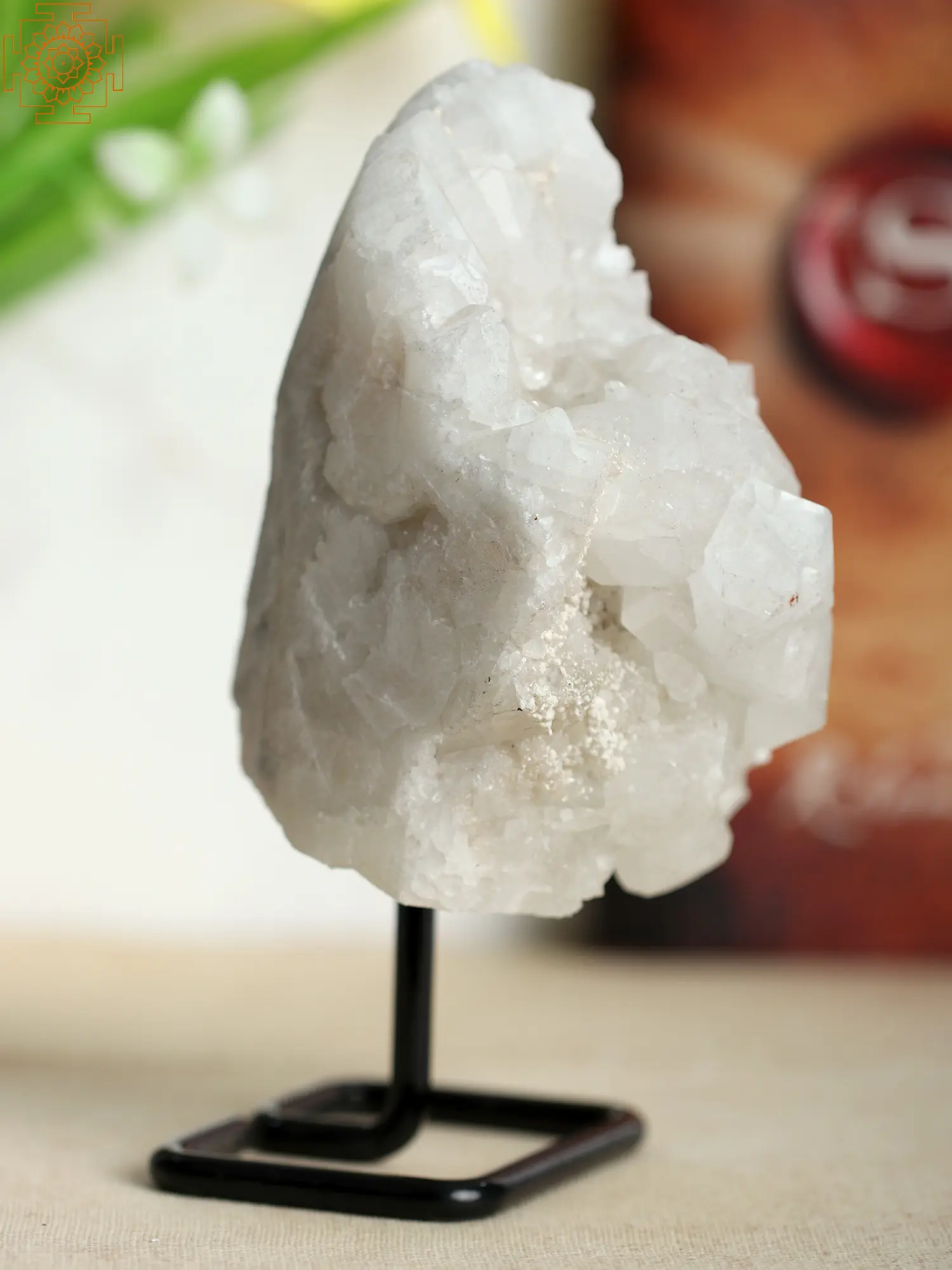 This Apophyllite Geode Gemstone Showpiece, accompanied by an elegant iron stand has been specially designed to grab eyeballs and elevate the style of your table decor. This exquisite piece showcases the natural beauty of apophyllite crystals, creating a stunning geode formation. The gemstone's delicate translucency and sparkling facets make it a mesmerizing focal point. Resting on a sleek iron stand, it adds a touch of modern sophistication to any setting. It introduces a captivating blend of nature and contemporary design into your space allowing the radiant energy of apophyllite to infuse charm and elegance into your surroundings.