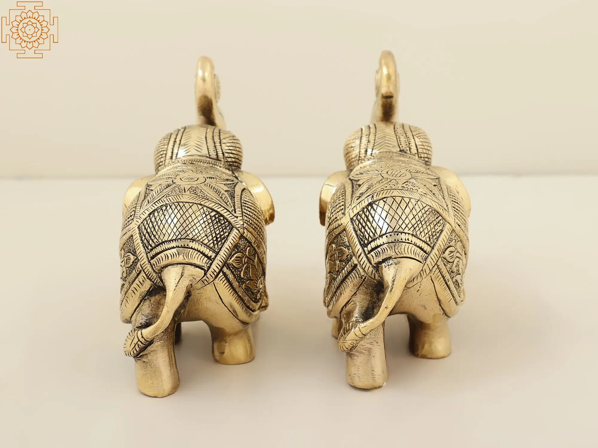 This handmade, Brass royal pair of elephants with their jugular, husky trunks lifted upward, keeping some lucky secure article in Namaskar gesture appears charming. Their raised backs and heads have been festooned by an impressive carpet hugely and minutely carved with lotus flowers and shapes. The strong legs, stretched and lengthened ears, and cheerful large faces have further enriched the paired majesty. According to Feng Shui and Vastu, the decorative paired elephants statue should be put in the foyer or entryway of your office or home to bring happiness, wealth, and positive vibes.