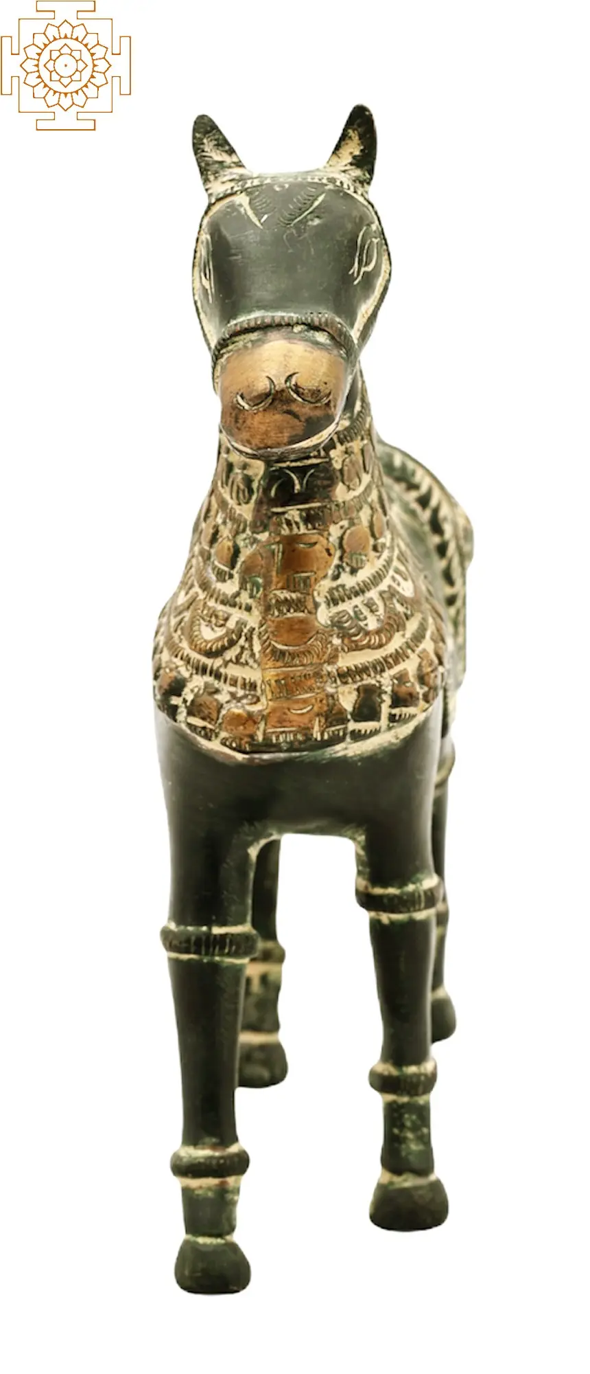 Since immemorial, horses, or ashwa, have been a symbol of regality and grandeur. The Asahwamedha Yagya is mentioned in several ancient scriptures, including the Ramayana and Mahabharata. Horses have been suggested as prominent people's transportation. They have a place in the most magnificent Indian art because of their role. Horse statues can be considered guardians of temples and vital structures. This brass monument honors the bravery and grace of the Ashwa or horse. It has a green patina hue, indicating the piece's ancient status. The horse is adorned with lovely engravings depicting the horse as a royal messenger of powerful people. This statue symbolizes regality and wealth, and placing it might bring the exact attributes.