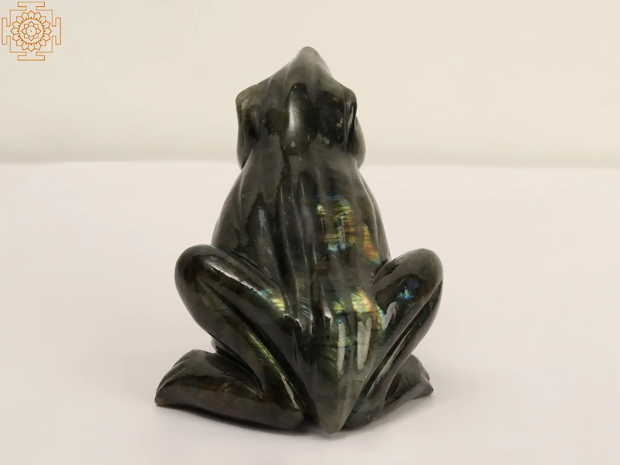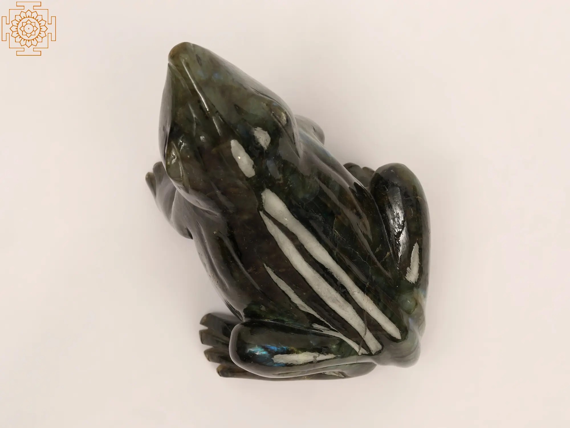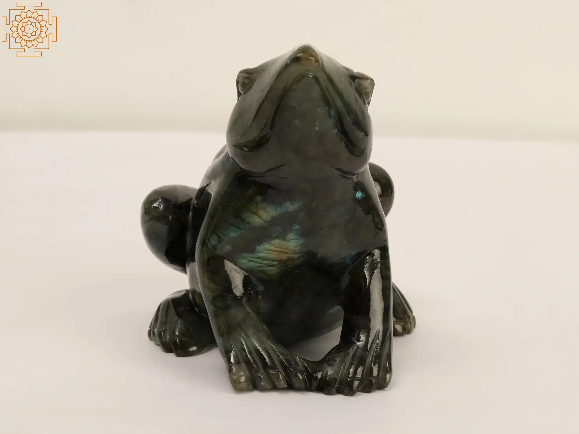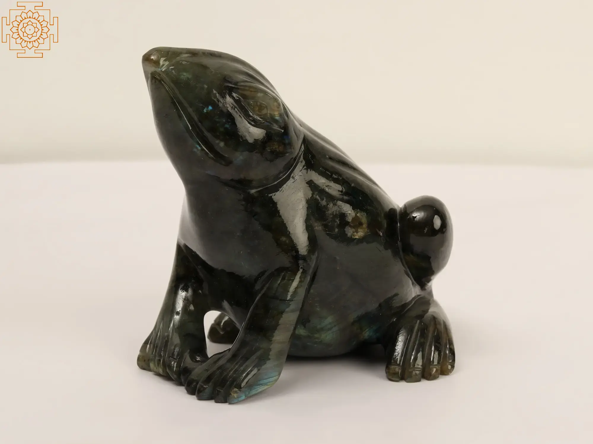 Crafted from high-quality Labradorite, this frog figurine is a moving image of the mesmerizing beauty of nature. Labradorite, an enchanting intermediate plagioclase, forms the exquisite backdrop, and its magical white streak unveils a silicate masterpiece. Exhibiting labradorescence, the figurine radiates an iridescent optical dance, celebrating the stone's unique charm. Paying homage to the profound role frogs, or manduka in Sanskrit, play in nature and Hindu mythology, the statue exudes elegance. With a poised stance and a body aglow with Labradorite's lustrous sheen, the frog symbolizes ambition and growth in this enchanting tribute to the natural world.