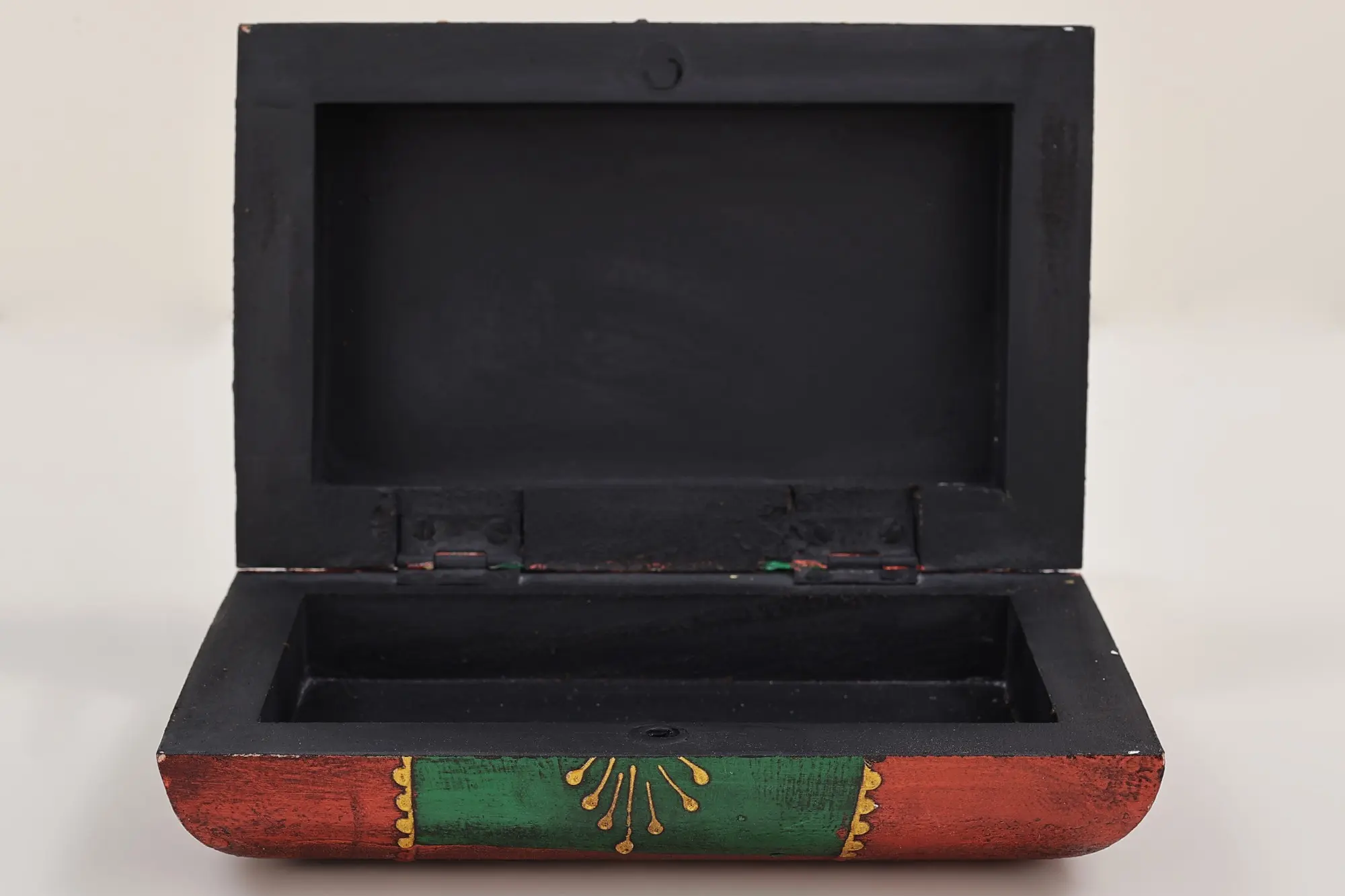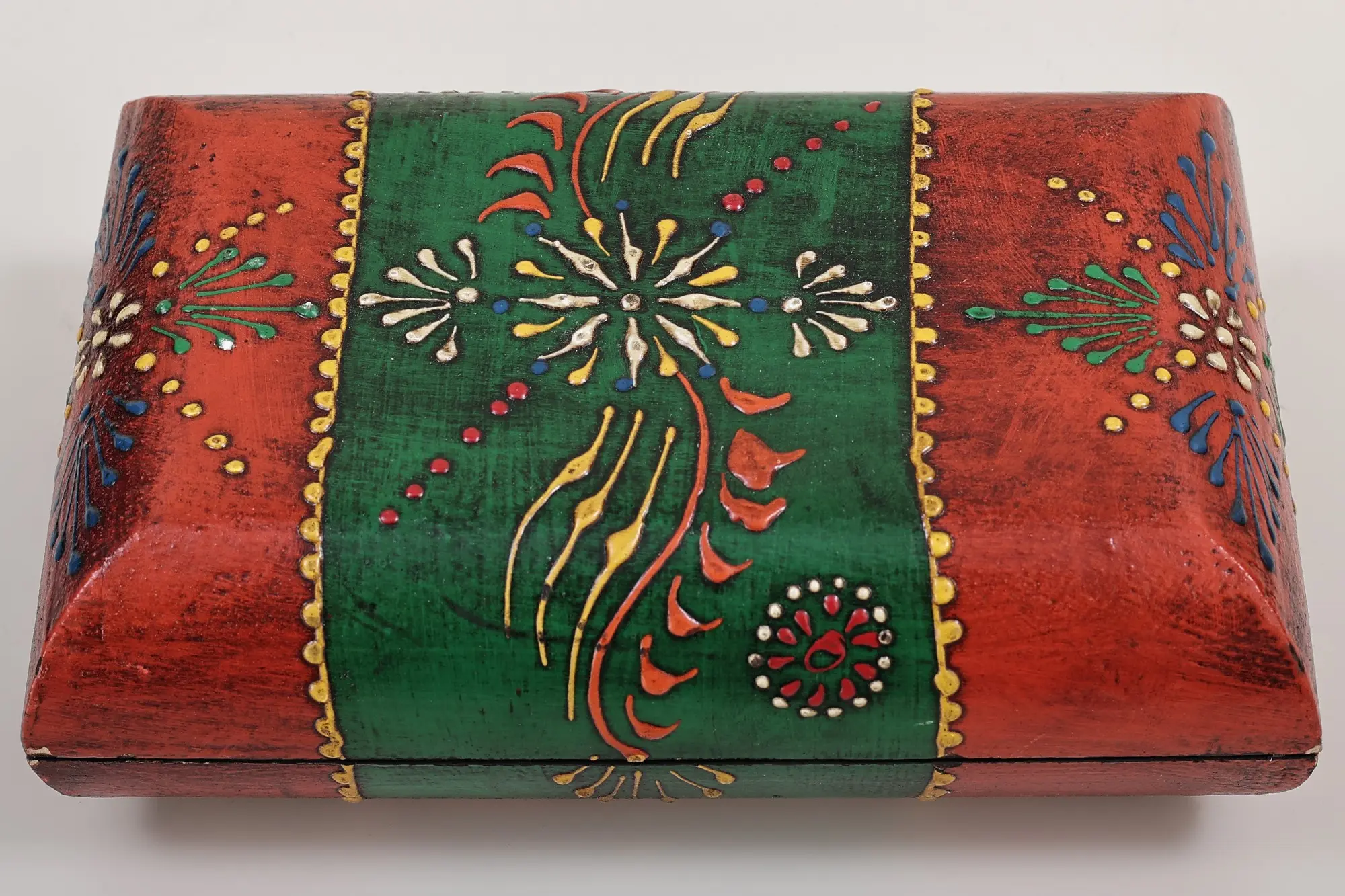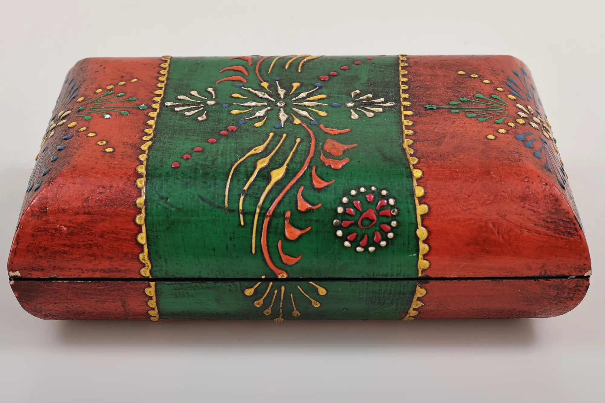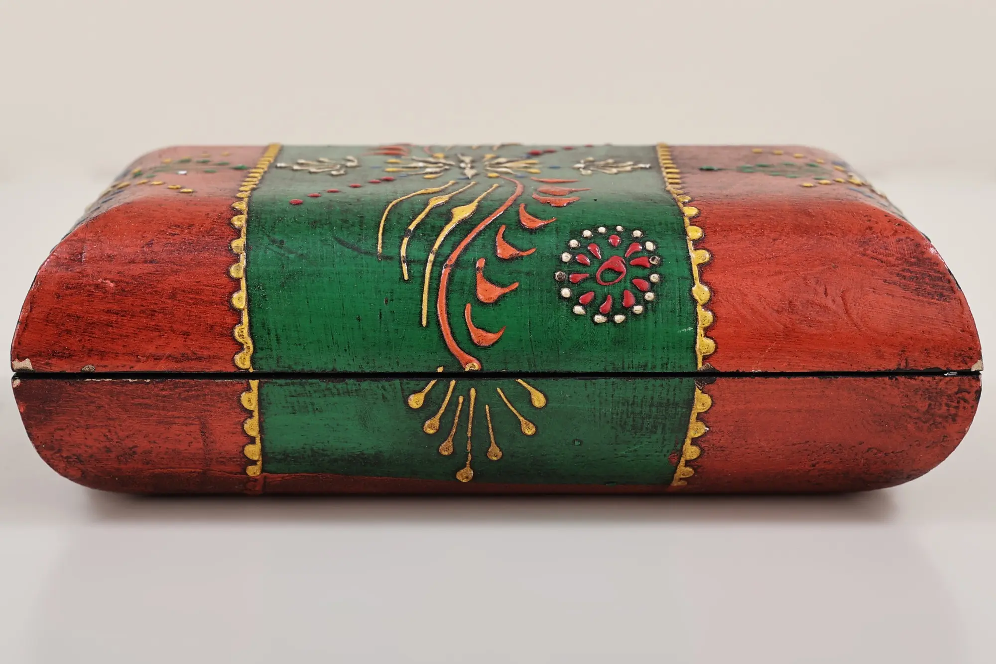 This Hand Painted Decorated Box is meticulously crafted from mango wood. Designed for storing small treasures, this box boasts a vibrant palette of green and red, instantly brightening any space. Adorned with the enchanting Jodhpur style, intricate white patterns, and lines form captivating floral motifs, adding a touch of cultural richness to each piece. Beyond their functional appeal, these hand-painted boxes are a visual feast, seamlessly blending utility with artistic expression. Elevate your storage solutions with these charming mango wood creations that bring the timeless elegance of Jodhpur's furniture painting tradition into your home.