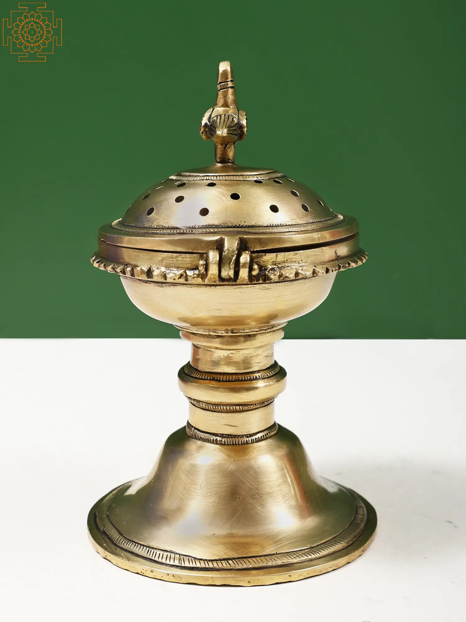 The brass construction promises durability and radiates a warm, golden glow. Its compact size makes it a practical and elegant accessory for aromatherapy rituals, infusing spaces with a soothing ambiance. Beyond its utilitarian purpose, the small brass incense burner stands as a testament to the traditional craftsmanship, combining functionality and aesthetics in a delightful piece that enhances both the olfactory and visual experiences.