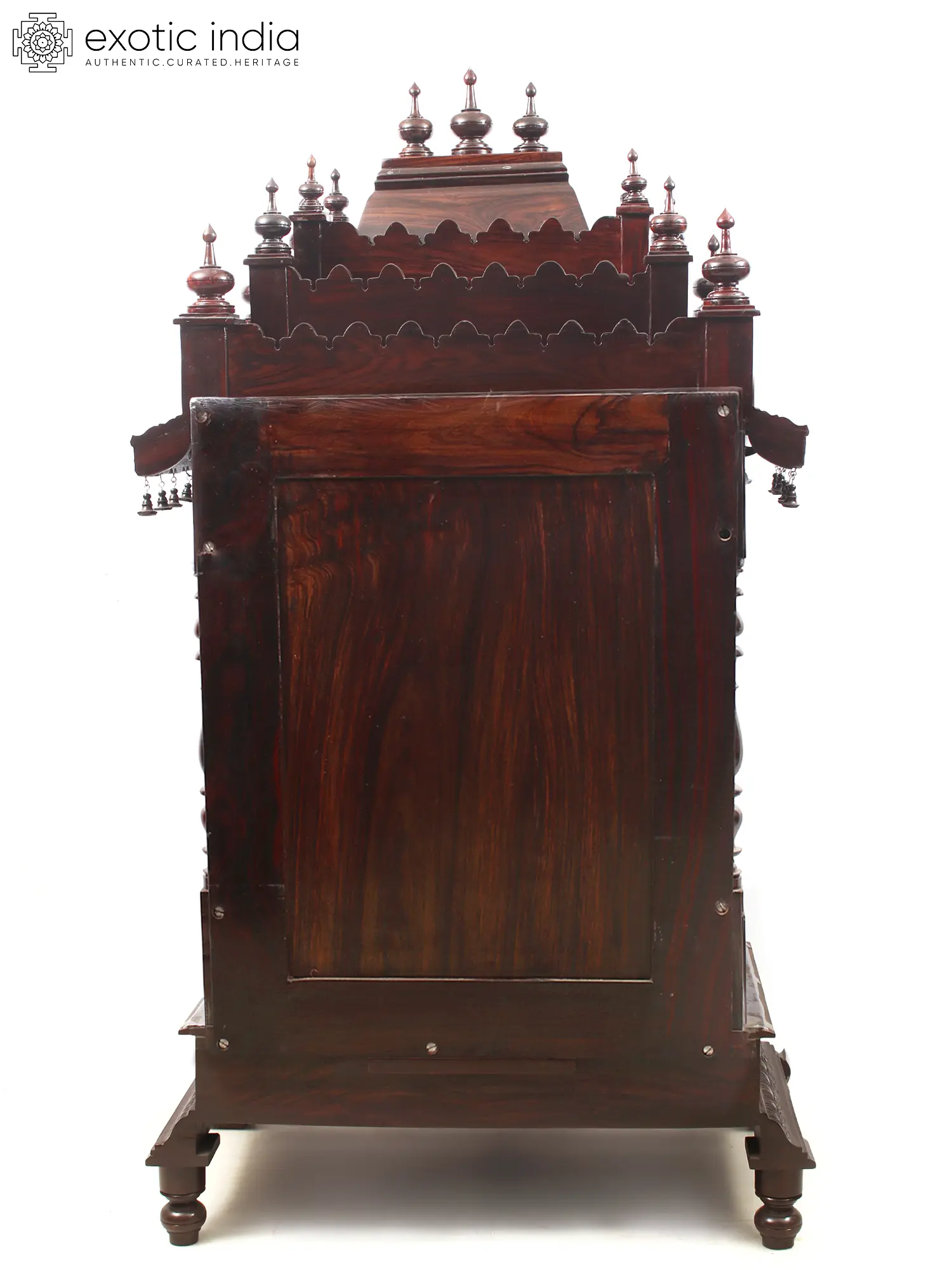 This Large Designer Rosewood Temple with Lord Tirupati Balaji and Goddess Padmavati Inlay Work serves as a magnificent focal point for daily worship in Indian homes, preserving and enhancing the tradition of spiritual devotion. Its dark brown hue and intricate inlay work featuring Lord Balaji, Goddess Padmavati, Lakshmi, Saraswati, Ganesha, Hanuman, Garuda, and Gajalakshmi create a divine ambiance.