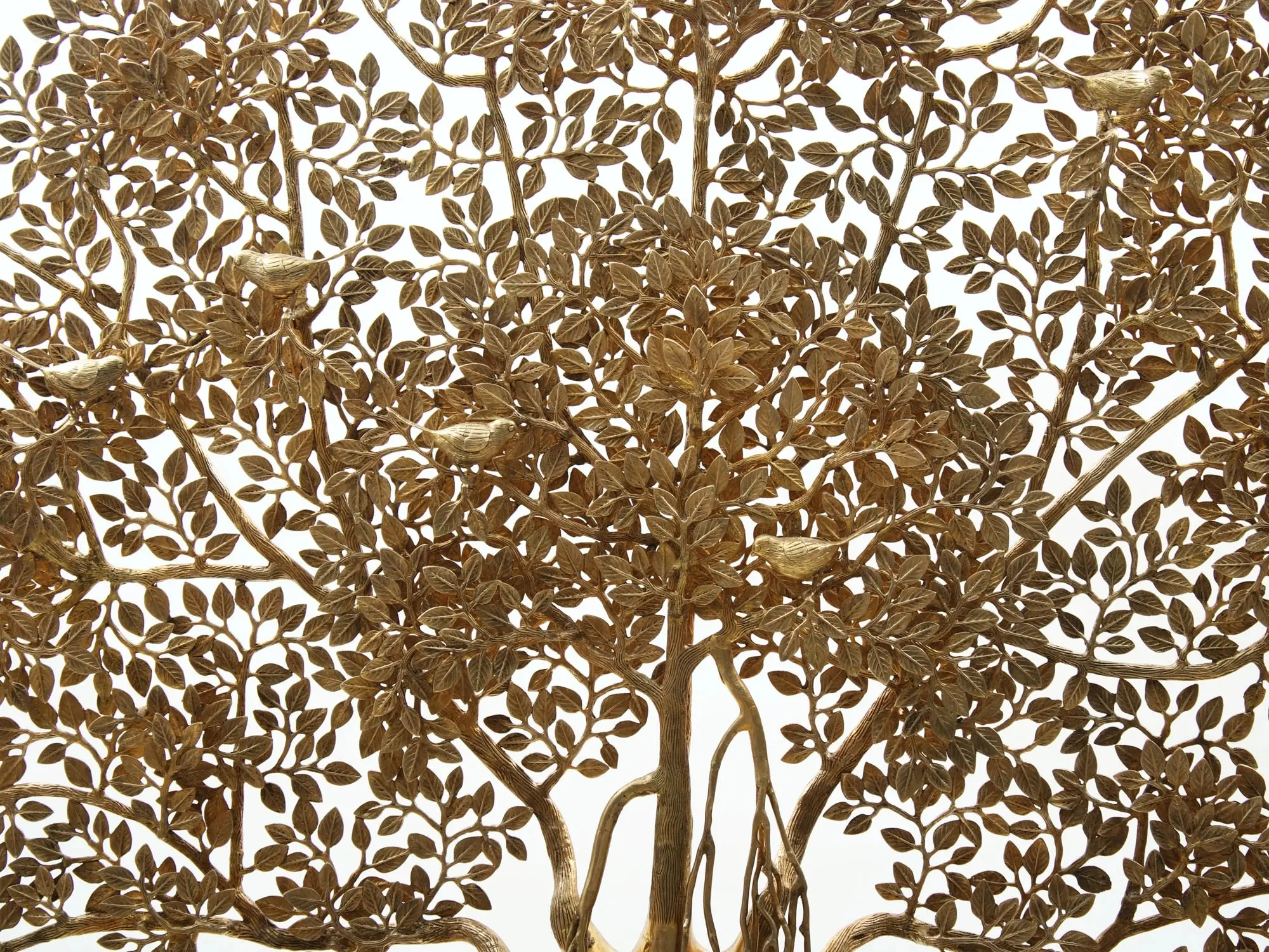 This Brass Tree of Life is a rich opus dedicated to the royal splendour of the Aswatha tree. It is handcrafted with extraordinary expertise and features a harmonious blend of brass, a long-lasting material, and natural beauty. The body of the tree is depicted accurately, with the powerful roots reaching downwards to join the sacred soil. Brass-colored birds perch gracefully on the branches, adding to the scene's magnificence.