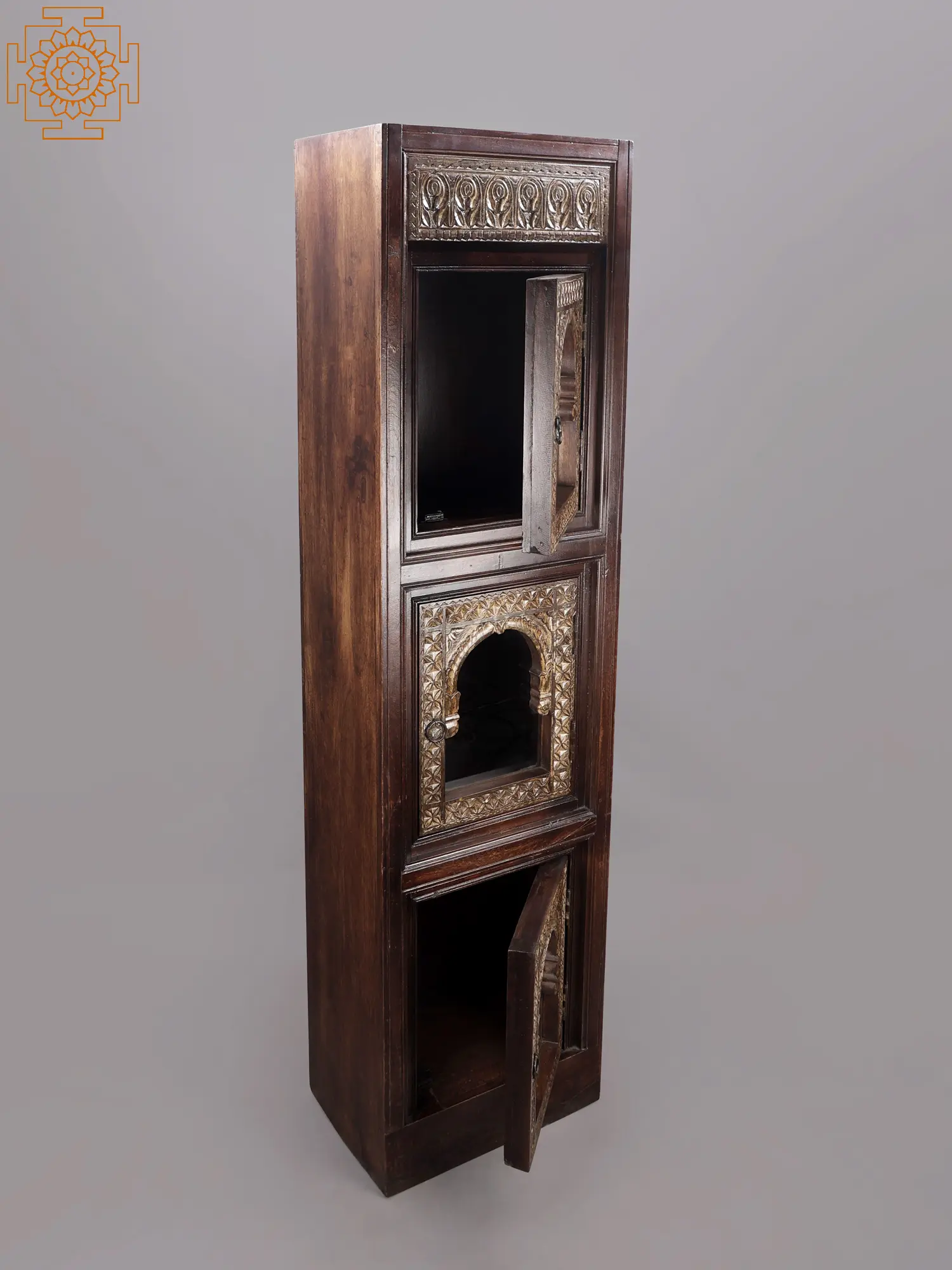 This Vintage Wooden Cabinet exudes timeless elegance with its slender silhouette and three Jharokha-style doors. The regal touch is heightened by the silver-painted frames adorning the doors, adding a sense of opulence to the dark brown finish. The intricate detailing and the Jharokha design, reminiscent of traditional Indian architecture, evoke a sense of old-world charm and cultural richness. This vintage cabinet is not merely a storage solution but a statement piece that transcends functionality, transforming any space into a regal haven.