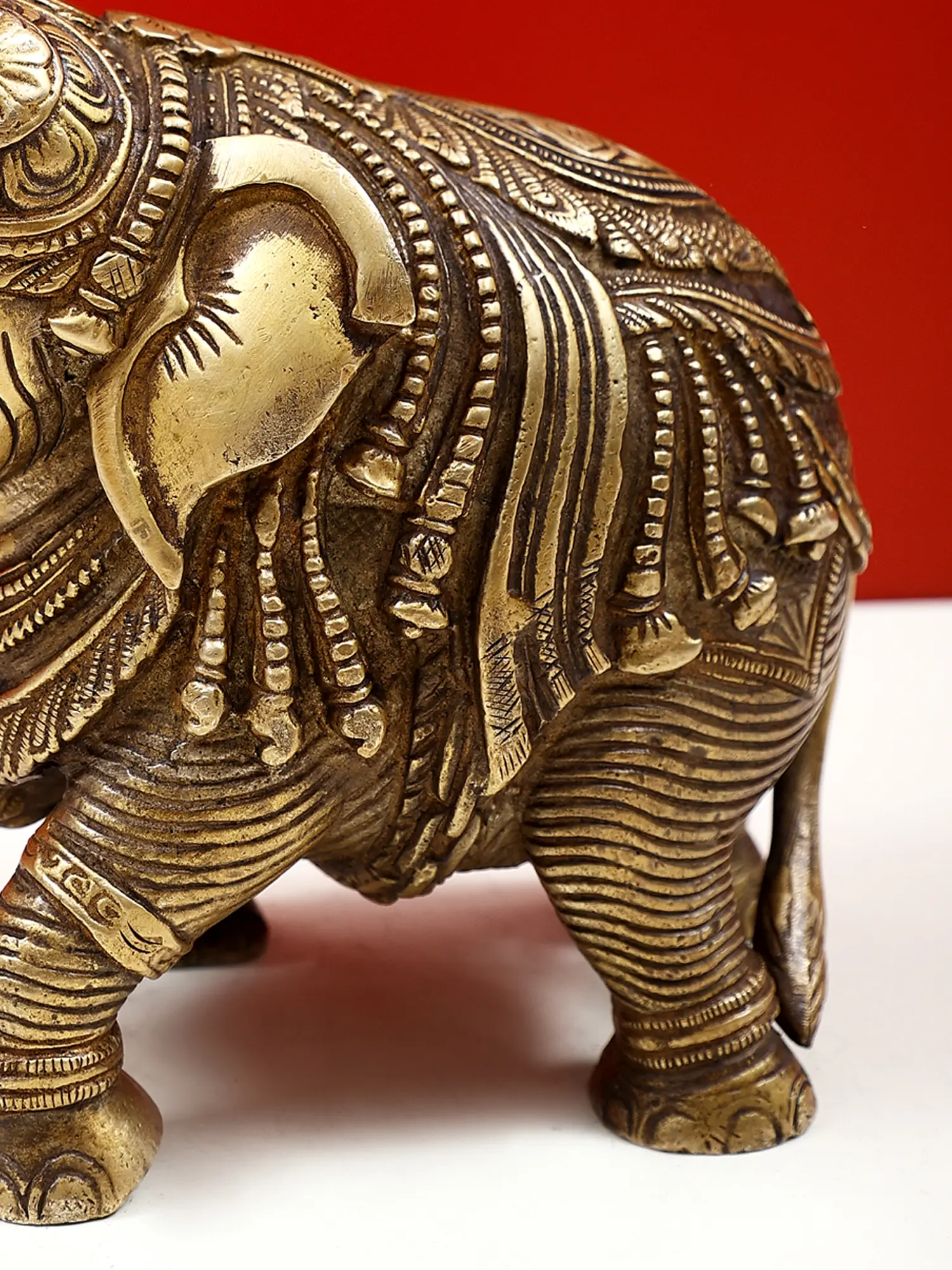Every inch of this brass elephant is adorned with intricate engravings that tell a story of tradition and artistry. Delicate patterns, reminiscent of fine jewelry and traditional textiles, are skillfully etched into the brass, creating a visually stunning and tactile experience. From the detailed tusks and expressive eyes to the textured folds of its skin and the ornamental coverings adorning its body, each element is rendered with remarkable precision. The subtle variations in the brass's patina add depth and character, highlighting the handcrafted nature of this piece. This level of detail makes the statue a true work of art, suitable for display in any discerning home. ––––––––––––––––––––