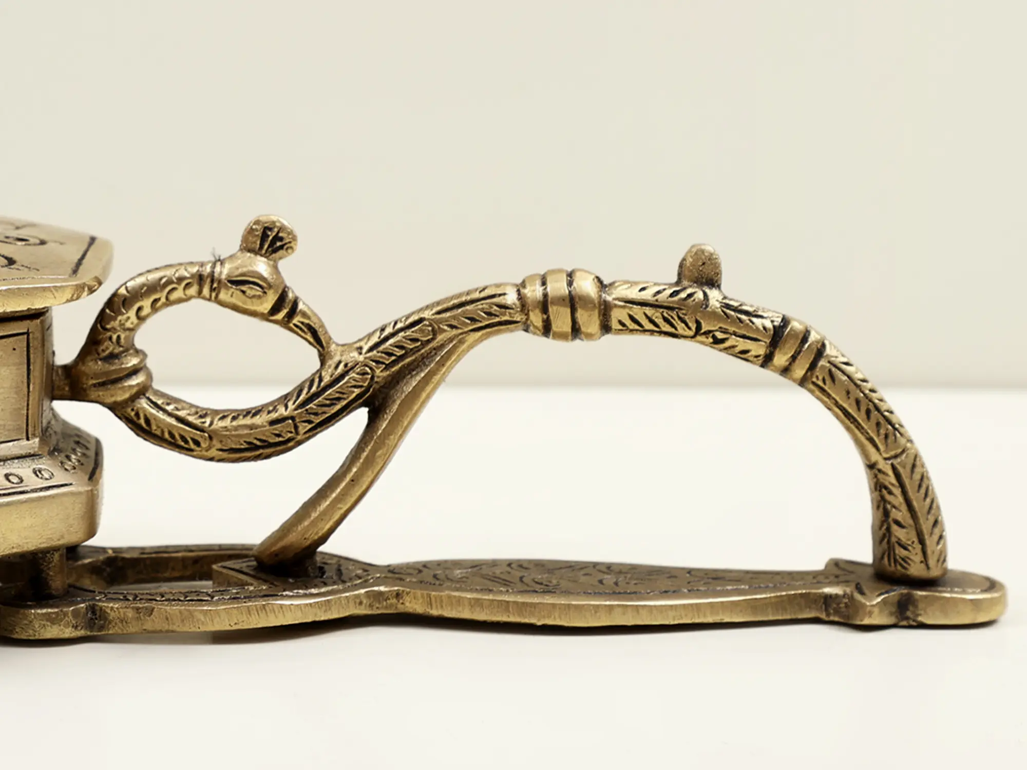 Dhoopdani, the traditional incense burners from India are an aromatic piece of heritage. This artistic brass incense burner, for instance, is crafted with ethnic details and peacock motifs, adding a luxuriousness to its make. The lid of the Dhoopdani is marked by a peacock perched on it, and the handle is formed like a stylized peacock, marvelously bending to form the grip of the Dhoopdani. Tiny feet of the Dhoopdani provide support for its placement, and the bowl is sculpted with ample space for incense and medicinal herbs, which burned in this incense burner, will transport you to a space of serenity and bliss.