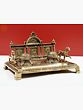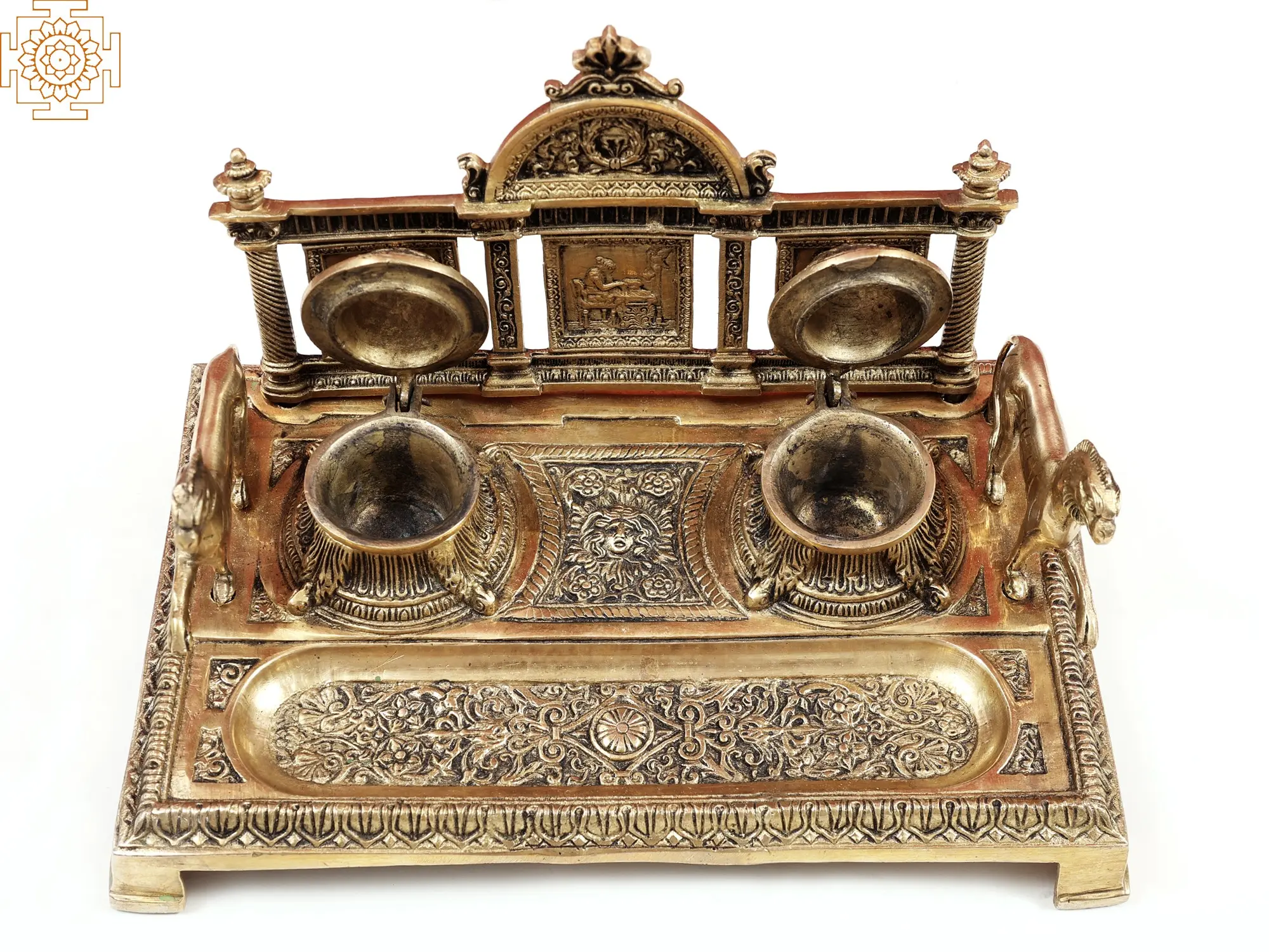 Unleash a touch of regal etiquette onto your writing desk with our Handmade Brass Two-Sided Lion Decorative Double Inkwell. Crafted by skilled artisans, this exquisite inkpot stands as a symbol of elegance and craftsmanship. The majestic lions adorning each side exude strength and grace, transforming your writing space into a haven of inspiration. The dual wells provide a convenient and stylish solution for holding your favourite inks, adding a timeless allure to every stroke of your pen.