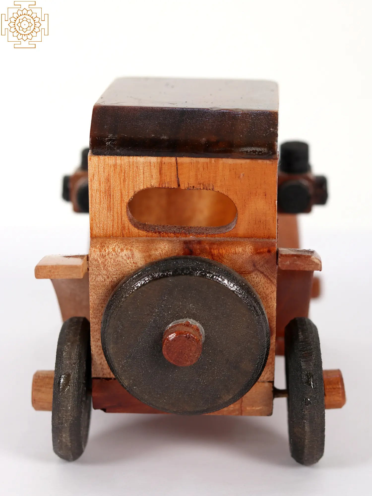 The car's wooden body is nicely polished with a lighter shade of wood, while the wheels and other pieces are painted brown to produce a dramatic impact. This toy automobile is not only suitable for children's play, but it also makes excellent table decor.