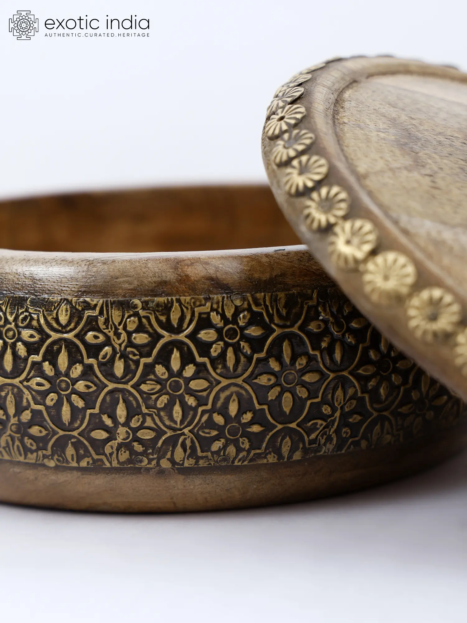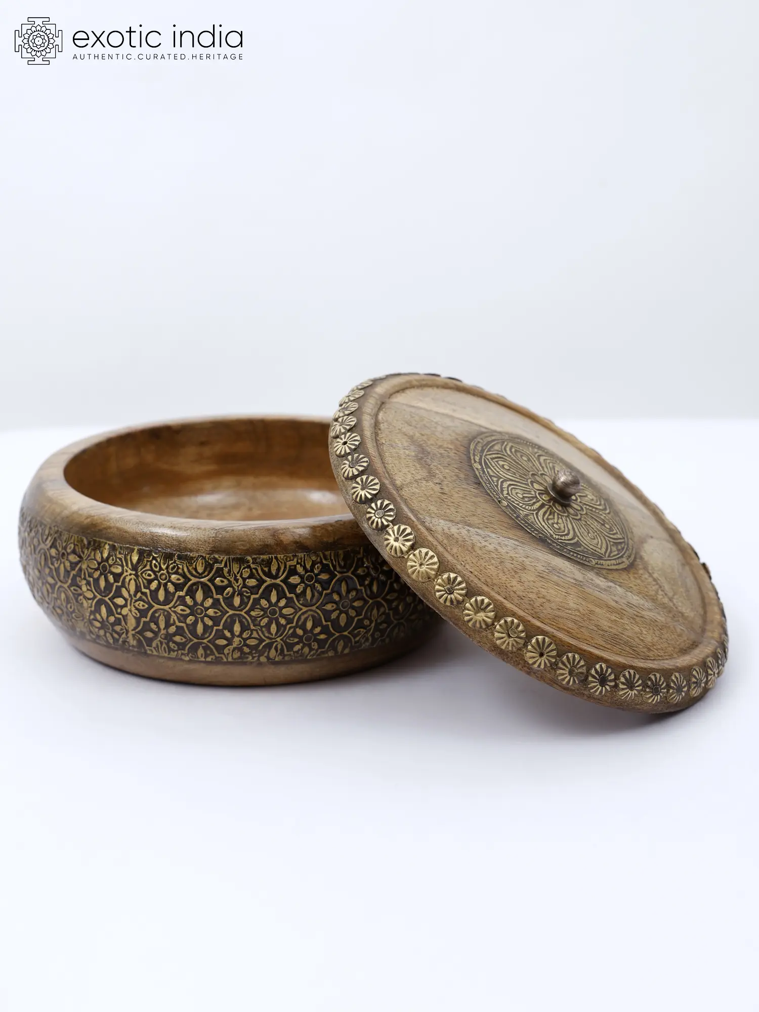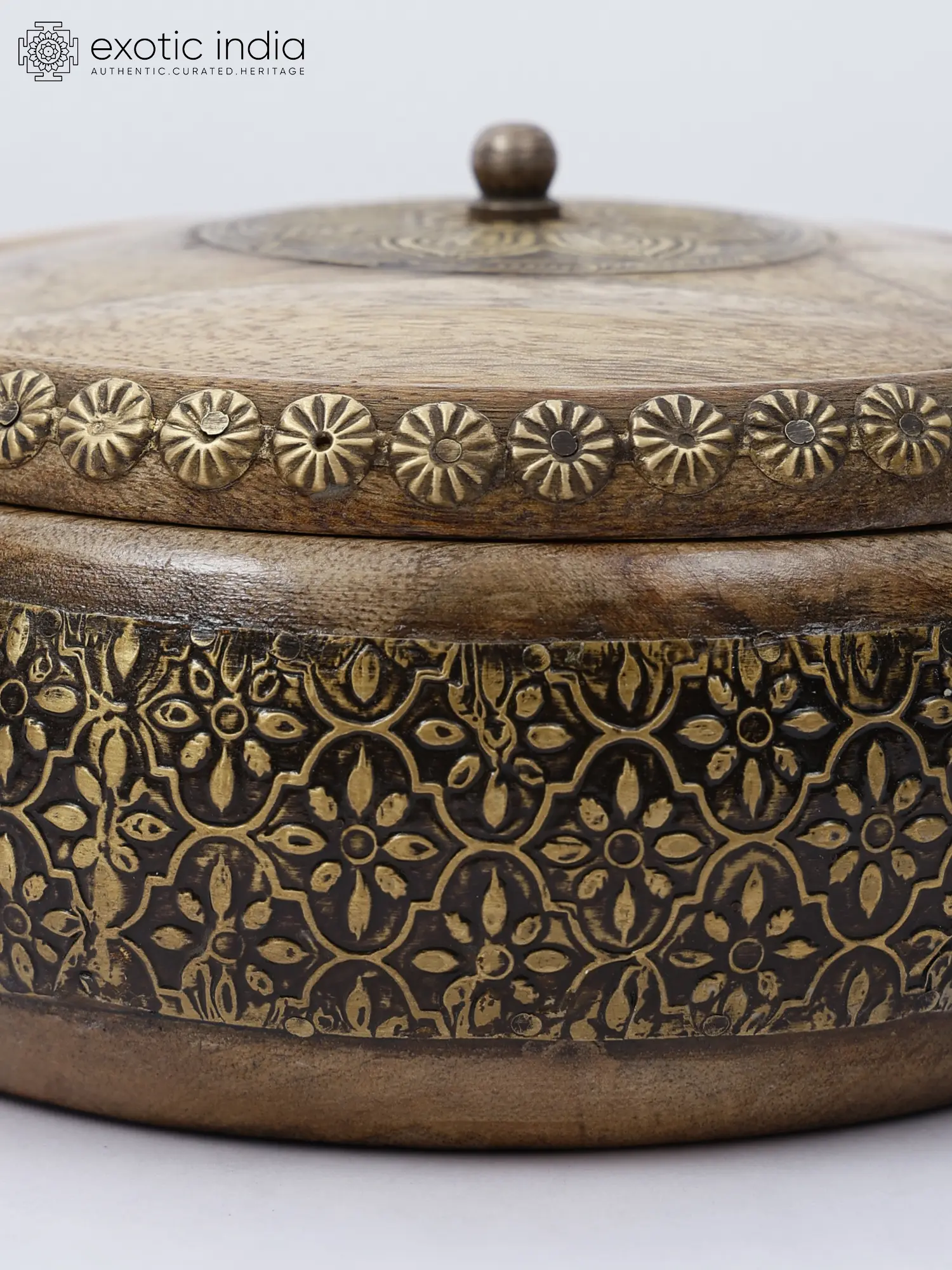 9" Wooden Chapati Box with Brass Lid and Kitchen Tong