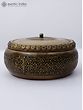 This exquisite 7-inch chapati box is more than just a container; it's a statement piece that will elevate your kitchen décor. Crafted from high-quality wood and adorned with intricate brass work, this box seamlessly blends functionality and artistry. The rich, dark wood provides a stunning backdrop for the golden brass detailing, creating a captivating visual contrast. The round shape and compact size make it perfect for storing your favorite chapatis, keeping them fresh and readily accessible. It's ideal for both everyday use and special occasions, adding a touch of sophistication to your dining experience.