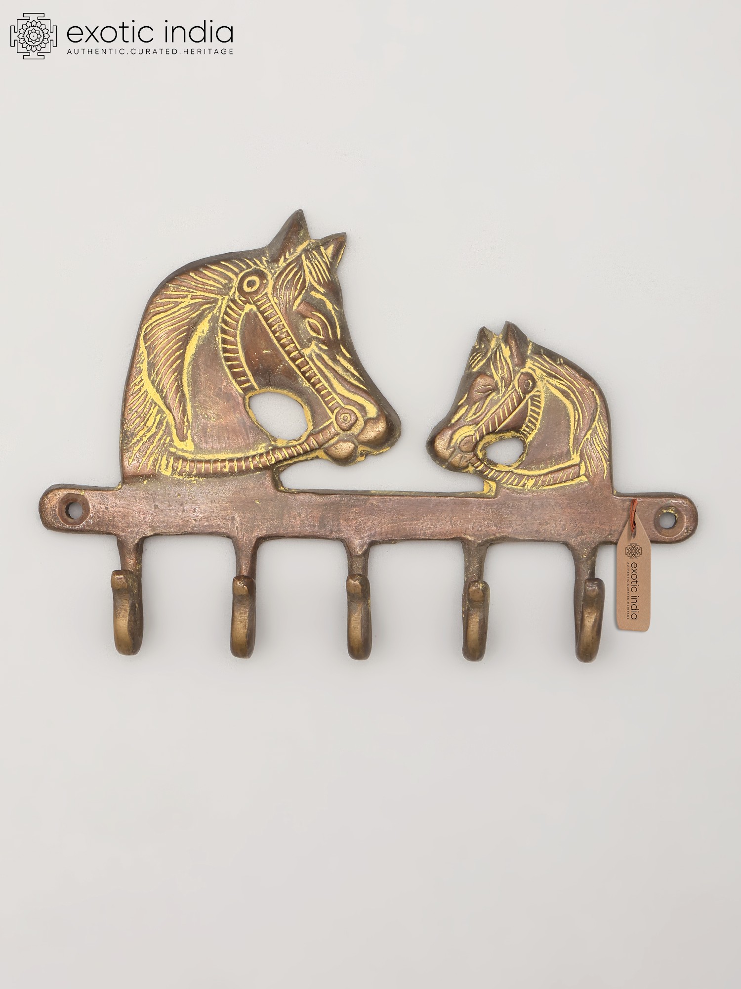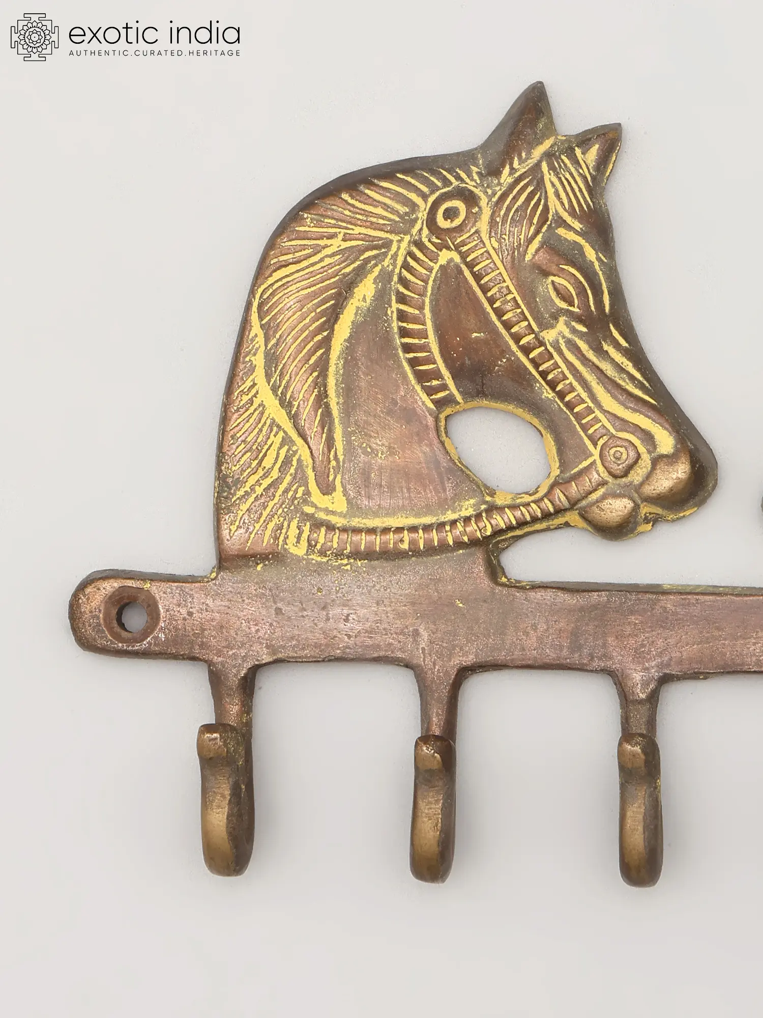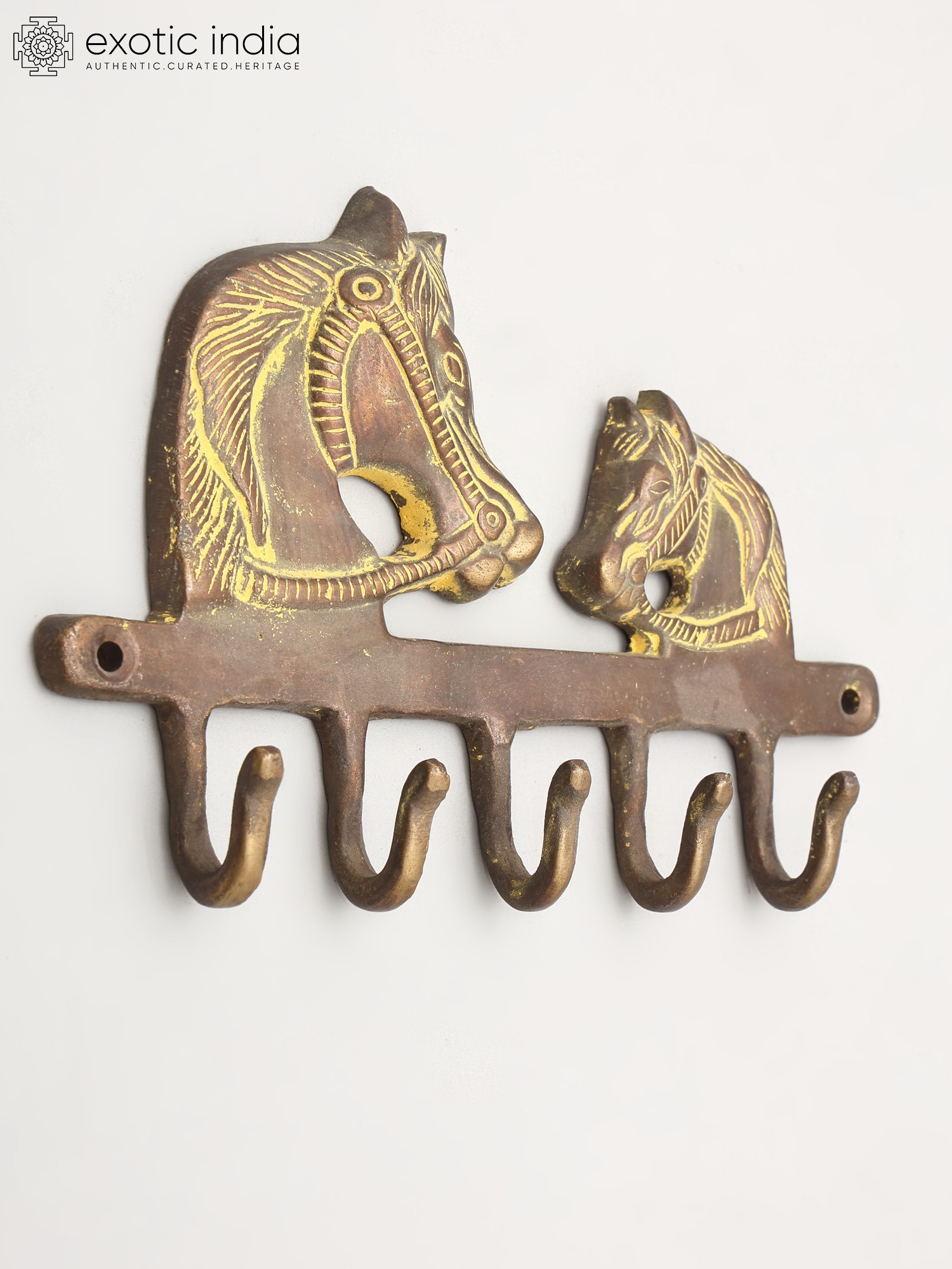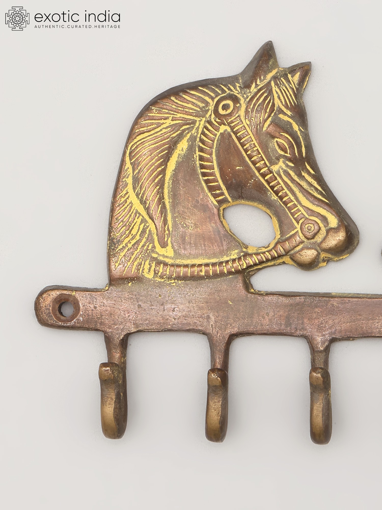 Observe the proud stance and intricate bridlework, meticulously etched into the lustrous brass surface. The seven robust hooks, subtly integrated into the base, offer ample space for your keys, scarves, or lightweight outerwear. Its seven-inch width ensures a commanding yet balanced visual presence, while its five-inch height allows it to seamlessly integrate into various wall spaces without overpowering the surrounding decor.
