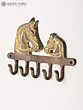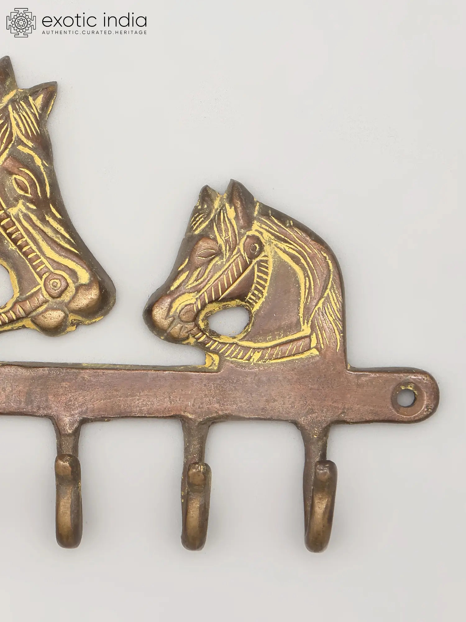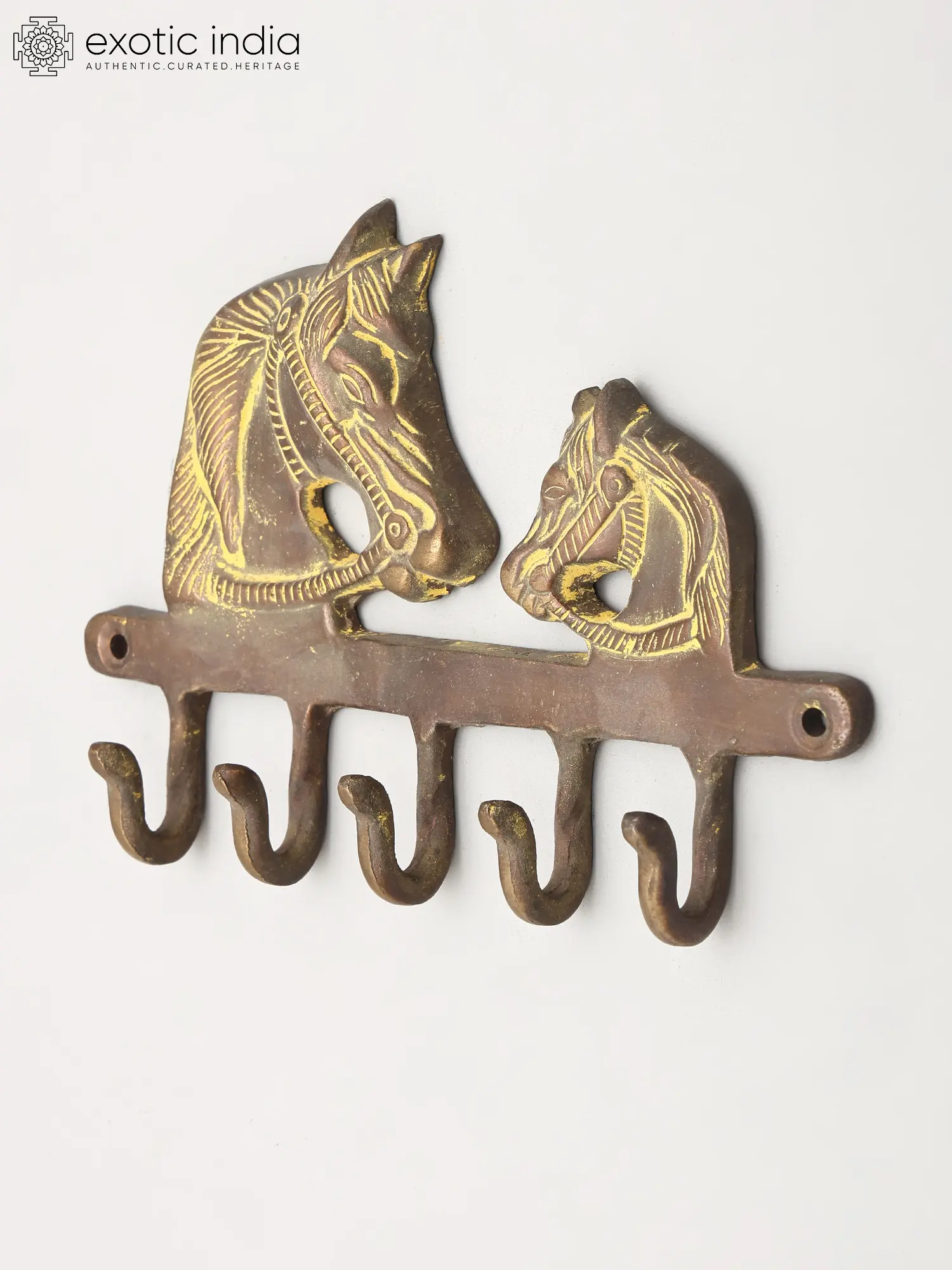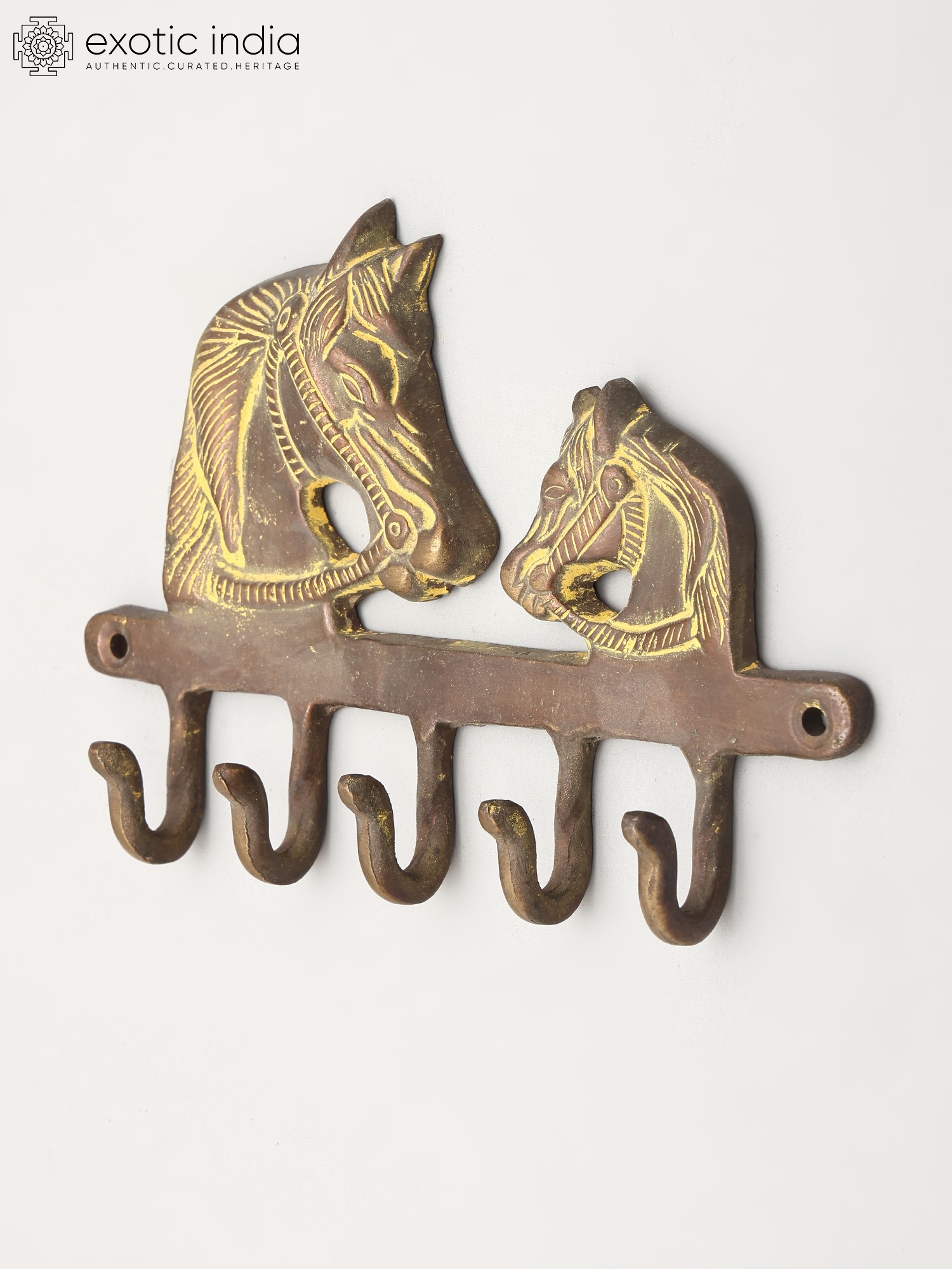 Observe the proud stance and intricate bridlework, meticulously etched into the lustrous brass surface. The seven robust hooks, subtly integrated into the base, offer ample space for your keys, scarves, or lightweight outerwear. Its seven-inch width ensures a commanding yet balanced visual presence, while its five-inch height allows it to seamlessly integrate into various wall spaces without overpowering the surrounding decor.