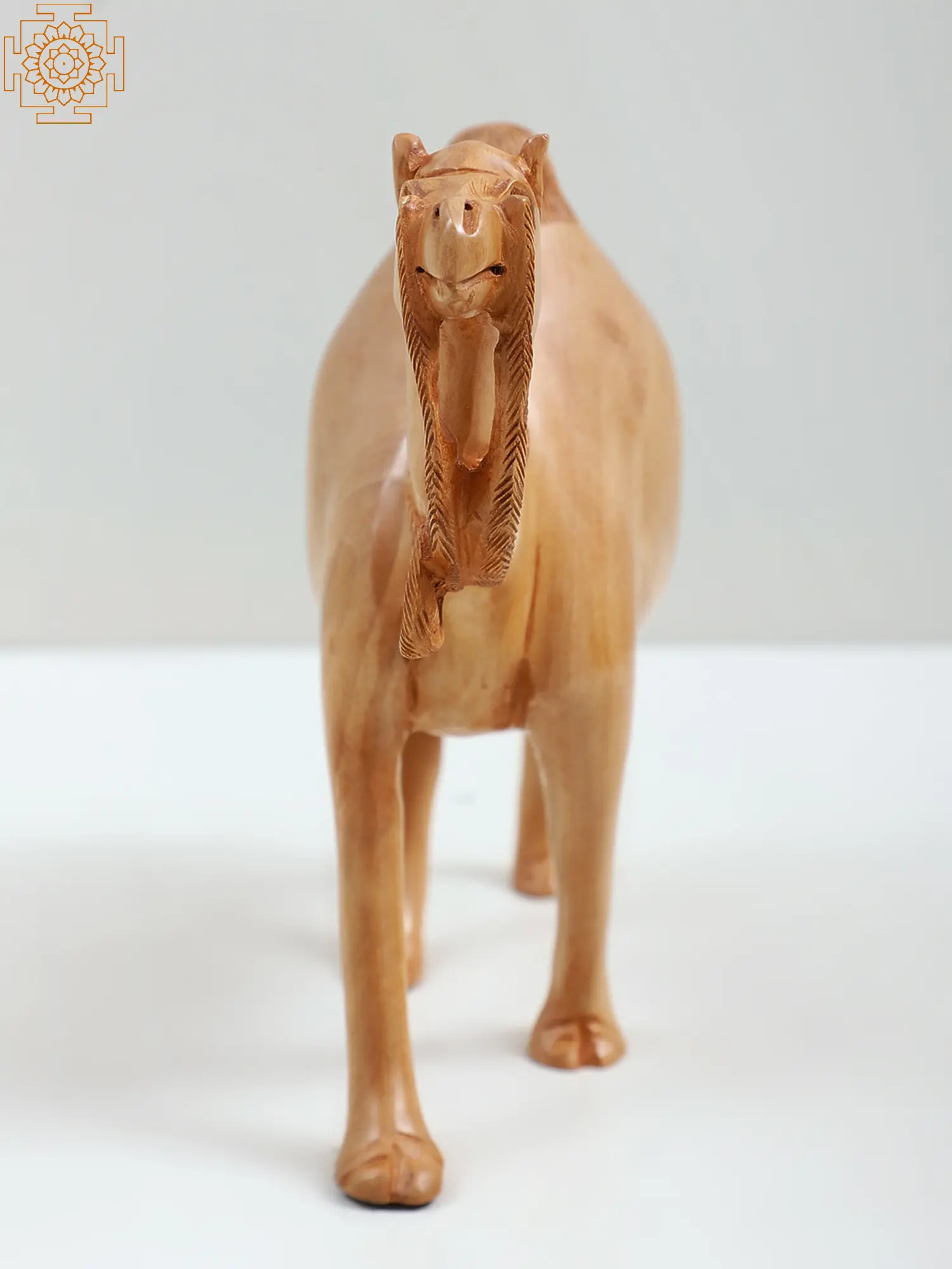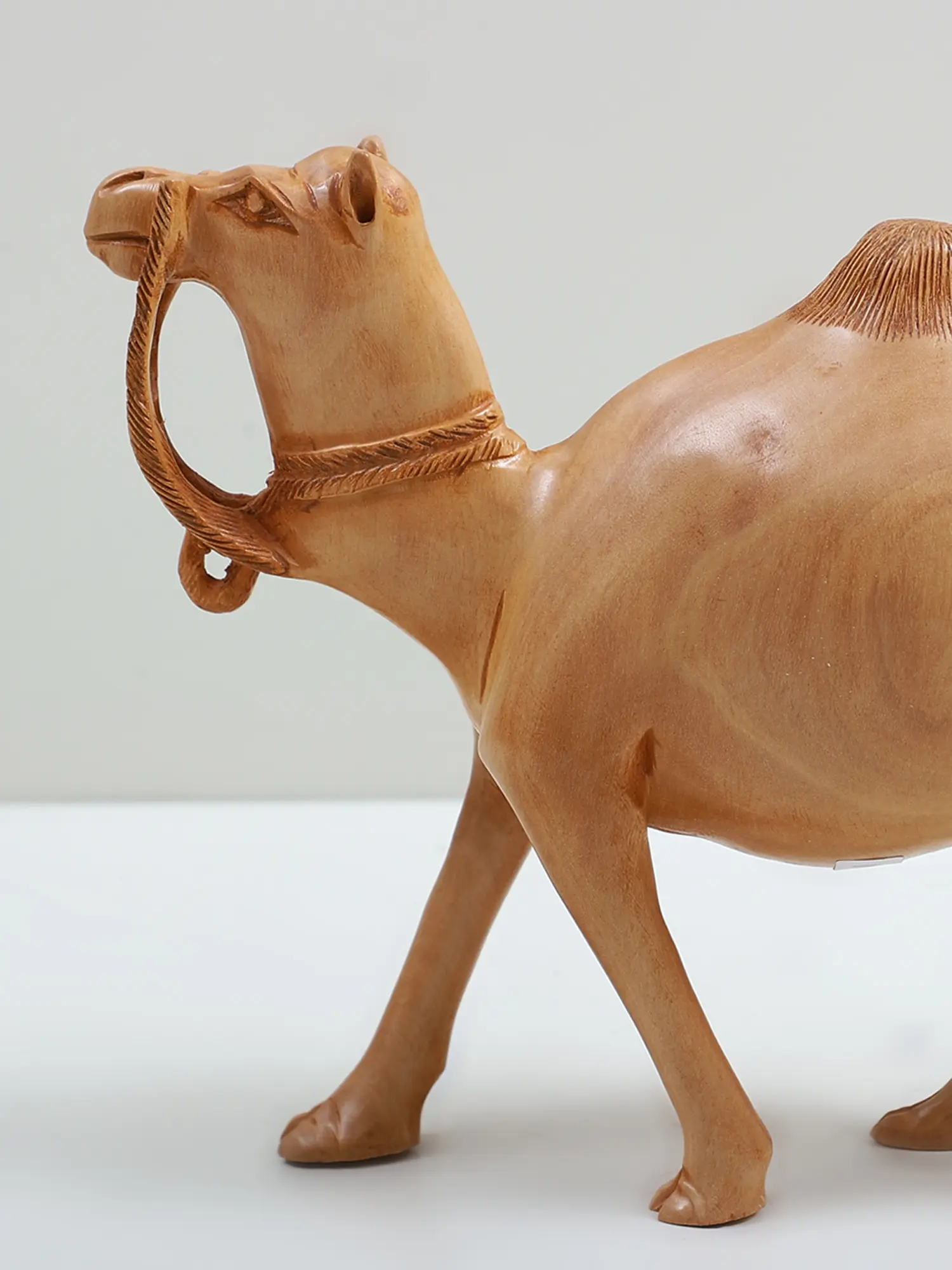 This sculpture is a stunning combination of art and culture. Handcrafted to perfection, this magnificent camel serves as a captivating decorative centerpiece, enriching any space with its elaborate detailing. The camel, which represents persistence and endurance, is the embodiment of strength and courage. Sculpted from rich wood, this showcase oozes warmth and elegance, making it a one-of-a-kind addition to your space.