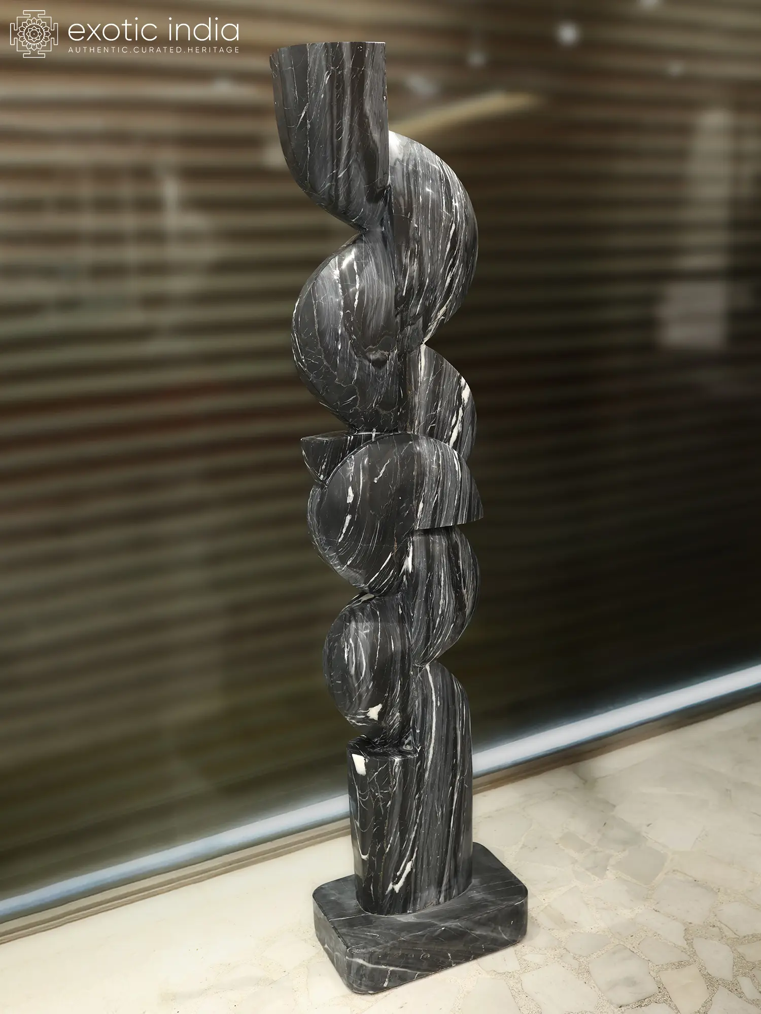 Crafted from exquisite natural marble, the sculpture showcases the stone's inherent character. The deep, rich black is dramatically intersected by veins of pure white, creating a mesmerizing visual texture that shifts and changes with every viewing angle. These natural patterns are not just decorative; they are an integral part of the artwork's narrative, echoing the title's theme of finding order and beauty within seemingly disordered elements. The smooth, polished surfaces invite touch, while the sculpted contours suggest a fluidity that belies the stone's solid nature. Each segment of the sculpture seems to flow into the next, creating an organic, almost serpentine progression that draws the eye upward.