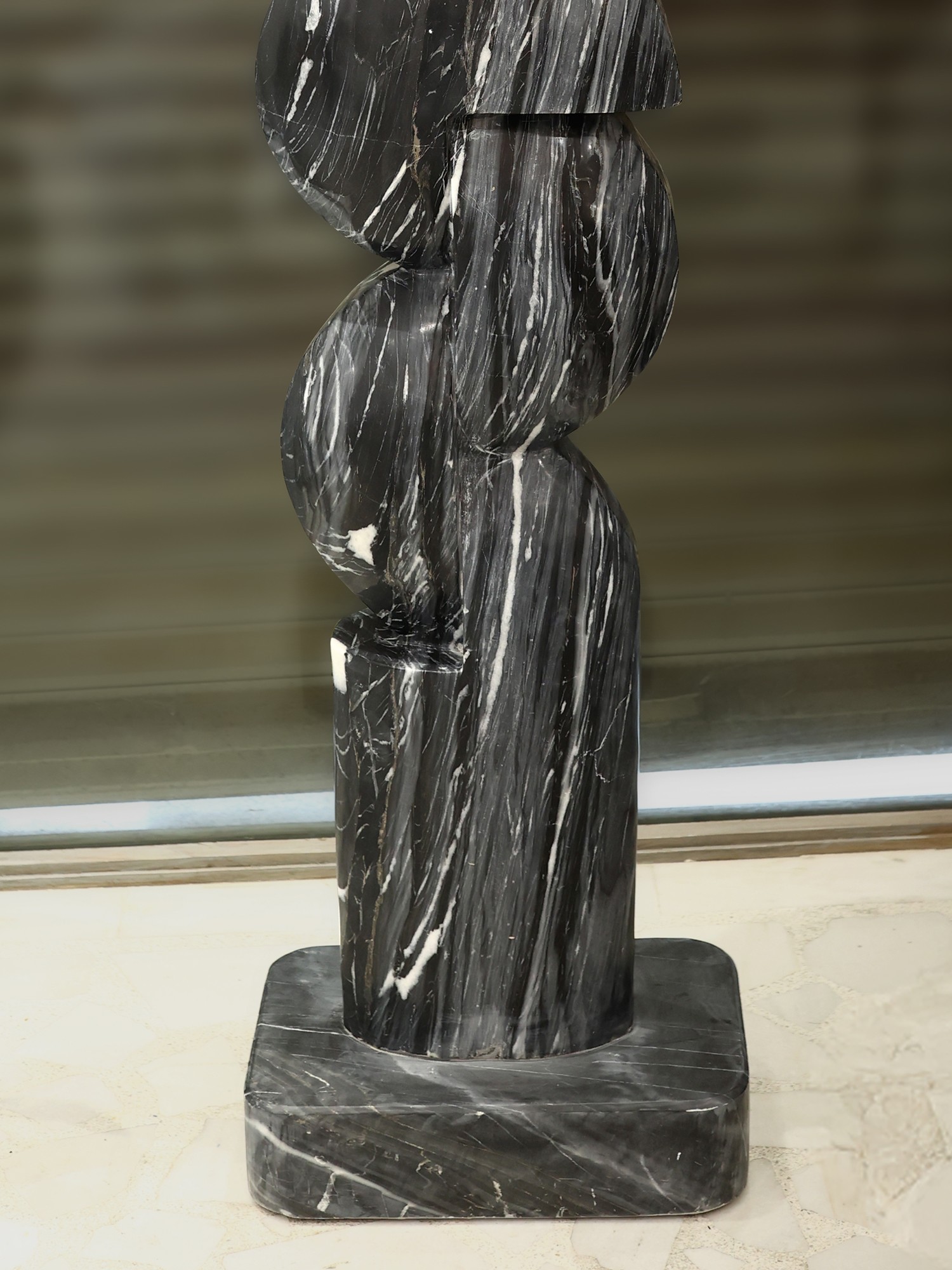 This commanding abstract sculpture, titled "Balance in Chaos," is a testament to the enduring beauty and inherent drama of natural marble. Standing tall and exuding a powerful presence, this piece transcends mere decoration to become a focal point of conversation and contemplation. The artist has masterfully carved the stone, transforming a raw, earthly material into a dynamic composition that speaks to the complexities of form and movement.